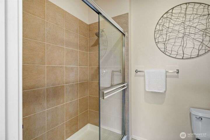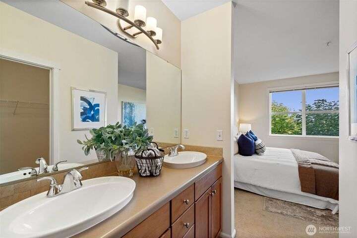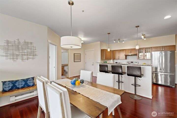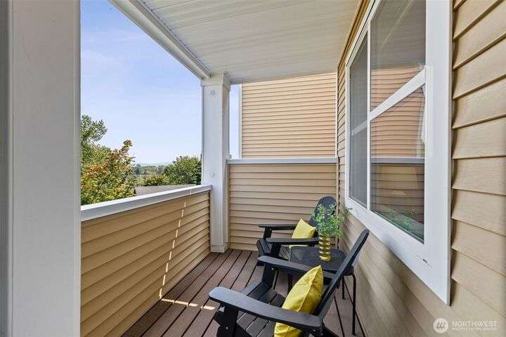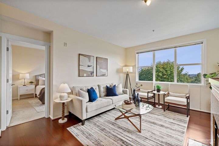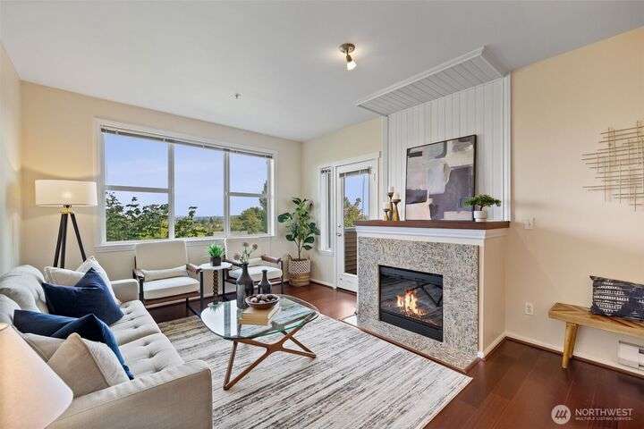 Remarkable contemporary northwest-facing condo offers an open floor plan with lovely territorial and downtown skyline views! The spacious kitchen features ample countertops, generous storage, and a bar-height peninsula perfect for casual dining or socializing. The dining room and cozy living room with a faux fireplace and direct access to an outdoor deck enhance the living experience. With two sizable bedrooms—including a primary suite that comfortably fits a king-sized bed, an en-suite bath, and a walk-in closet—this home combines comfort, style, and functionality in a desirable location. You will love the convenience of your private attached garage. Enjoy West Seattle parks, shops and restaurants, commute to city and airport are a breeze.