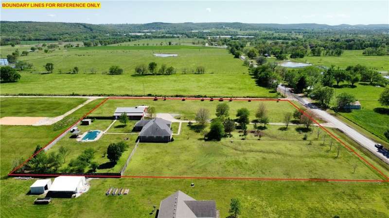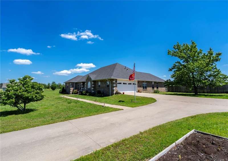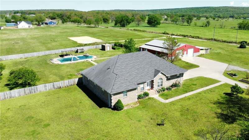 Beautiful brick home on 5.7 acres, minutes from town! Enter the estate on the concrete drive that will direct you to the shop or the home while passing by several of the trees recently planted, varieties include pecan, apple, peach, & plum. 3 bds, 3.5 ba, 3144sf-each bedroom has a bath! Large office with built-ins, a music/game room or 2nd office, additional living area or 4th bedroom. Semi-open floor plan, split bedrooms. Kitchen has granite, island workspace, gas range & double wall ovens for the cook in the family. Huge pantry with access directly from garage. Sewing room off utility. Bedrooms are oversized w/ walk in closets. Hand scraped hardwood/tile flooring. 60x60 shop w/ 2 overhead doors, 20x25 lean-to and 1200sf 1 bedroom/1bath apartment w/ utility area, LR, kitchen. In-ground saltwater pool/vinyl liner in the privacy fenced yard. Brick 10x16 storm shelter w/ electric. A short drive to everything-17 mi from U of A, 9 mi from 412/shopping/bank in Siloam Springs, 15 mi to I49. Pool-Vinyl liner-3yr/cover-1yr