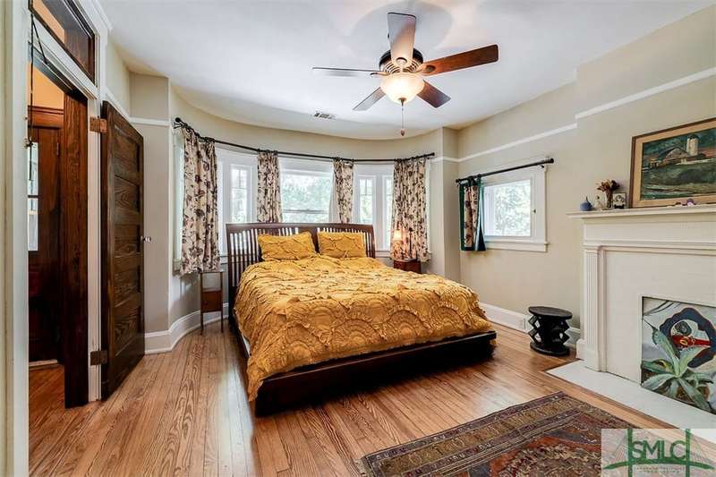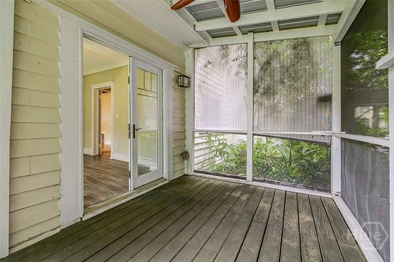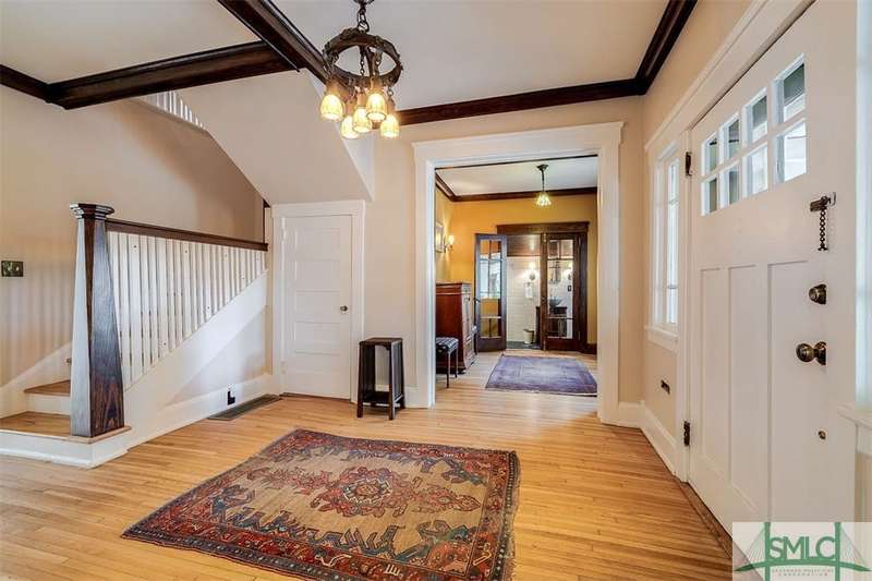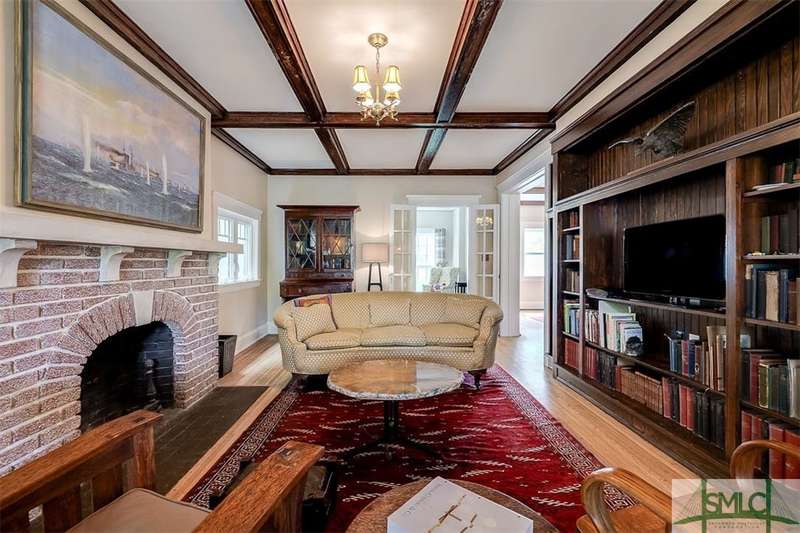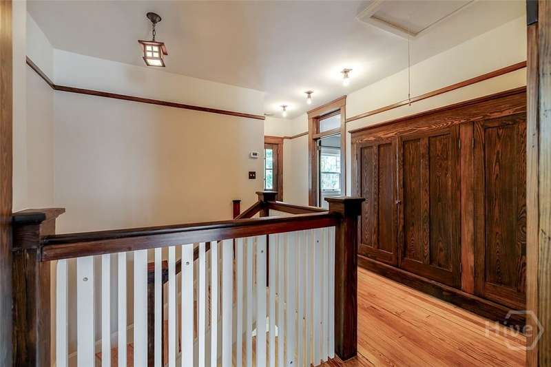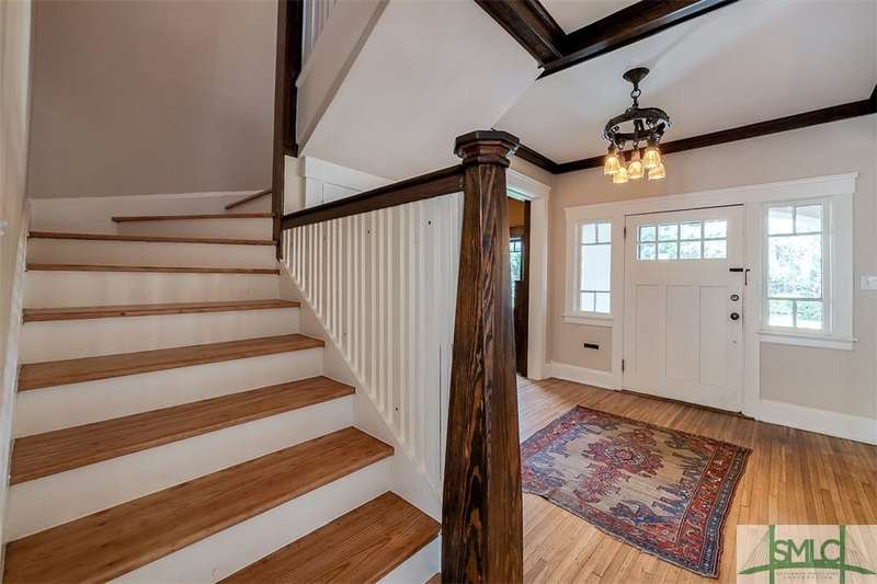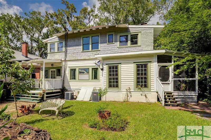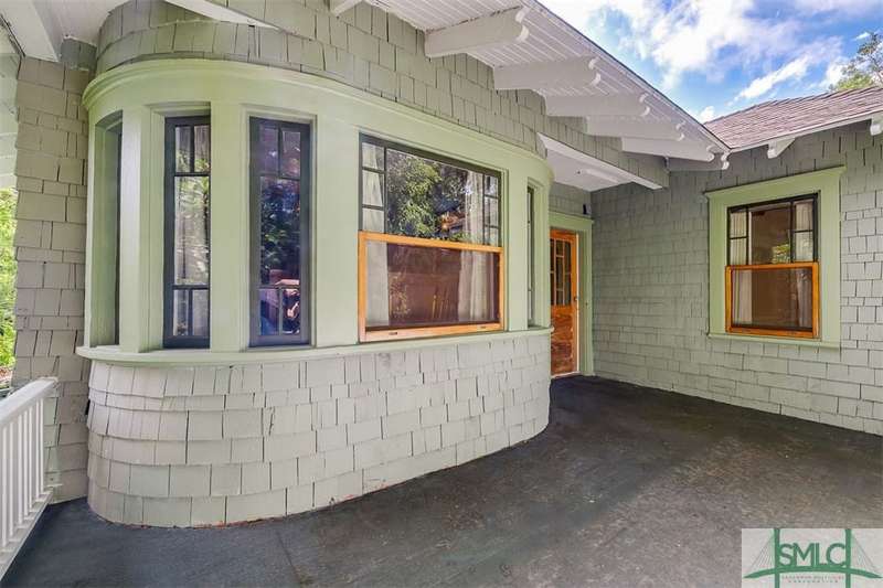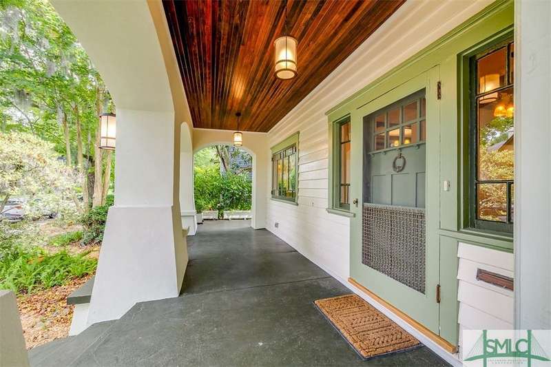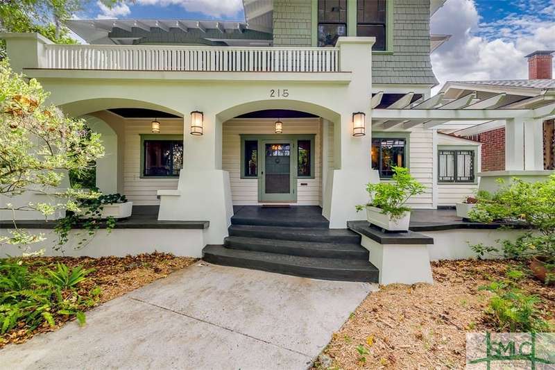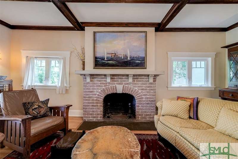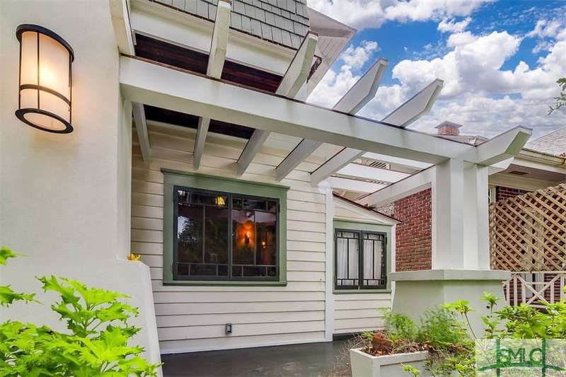 A block from Guckenheimer Park on tree-lined 45th St. this true Craftsman gem stands amidst some of the best Historic Ardsley Park homes. Featuring refinished Heart Pine woodwork, restored plaster, updated electrical & refinished Oak floors. Antique Arts & Crafts light fixtures grace the home with Quezal, Steuben & slag glass shades. A massive brick fireplace, ceiling beams & built-in bookshelves in the living room create a warm, inviting atmosphere. Two additional sitting rooms offer flexibility, and there is a new full bath with shower on the main. The kitchen has Maple cabinets & granite counters. The upstairs primary bedroom has a fireplace, an ensuite bath with a tub/shower combo, a dressing room & two closets. Two additional bedrooms feature large closets; one has a trunk room ideal for office use. The second bath is fully tiled with a tub & separate shower. A generous front porch & walk-out balcony features a new built-in copper gutter, historic railing & copper capped pergola.