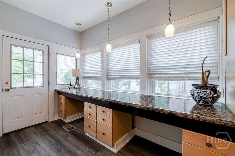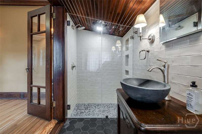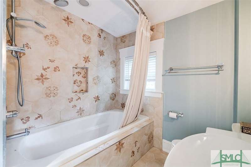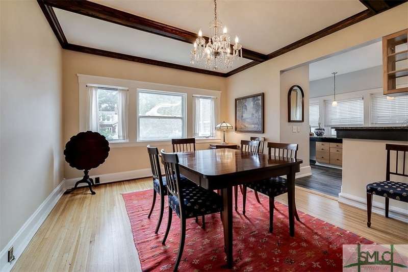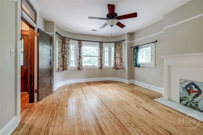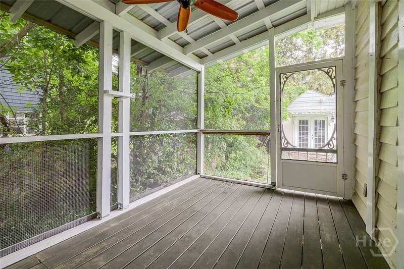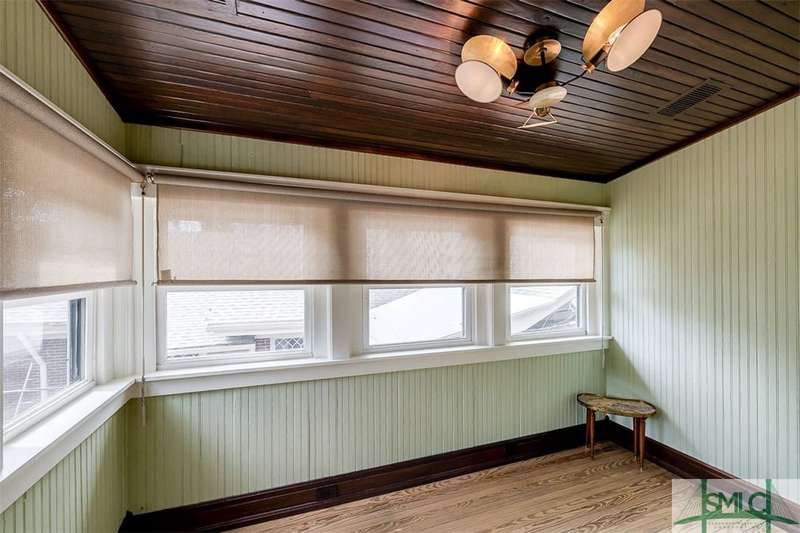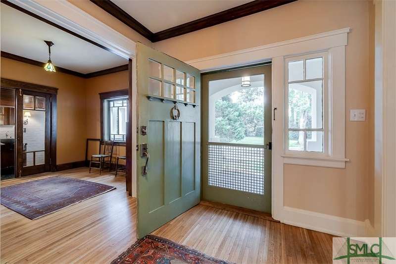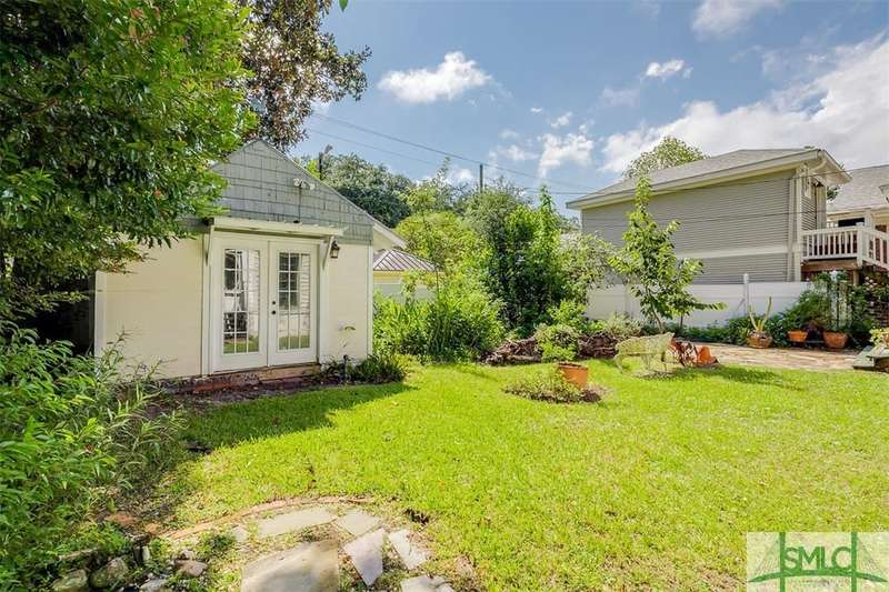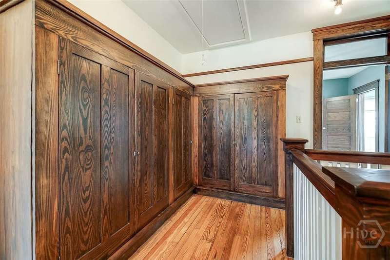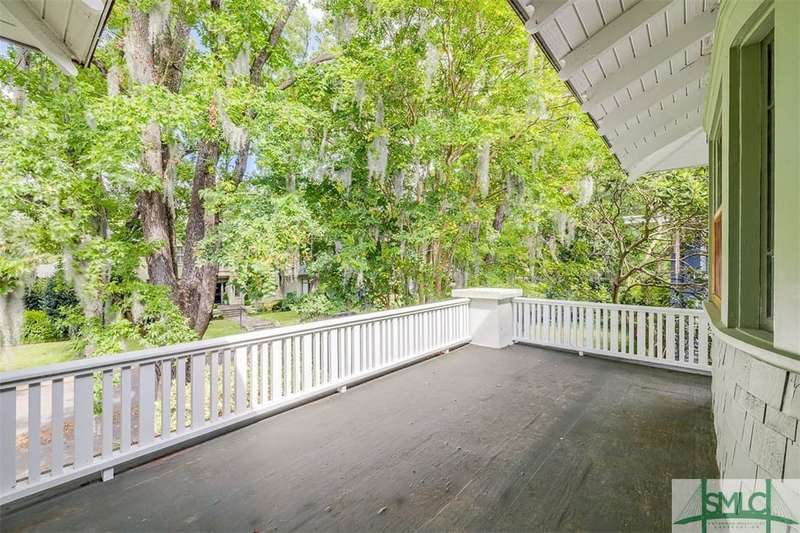 A block from Guckenheimer Park on tree-lined 45th St. this true Craftsman gem stands amidst some of the best Historic Ardsley Park homes. Featuring refinished Heart Pine woodwork, restored plaster, updated electrical & refinished Oak floors. Antique Arts & Crafts light fixtures grace the home with Quezal, Steuben & slag glass shades. A massive brick fireplace, ceiling beams & built-in bookshelves in the living room create a warm, inviting atmosphere. Two additional sitting rooms offer flexibility, and there is a new full bath with shower on the main. The kitchen has Maple cabinets & granite counters. The upstairs primary bedroom has a fireplace, an ensuite bath with a tub/shower combo, a dressing room & two closets. Two additional bedrooms feature large closets; one has a trunk room ideal for office use. The second bath is fully tiled with a tub & separate shower. A generous front porch & walk-out balcony features a new built-in copper gutter, historic railing & copper capped pergola.