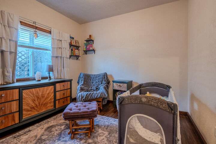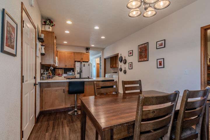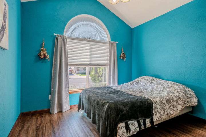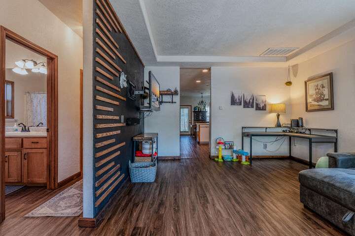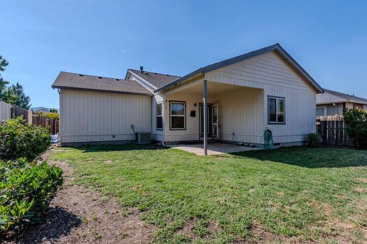The covered front porch welcomes you to this charming 3 bedroom home nestled in a quaint neighborhood. The split floor plan layout offers quiet retreats for everyone while keeping the heart of the home - kitchen and living - central. Laminate flooring throughout, vaulted and trayed ceilings. The kitchen has views to the backyard, an eating bar, all appliances and an adjoining dinning area. Spacious primary bedroom with adjoining bath that features double vanity, jetted tub, shower and walk in closet. Fenced backyard, timed sprinklers and a covered patio make it a great area for outdoor entertaining. The neighborhood also offers a city park with a playground. Sellers current VA loan has an interest rate of 3.15% and is assumable for a veteran using their entitlement benefits.