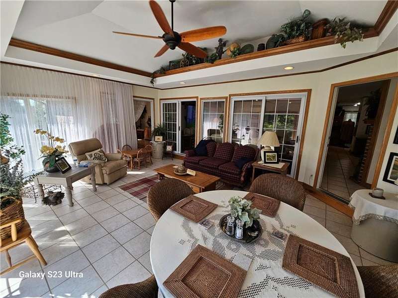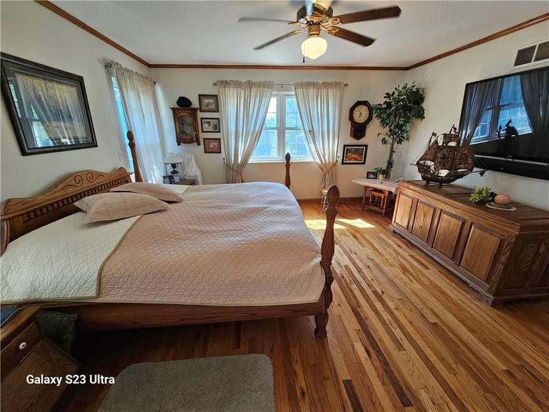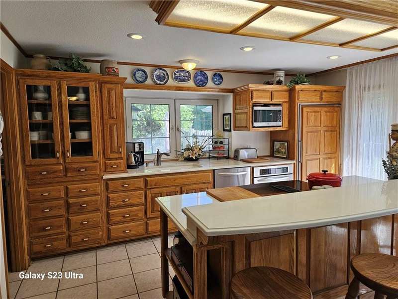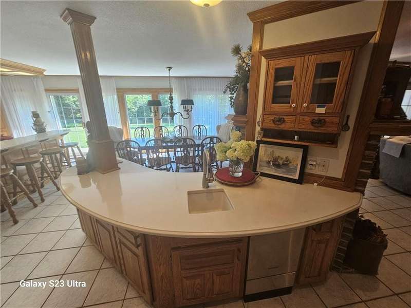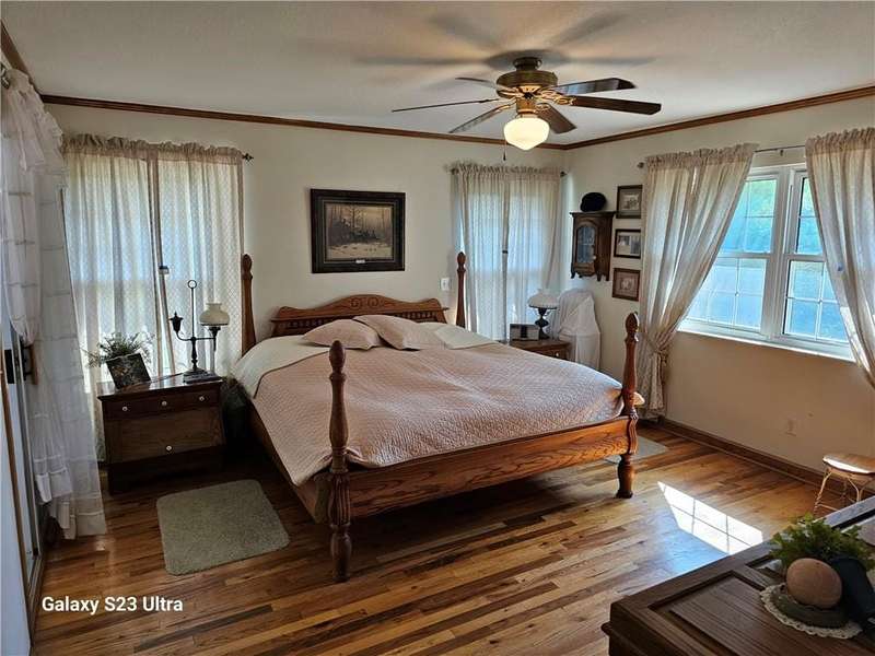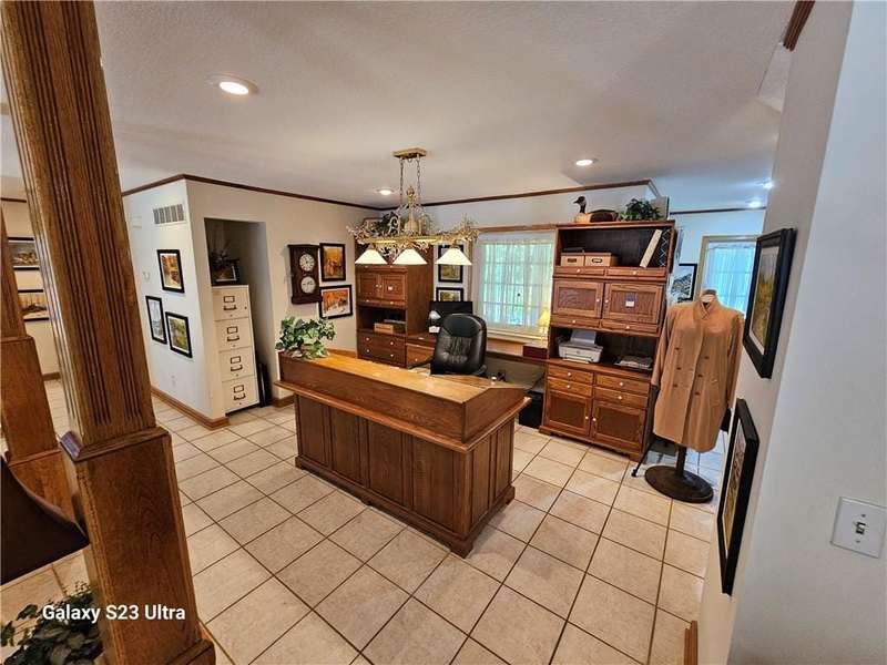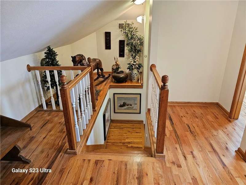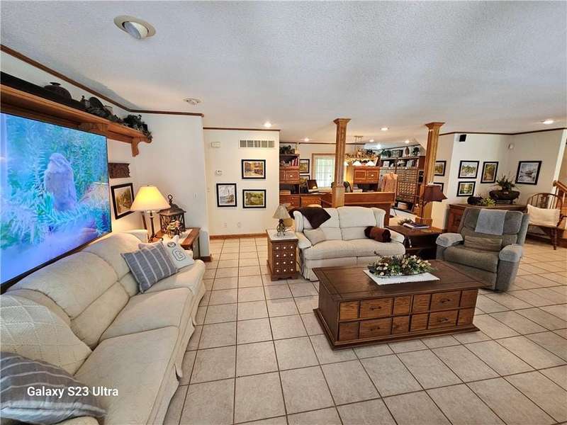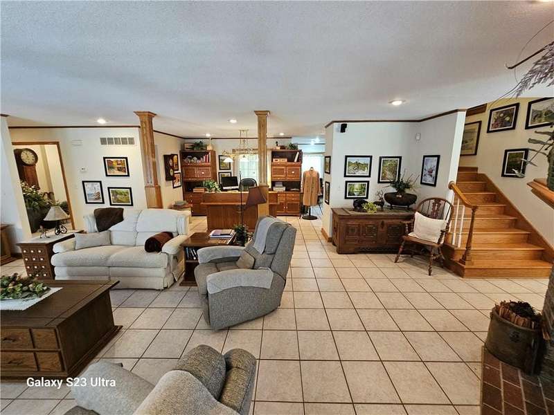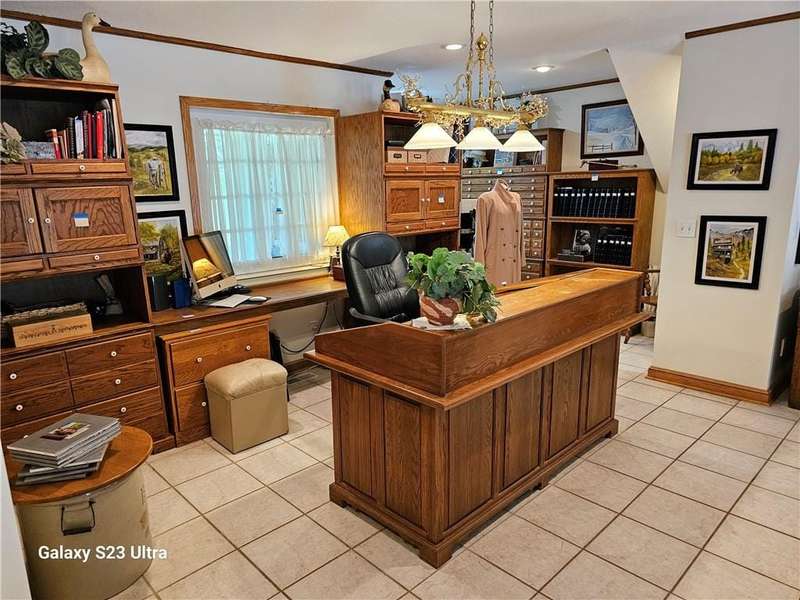 All custom brick 1.5 Story home on picturesque 4.5 acre lot. Large concrete driveway with plenty of parking for multiple cars. A 2 car garage with immediate access to the kitchen and laundry room. Large open kitchen with all custom built cabinets. Giant island with breakfast bar. Double drawer dishwasher, SubZero refrigerator, quartz countertops, microwave and smooth top range. Lots of light from sliding glass door entry. The kitchen looks into a massive dining area with buffet counter top. A built in ice machine is handy for those hot days. A see through hearth/fireplace has a wood burning stove which can heat the entire home. Large living room with a wall of sliding glass doors. And office area is off the LR area or it could be used as a craft area or whatever you need. Tile floors through out these areas. The Sunroom is just outside the LR and has a vaulted ceiling with space above to put flowers, art or personal nick nacks. The master bedroom has hardwood floors and a ceiling fan. The master bath has a double vanity with jetted tub, shower and walkin closet. Upstairs you will find 2 bedrooms with skylights that also open to allow for fire escape. The basement has a large room with kitchenette that could be used as non-conforming bedroom, game room, family room or however you need. There is a full bathroom in the basement as well. There is another large garage in the basement that has lines in place for air tools if you like. The large 40x60 shed/workshop has 100 amp service with concrete floor and a room upstairs for office or more storage. There a large portions of the acreage that have electricity and water running to different areas. Ask for more details. An extra wide bridge spans the creek to get to the back side of the acreage.