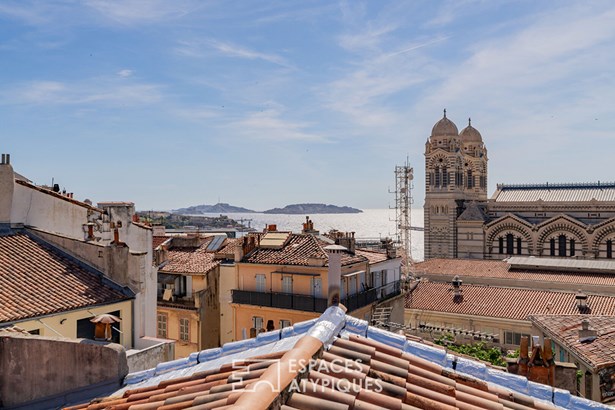 The bright and soothing living room opens onto an open-air terrace. An intimate outdoor space, where you can take your time, a book in hand, a coffee in the sun, facing the majestic silhouette of the Major Cathedral. Added to this is a rare privilege: a rooftop accessible by right of use, perched at the very top, like a discreet promontory. From there, Marseille unfolds-the rooftops of Le Panier, the Major below, and the Mediterranean as a backdrop.