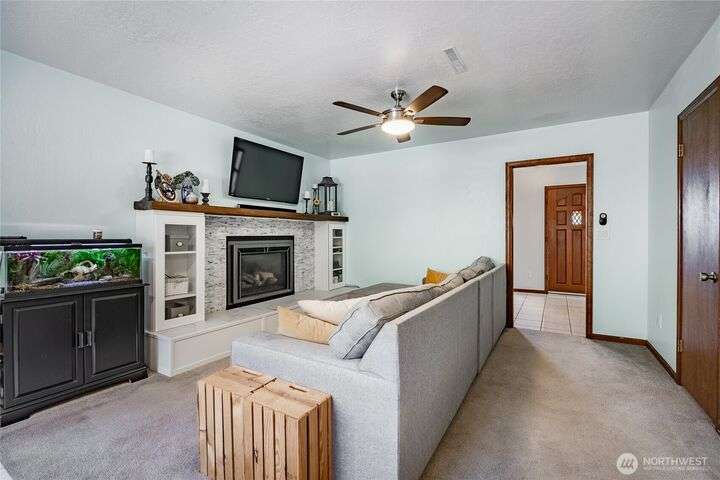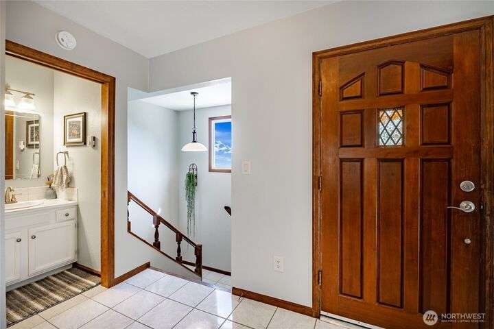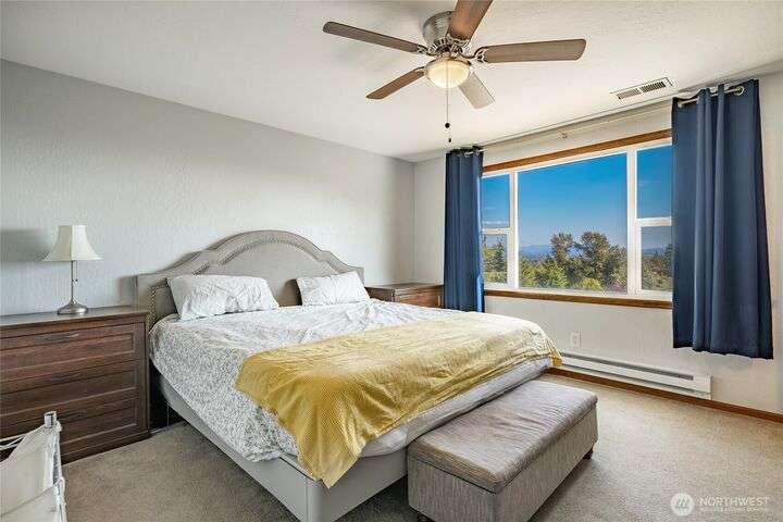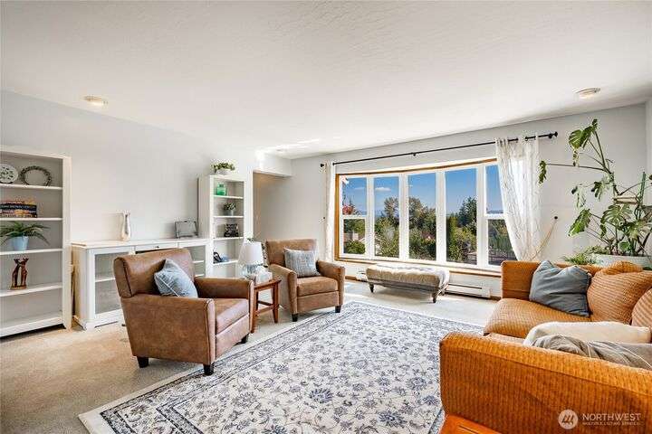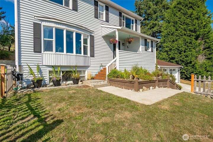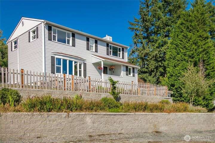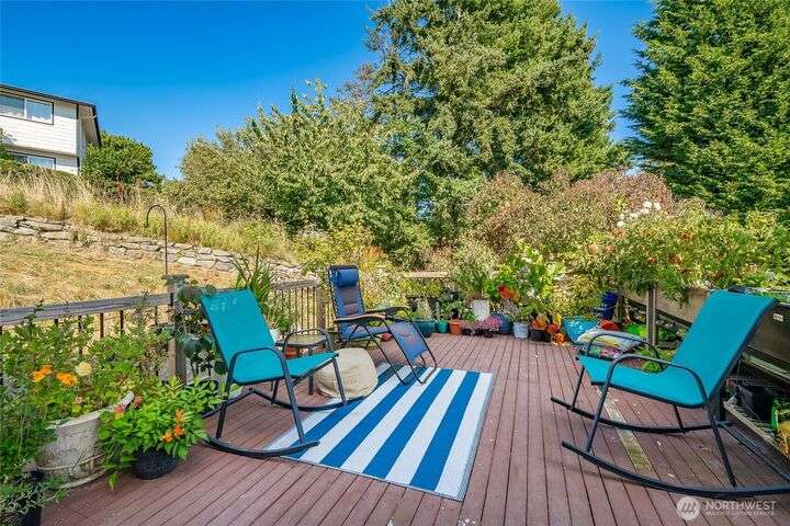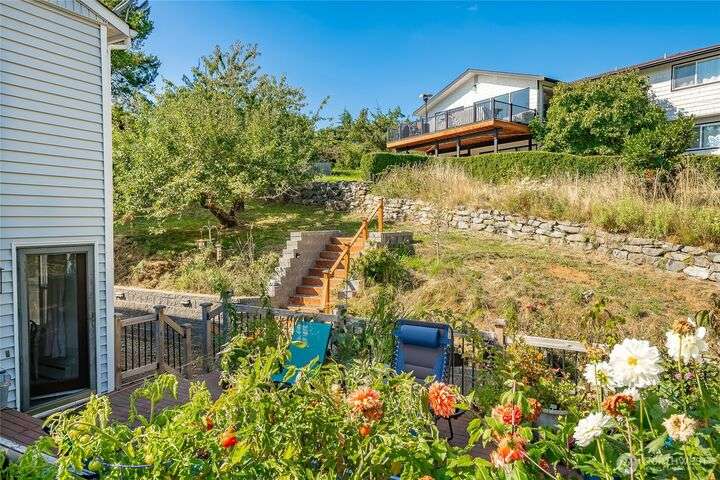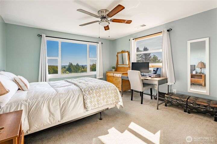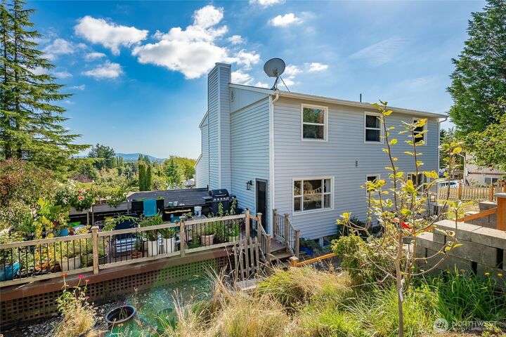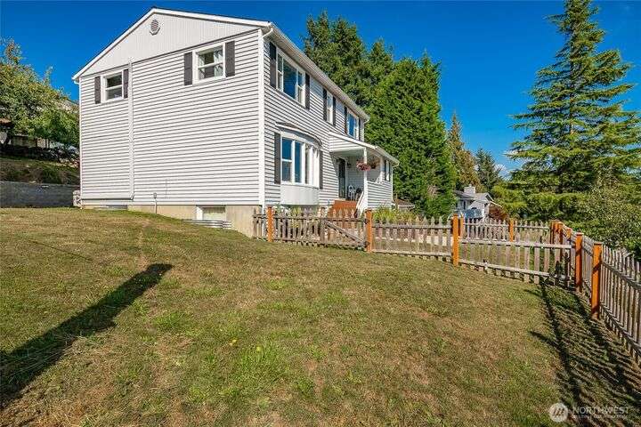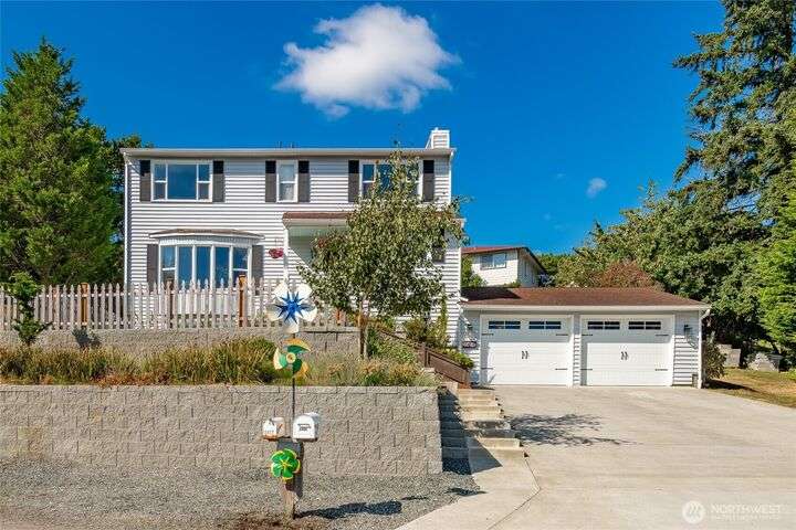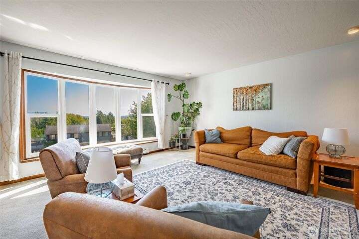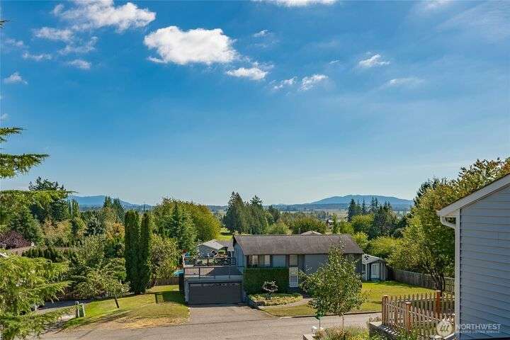 Wake up to breathtaking views of Galbraith Mt, Ferndale Valley, and the San Juan Islands from this spacious 5+ bedroom home! The main living room, rooftop deck, and primary suite all showcase stunning vistas. The finished 1,128 SF basement w/full bath and MIL plumbing offers flexible space for guests, office, or studio. Enjoy over a 1/4 acre w/ fruit trees, garden beds & room to entertain. The primary suite features an updated ensuite & walk-in closet. Updates include a partially remodeled kitchen w/ new range/oven, hood vent & countertops, ductless A/C & heat, efficient gas FP insert, new concrete driveway & stairs, engineered retaining walls, improved drainage, leveled yard & refreshed landscaping. Close to schools, shopping, parks & I-5.