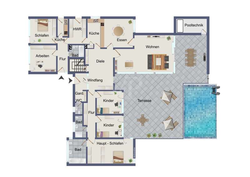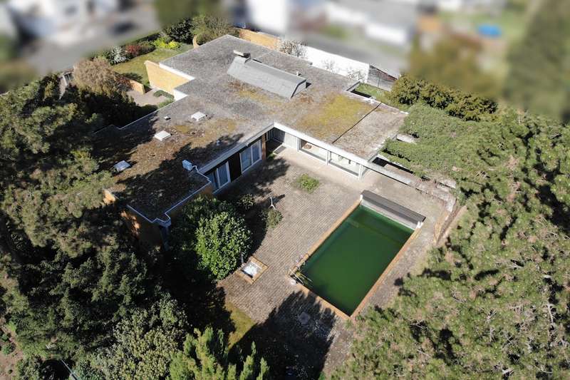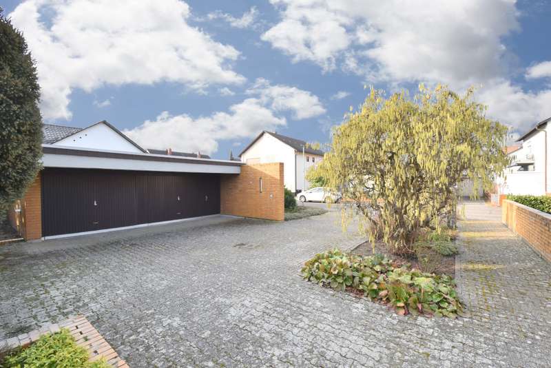 This flat-roofed bungalow in Dannstadt offers you a rare opportunity. Solidly built in 1967, this property with 9 rooms spread over approx. 338m² of living space has everything you need to fulfill your personal dream home. You enter your new home through a vestibule, past the separate checkroom and into the impressive hallway, which leads you to all areas of the house. The heart of the home is the spacious living room: floor-to-ceiling windows all around open up views of the garden and flood the room with light. Adjacent is the dining room with direct access to the kitchen. The two rooms are not separated by a wall, but by the kitchen wall unit, so it would be easy to open them up. An adjacent utility room offers storage space and room for the laundry room. The sleeping area has two children's bedrooms with a shower room. The master bedroom with dressing room and en suite bathroom creates a retreat to relax and unwind. Another special feature is the granny apartment, equipped with two rooms, kitchen and bathroom. There is a separate entrance to the house, but the apartment is also directly connected to the main house via the utility room. The bungalow has a partial basement, two rooms are fully converted and can be used as a bedroom/hobby room or to set up a home office according to your needs thanks to large strip lighting. The outdoor areas have been lovingly landscaped and maintained over the years. Trees, shrubs and lawns make the hearts of amateur gardeners and playing children beat faster. On the large terrace with pool, you can end the day on balmy summer evenings and spend time with family and friends. The oil heating was installed in 1997 and the burner was replaced around 2017. The rest of the building services date from the year of construction. An alarm system is installed and ensures the security of your property. You will find parking space for your vehicles in the spacious double garage and the driveway of the house.
