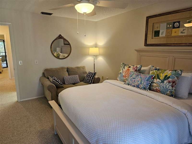 Welcome to your peaceful escape in Wild Oak Bay! This fully furnished, end-unit residence offers two bedrooms and two baths on the second floor-accessible by stairs only to ensure maximum privacy and tranquility. Step inside to an open living and dining area, where abundant natural light and comfortable seating create an ideal spot for relaxing or entertaining. The adjacent kitchen is exceptionally well-appointed, with everything you need to whip up a quick breakfast or host a dinner party. Just off the main living space, the air-conditioned Florida room overlooks the pond, heated pool, and hot tub. Whether you're savouring your morning coffee or winding down with a book at sunset, this serene sunroom feels like an extension of your living area. Practical touches abound, including a discreet laundry closet tucked into the kitchen for easy upkeep. When it's time to retire, you'll find two comfortable retreats: Primary Suite: King-size bed, a walk-in closet, and direct access to the Florida room. The en-suite bathroom features a spacious walk-in shower and plenty of storage. Guest Bedroom: Queen-size bed, thoughtfully furnished for comfort, with a nearby full bath boasting a tub/shower combination. Located just minutes from IMG Academy, the State College of Florida, shopping and dining, and our stunning Gulf Coast beaches, this home blends convenience with a laid-back Florida lifestyle. Book your stay today and experience Wild Oak Bay living at its finest!