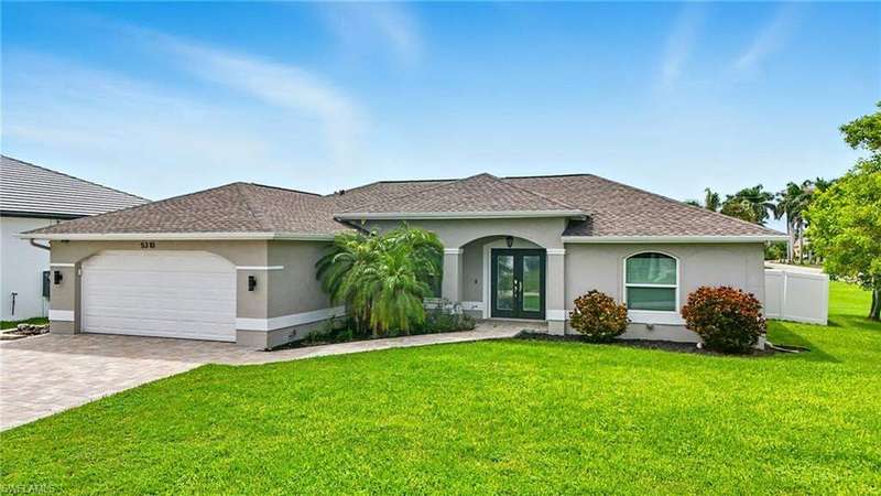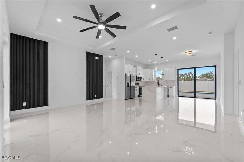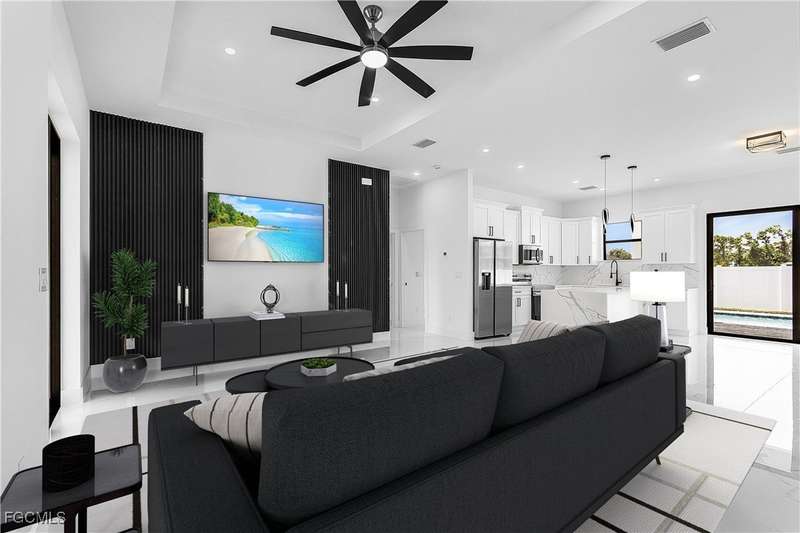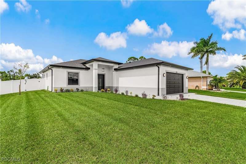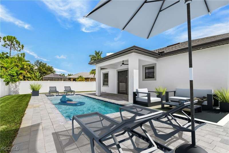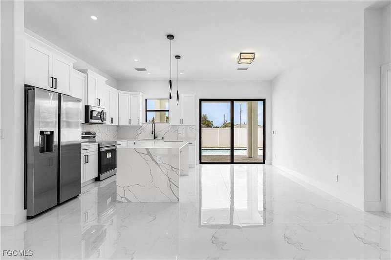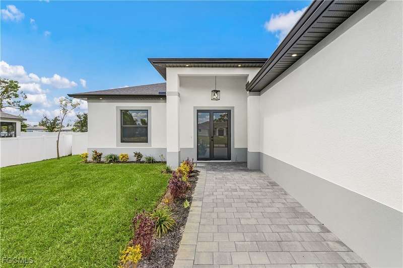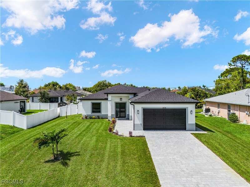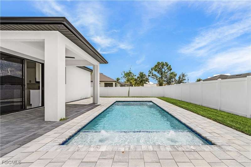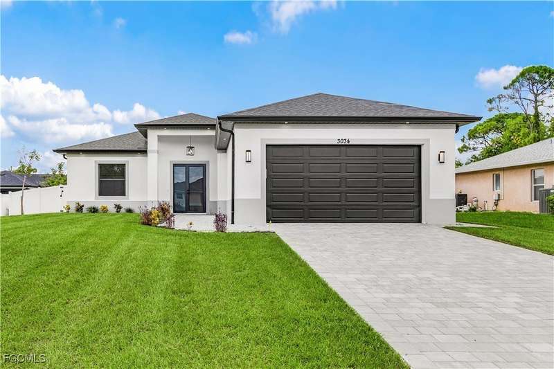 Welcome to 3034 NW 16th Place! Step into a home that balances bold design with everyday function in Cape Coral's rapidly growing Northwest corridor, offering 4 bedrooms, 2 bathrooms, and a sparkling pool on a fully landscaped homesite. From the exterior you'll notice clean architectural lines accented by pavered drive and lanai, fresh sod, 360-degree gutters, a full irrigation system, and custom LED lighting that makes the home glow after sunset, while the fenced backyard adds privacy and security. Inside, the layout is open yet defined, with ceilings climbing from 10 feet in the bedrooms to 12 and 13 feet in the living room, creating an airy volume rarely found in this price point. Impact windows and doors, R30 insulation, and epoxy-coated garage floors speak to durability and efficiency, while thoughtful finishes give the home a polished edge. The kitchen showcases quartz counters with a striking waterfall edge, stainless steel appliances, backsplash accents, soft-close cabinetry, custom closet-style storage, and a walk-in pantry that anchors the space, while the adjacent living room features a custom accent wall that elevates the feel from simple to standout. The primary suite delivers a private retreat with dual walk-in closets designed for organization, a glass-enclosed shower and dual vanity, while the remaining bedrooms are well-scaled, each with ceiling fans and natural light. Tile floors throughout make for seamless flow and easy upkeep. Outdoor living is effortless here: the pool and lanai invite year-round enjoyment, framed by pavers and designed for both gatherings and quiet relaxation. Every detail has been considered, from custom LED lighting inside and out, to closet shelving and storage systems, to the irrigation that keeps the landscape fresh and vibrant. Located near boat ramps, Pine Island Road, shopping, dining, and just a short drive to airports and Gulf access, this home offers both immediate comfort and future value in one of Cape Coral's most active growth areas. 3034 NW 16th Place is not just another new build-it's a property that combines practical upgrades with modern style, ready for its first chapter. Schedule your showing today.