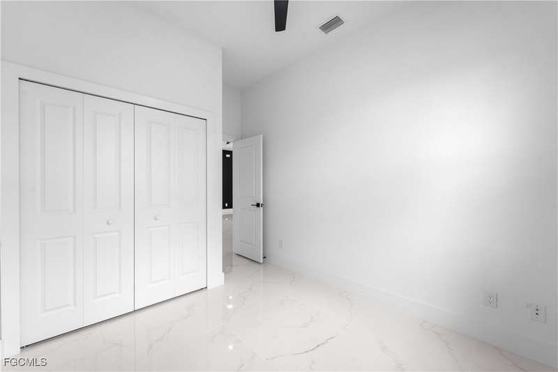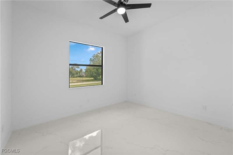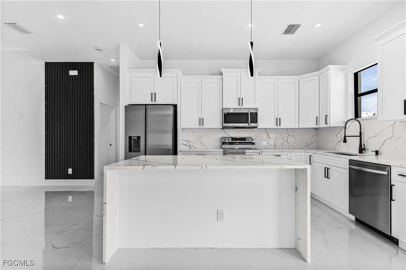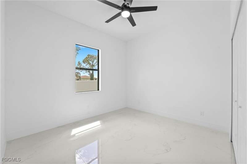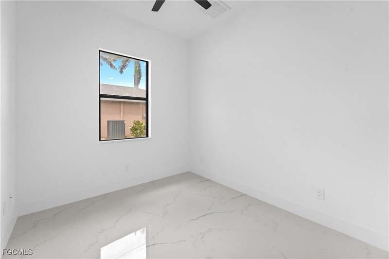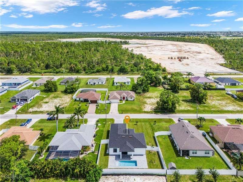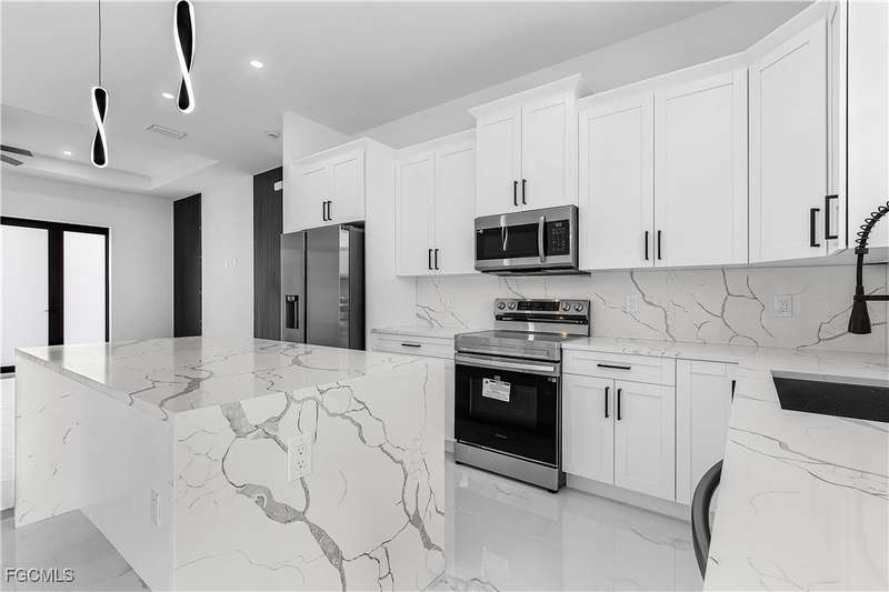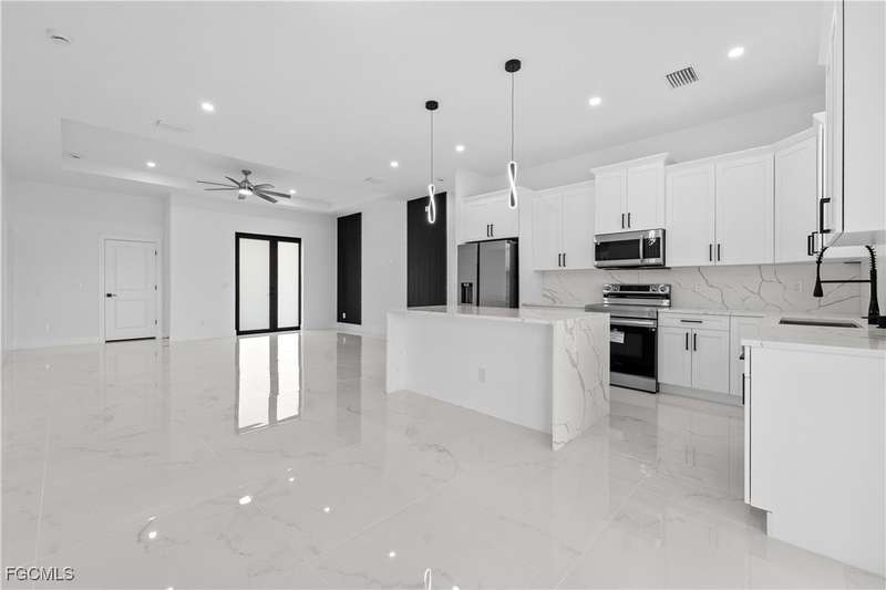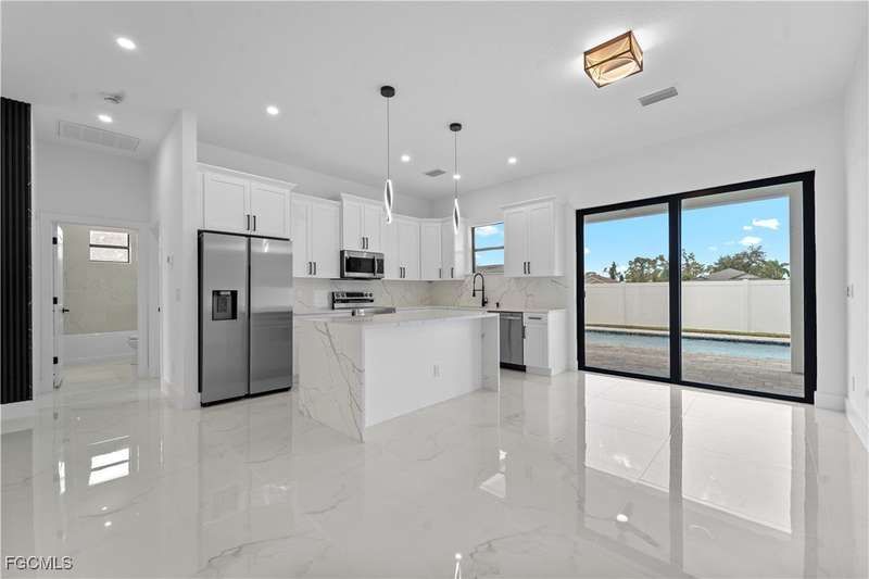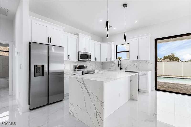 Welcome to 3034 NW 16th Place! Step into a home that balances bold design with everyday function in Cape Coral's rapidly growing Northwest corridor, offering 4 bedrooms, 2 bathrooms, and a sparkling pool on a fully landscaped homesite. From the exterior you'll notice clean architectural lines accented by pavered drive and lanai, fresh sod, 360-degree gutters, a full irrigation system, and custom LED lighting that makes the home glow after sunset, while the fenced backyard adds privacy and security. Inside, the layout is open yet defined, with ceilings climbing from 10 feet in the bedrooms to 12 and 13 feet in the living room, creating an airy volume rarely found in this price point. Impact windows and doors, R30 insulation, and epoxy-coated garage floors speak to durability and efficiency, while thoughtful finishes give the home a polished edge. The kitchen showcases quartz counters with a striking waterfall edge, stainless steel appliances, backsplash accents, soft-close cabinetry, custom closet-style storage, and a walk-in pantry that anchors the space, while the adjacent living room features a custom accent wall that elevates the feel from simple to standout. The primary suite delivers a private retreat with dual walk-in closets designed for organization, a glass-enclosed shower and dual vanity, while the remaining bedrooms are well-scaled, each with ceiling fans and natural light. Tile floors throughout make for seamless flow and easy upkeep. Outdoor living is effortless here: the pool and lanai invite year-round enjoyment, framed by pavers and designed for both gatherings and quiet relaxation. Every detail has been considered, from custom LED lighting inside and out, to closet shelving and storage systems, to the irrigation that keeps the landscape fresh and vibrant. Located near boat ramps, Pine Island Road, shopping, dining, and just a short drive to airports and Gulf access, this home offers both immediate comfort and future value in one of Cape Coral's most active growth areas. 3034 NW 16th Place is not just another new build-it's a property that combines practical upgrades with modern style, ready for its first chapter. Schedule your showing today.