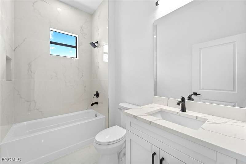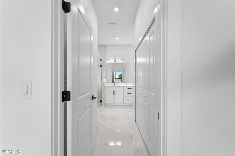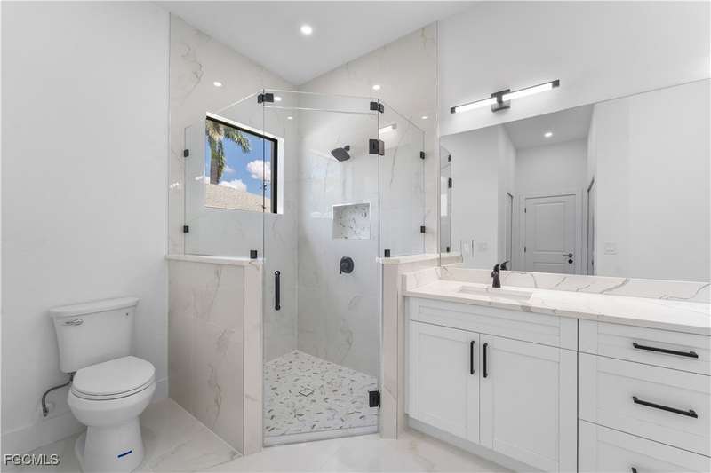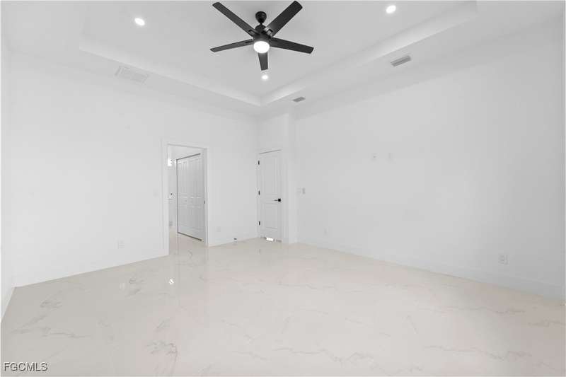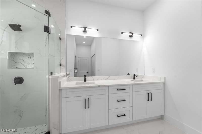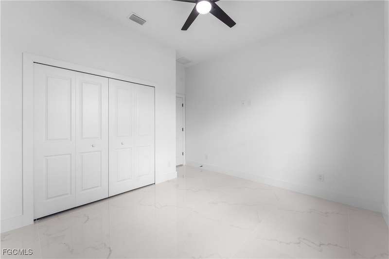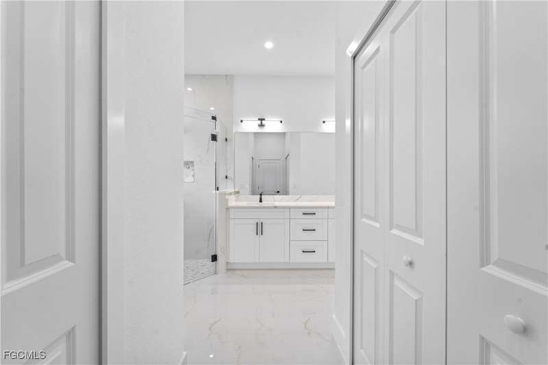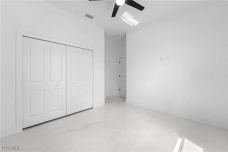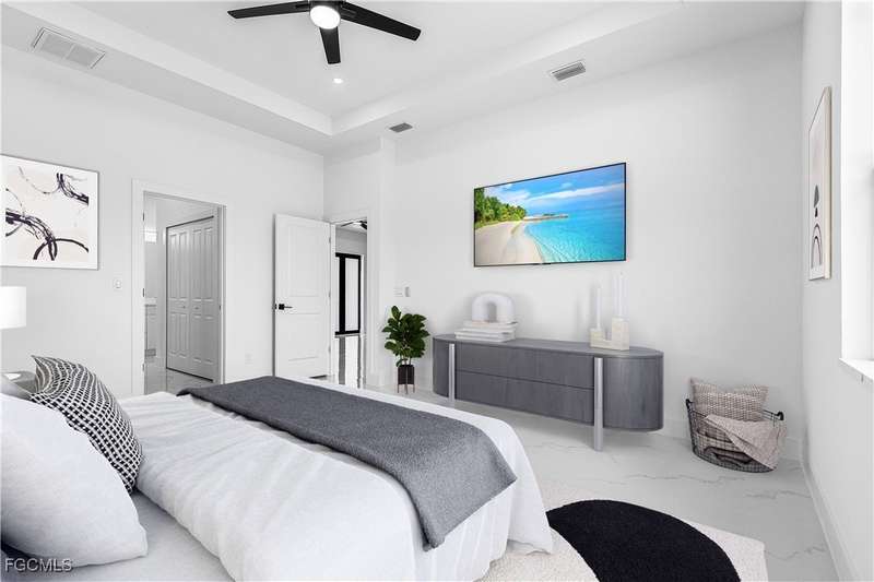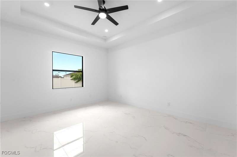 Welcome to 3034 NW 16th Place! Step into a home that balances bold design with everyday function in Cape Coral's rapidly growing Northwest corridor, offering 4 bedrooms, 2 bathrooms, and a sparkling pool on a fully landscaped homesite. From the exterior you'll notice clean architectural lines accented by pavered drive and lanai, fresh sod, 360-degree gutters, a full irrigation system, and custom LED lighting that makes the home glow after sunset, while the fenced backyard adds privacy and security. Inside, the layout is open yet defined, with ceilings climbing from 10 feet in the bedrooms to 12 and 13 feet in the living room, creating an airy volume rarely found in this price point. Impact windows and doors, R30 insulation, and epoxy-coated garage floors speak to durability and efficiency, while thoughtful finishes give the home a polished edge. The kitchen showcases quartz counters with a striking waterfall edge, stainless steel appliances, backsplash accents, soft-close cabinetry, custom closet-style storage, and a walk-in pantry that anchors the space, while the adjacent living room features a custom accent wall that elevates the feel from simple to standout. The primary suite delivers a private retreat with dual walk-in closets designed for organization, a glass-enclosed shower and dual vanity, while the remaining bedrooms are well-scaled, each with ceiling fans and natural light. Tile floors throughout make for seamless flow and easy upkeep. Outdoor living is effortless here: the pool and lanai invite year-round enjoyment, framed by pavers and designed for both gatherings and quiet relaxation. Every detail has been considered, from custom LED lighting inside and out, to closet shelving and storage systems, to the irrigation that keeps the landscape fresh and vibrant. Located near boat ramps, Pine Island Road, shopping, dining, and just a short drive to airports and Gulf access, this home offers both immediate comfort and future value in one of Cape Coral's most active growth areas. 3034 NW 16th Place is not just another new build-it's a property that combines practical upgrades with modern style, ready for its first chapter. Schedule your showing today.