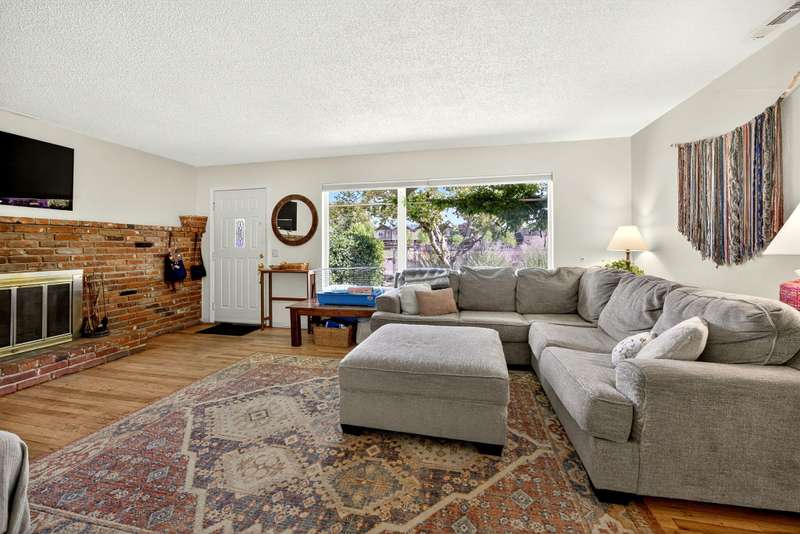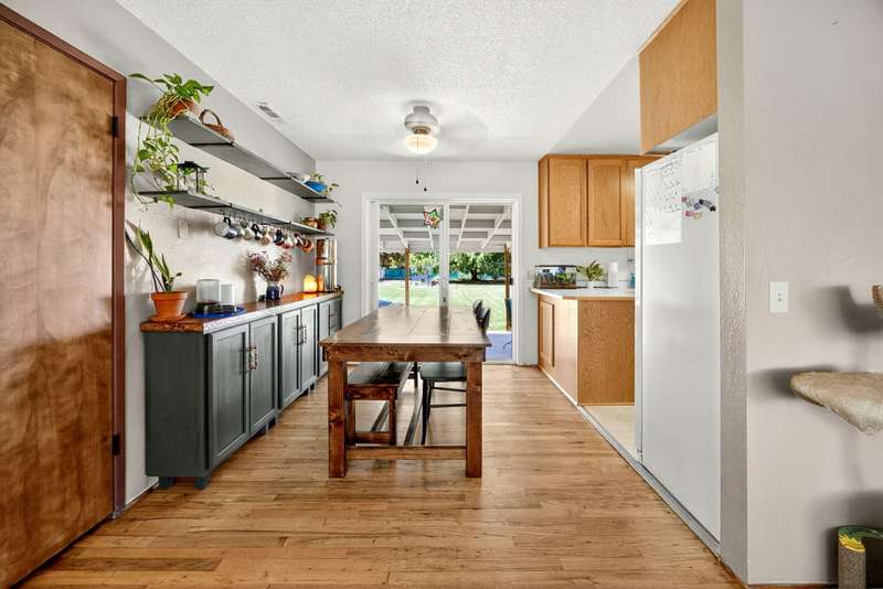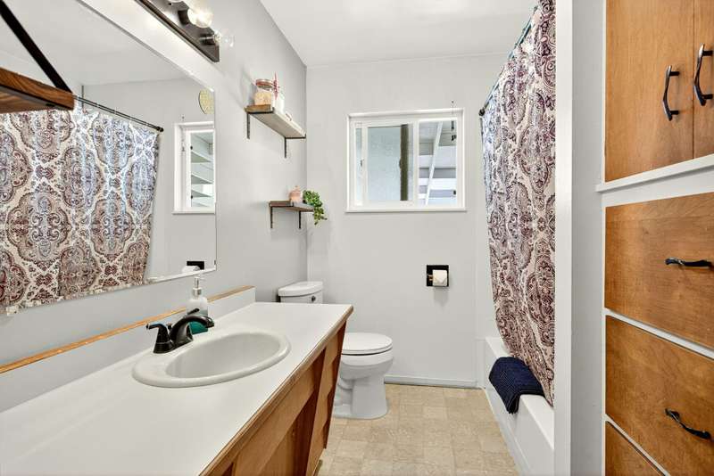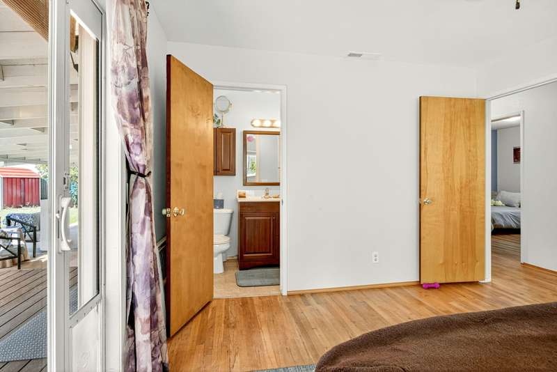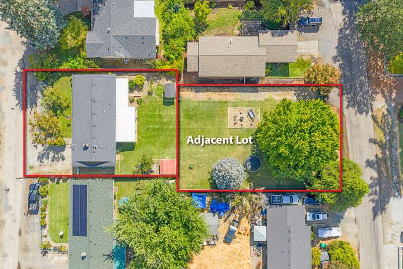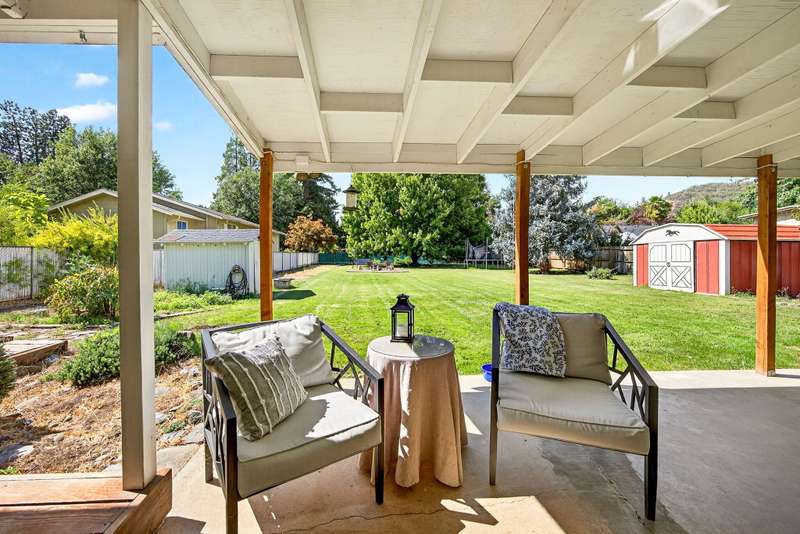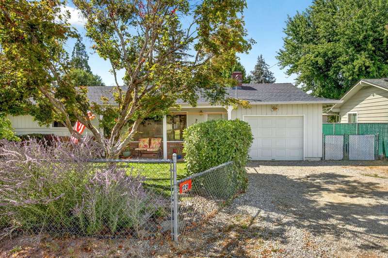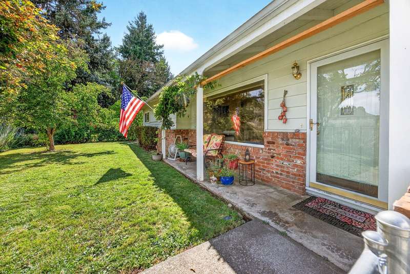 Welcome to this light filled ranch-style home beaming with charm and character. The inviting living room showcases a classic brick-framed wood-burning fireplace, creating a warm and welcoming focal point. The galley-style kitchen offers abundant cabinet space and a practical layout, conveniently located next to the dining room. The spacious primary suite features a private ensuite bath and slider access to the covered back patio. Two additional bedrooms are generously sized with an additional bathroom in the hallway. Outside, enjoy the expansive backyard with its park-like setting, covered patio, and additional storage sheds. This home combines comfort, functionality, and timeless appeal. The adjoining 0.19-acre tax lot is also available for purchase at $150,000, offering future opportunities and added flexibility.