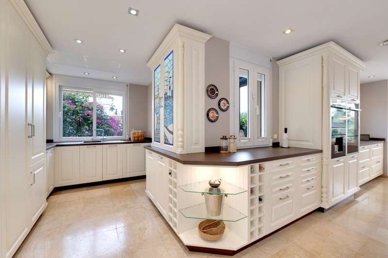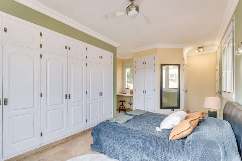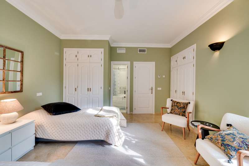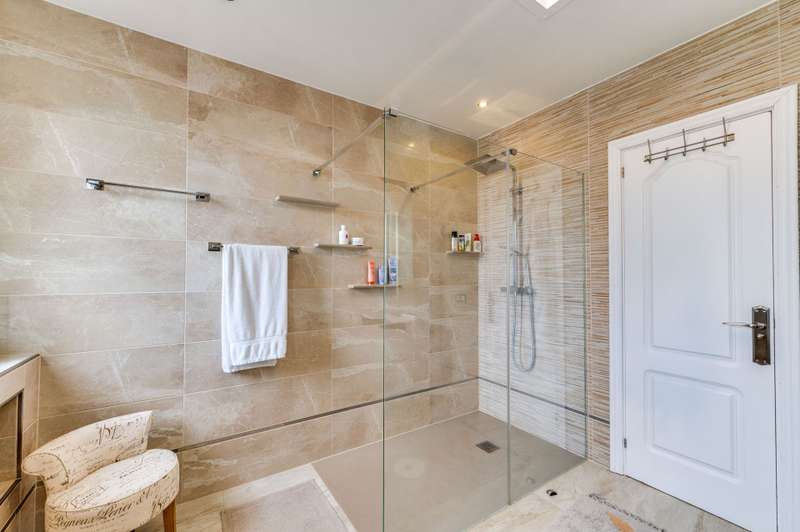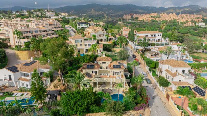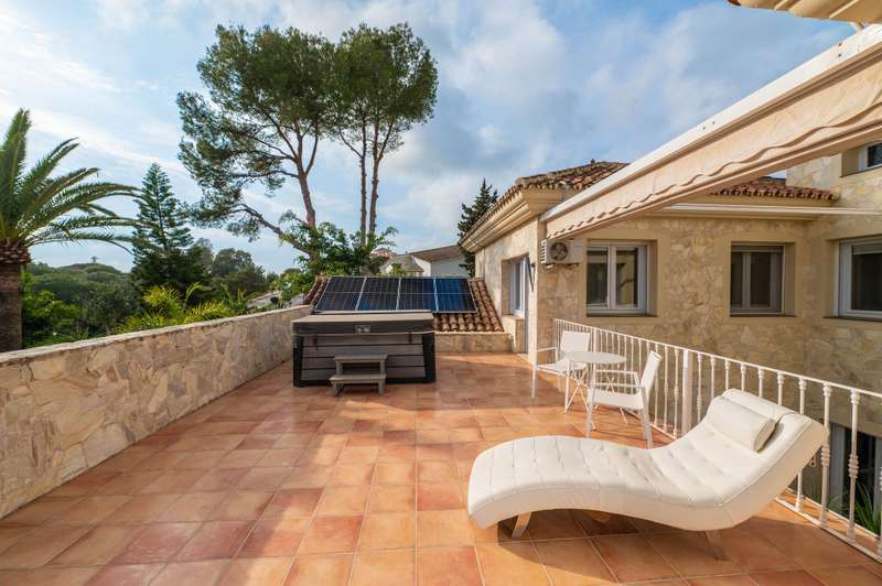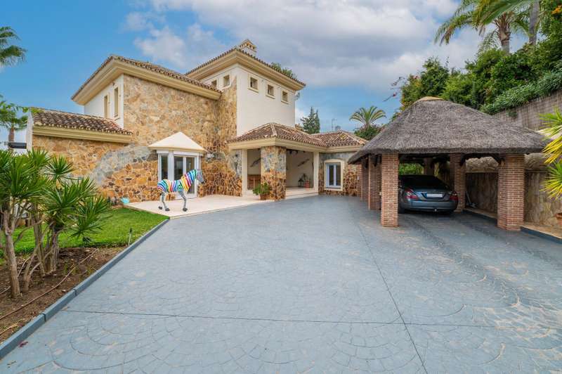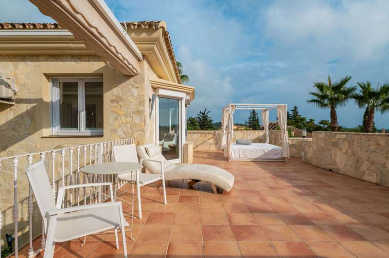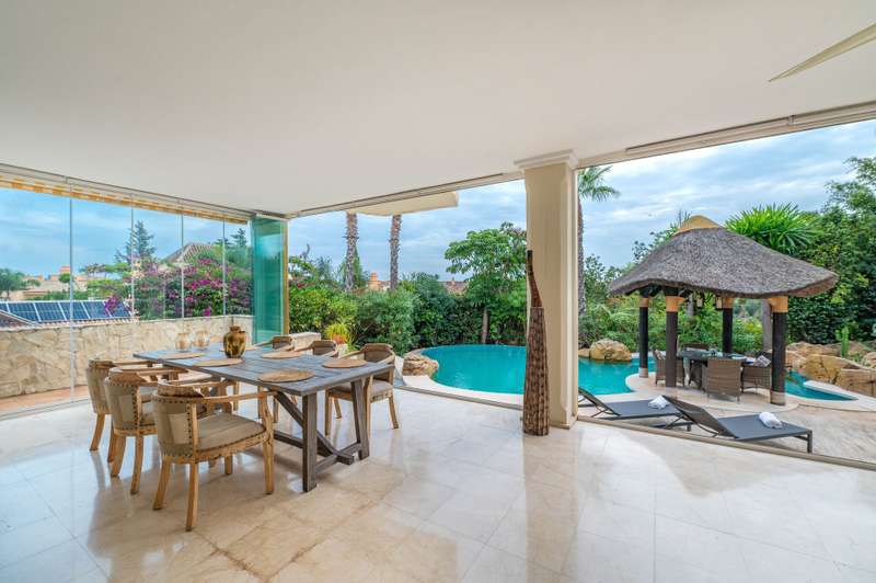 Discover this magnificent 5-bedroom villa in the prestigious Santa Maria Golf area of Elviria, just minutes from the golf course clubhouse and a short walk to Elviria town centre and the beach. Offering panoramic sea views from the first floor, plus an abundance of privacy, this home combines modern luxury with Mediterranean charm, boasting a stunning architectural design and pristine outdoor spaces. Its prime location provides both tranquillity and convenience, making it a rare gem in one of Marbella’s most desirable areas. Step inside to be greeted by a grand entrance featuring a gallery staircase and a sun-filled orangery courtyard. The expansive open-plan kitchen is equipped with a Tepenyaki grill, double ovens, and a large centre island—perfect for both casual meals and gourmet entertaining. The villa’s living spaces include a vaulted-ceiling double lounge, complete with a formal area featuring a fireplace, as well as a relaxed TV area that opens onto the terrace, pool, and gard