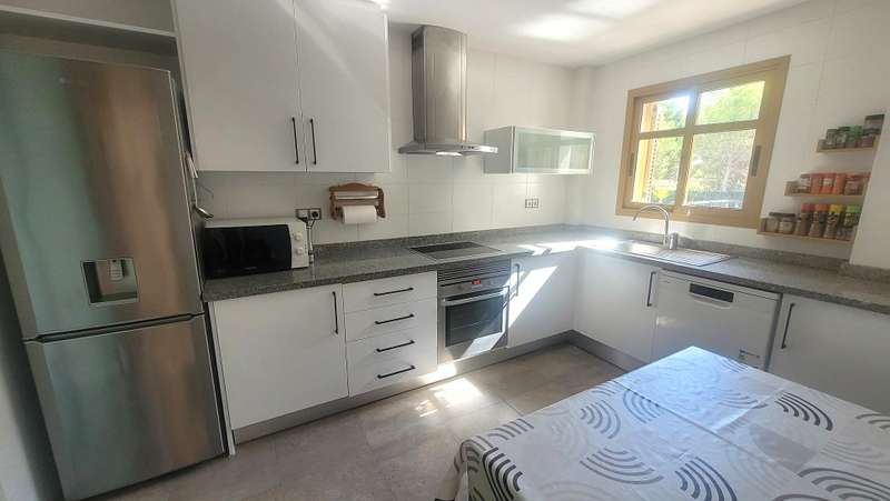 The villa for sale in Finestrat, Alicante, spans 180 m² and is designed to offer a warm and welcoming atmosphere. A spacious living room with a cozy fireplace forms the heart of the home, ideal for family gatherings. The separate, fully equipped kitchen provides ample space for preparing meals and hosting. The property features three generous bedrooms, each with its en-suite bathroom, ensuring privacy and comfort. Additionally, a guest bathroom adds practicality.