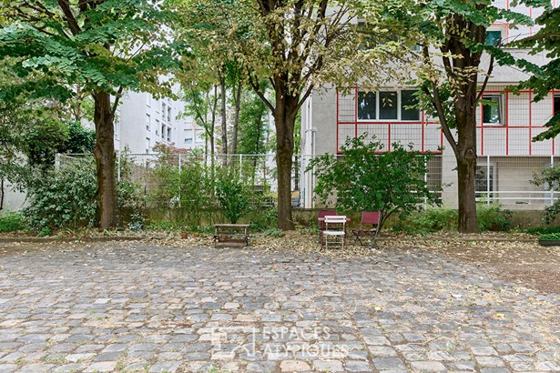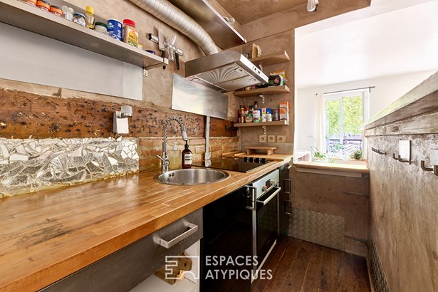 Upstairs, the 25 m2 living area enjoys dual east-west exposure and consists of a private living room and an open-plan kitchen. The herringbone parquet flooring adds a touch of elegance and character.