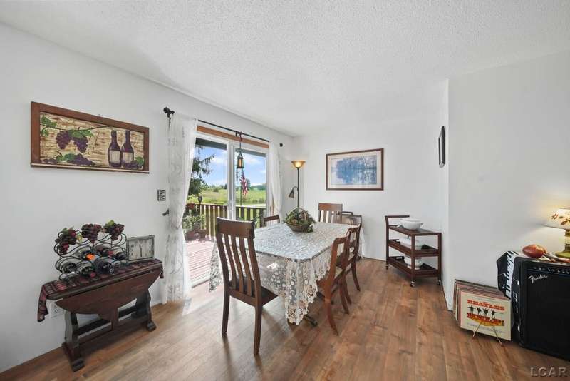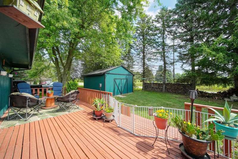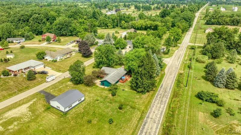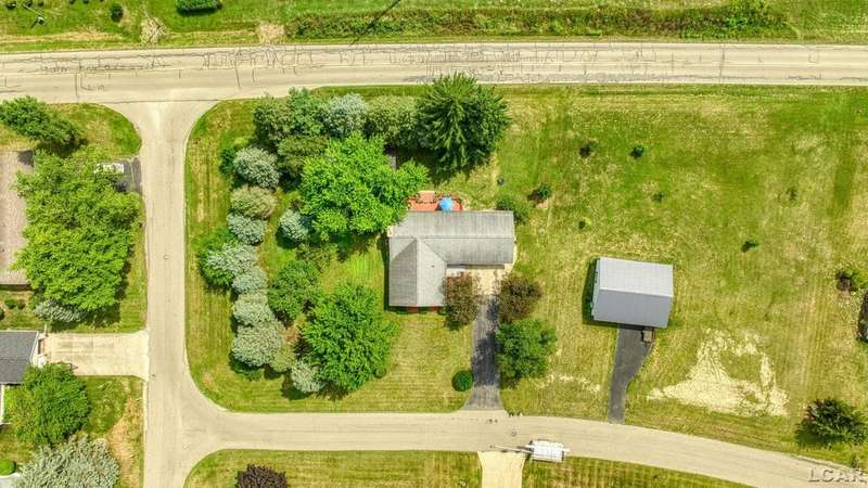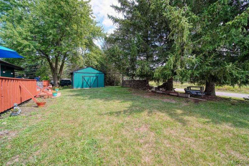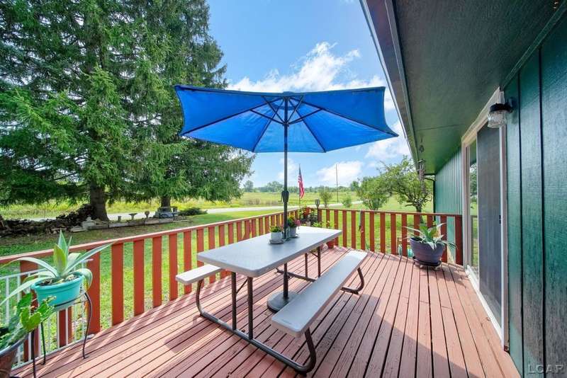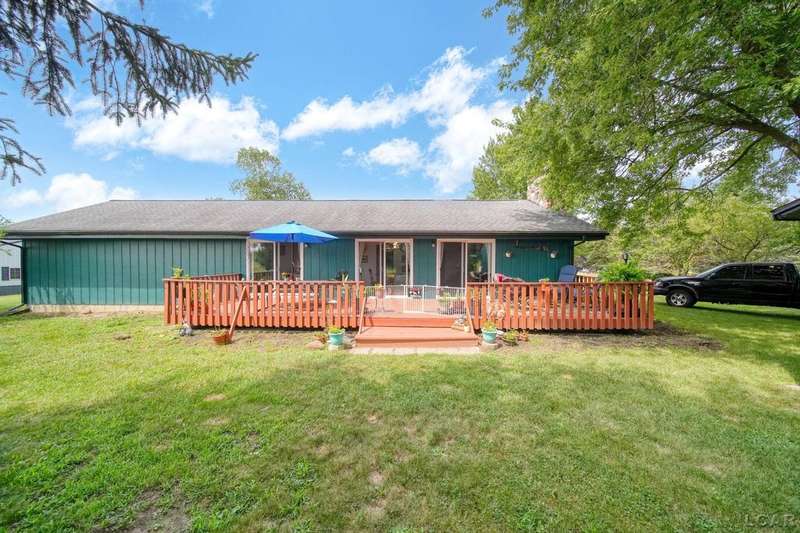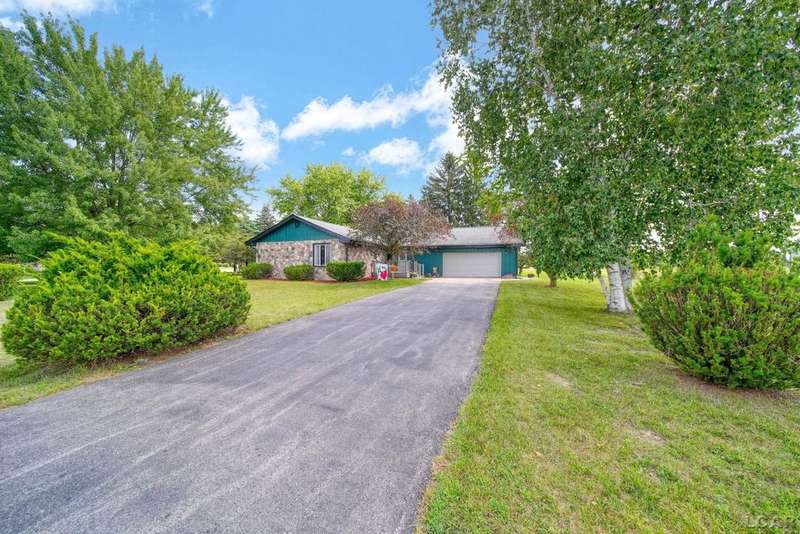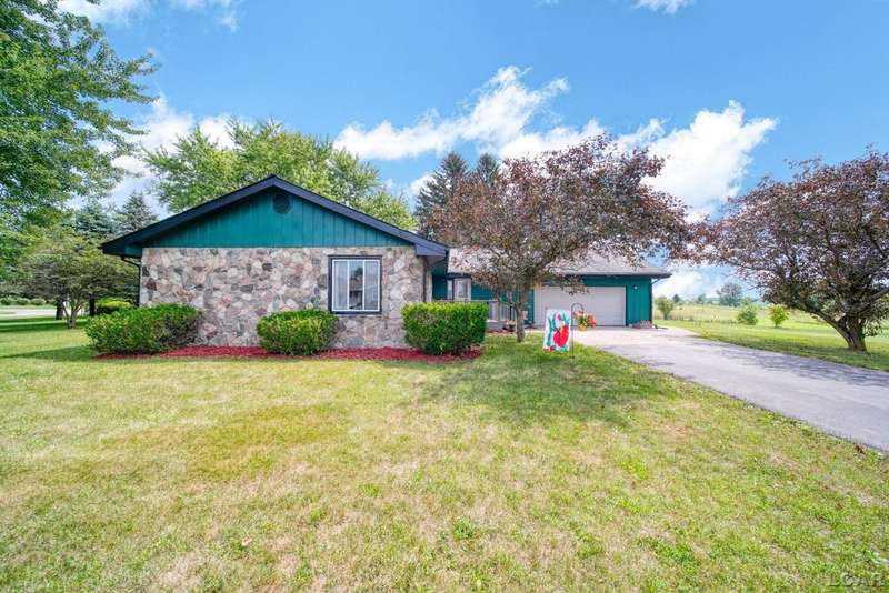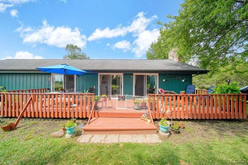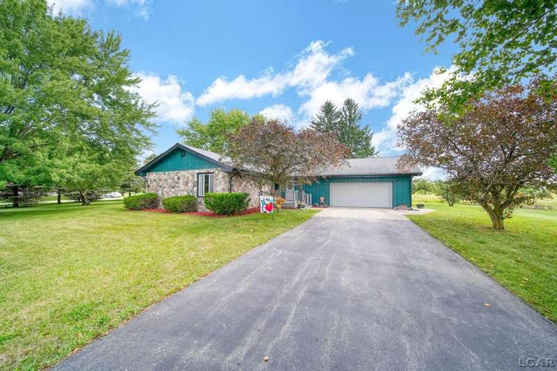 Beautifully remodeled ranch with inviting country ambiance! This nicely updated and open concept 3 bedroom 3 bath ranch blends modern comfort with timeless northern country charm. Nestled in a peaceful tree-lined setting, this home features a spacious open layout, natural wood burning fireplace with stone surround, updated kitchen with newer appliances, first floor laundry, new vinyl plank flooring, newly carpeted bedrooms and freshly painted inside & out. Enjoy relaxing on the large spacious back deck overlooking the backyard oasis with large 16x16 shed, fruit trees and country views. Thoughtful updates with a unique and neutral palette throughout complements the home's rustic appeal. Whether you're looking for quiet country living or a place to entertain in style, this move-in-ready gem offers the best of both worlds. Basement with tall ceilings could be transformed into the perfect space for family/media room. Large corner lot offers space to drive in from Sunrise Dr. and space allows for additional parking. Close to downtown Hudson and Lake Hudson Recreation Area!