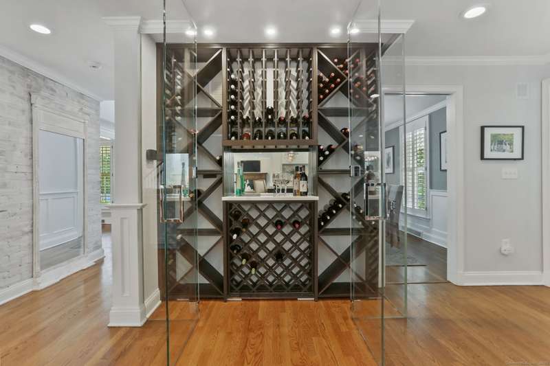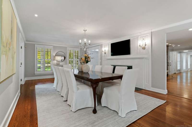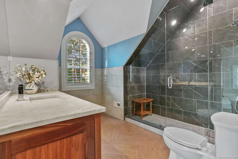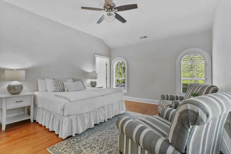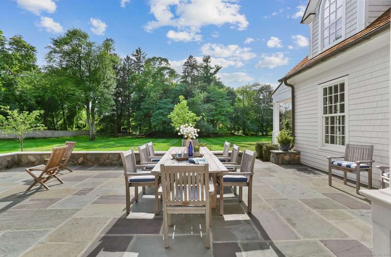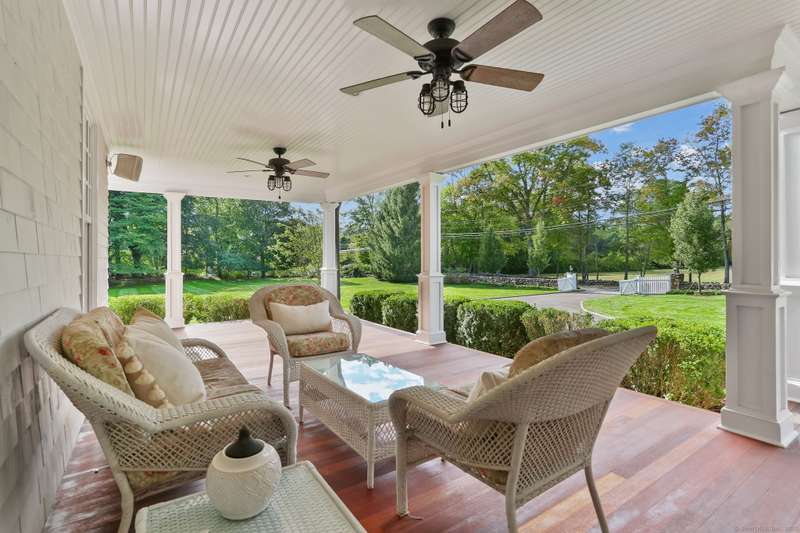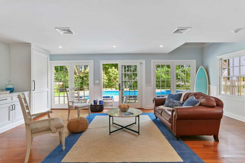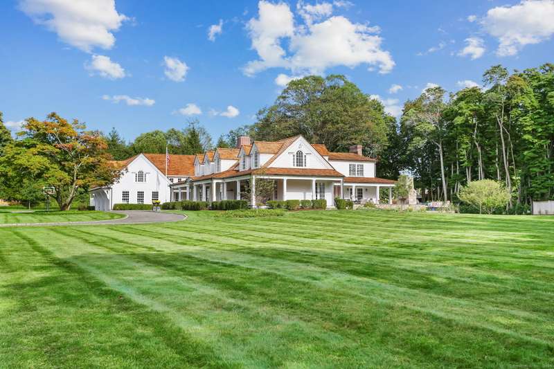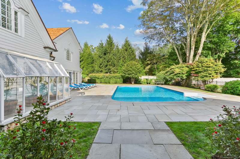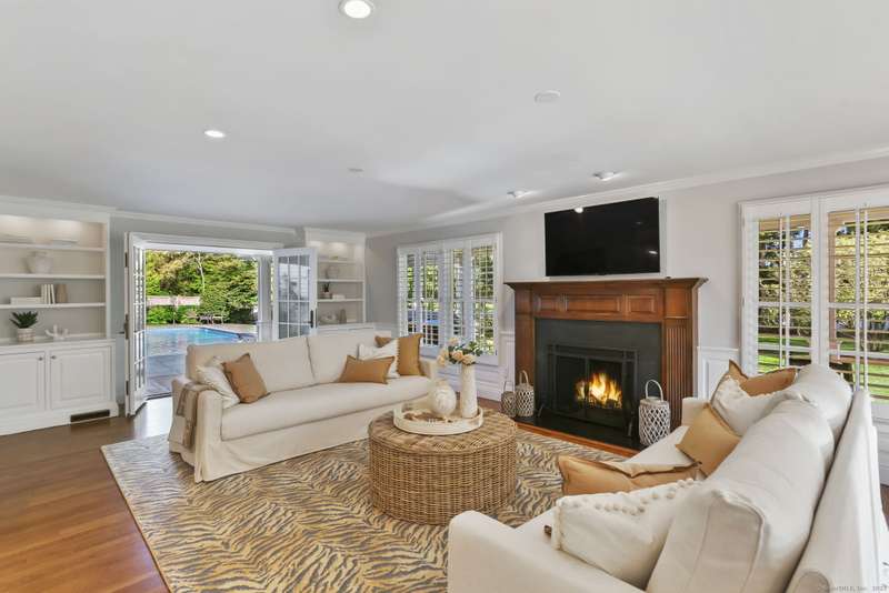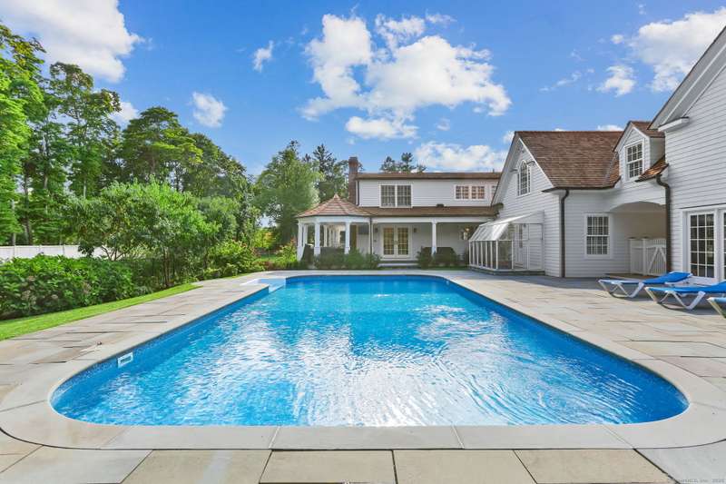 Welcome to 99 Old Academy Road, a distinguished Cape originally reimagined by local architect Richard Swann and thoughtfully expanded in 2019 by Alex Esposito. Arched-top dormers elevate the architecture, blending tradition with luxury. This residence offers 6 bedrooms plus a private two-level guest suite, 7 full / 3 half baths, all set on 2+ acres in lower Greenfield Hill. At the heart of the home, the kitchen offers an open layout with a spacious dining area, custom cabinetry, a floor-to-ceiling glass wine display, and walk-in pantry. The kitchen flows seamlessly onto a bluestone patio with a double-sided fireplace, perfect for indoor-outdoor living. The kitchen leads to the lower level, featuring a stone bar in the game room, a 10-seat cinema, and ample storage. The family room, with its built-ins, poolside views, and gas fireplace, offers an inviting year-round retreat, the main level also includes a private office. Upstairs, every bedroom is paired with its own private bath, each