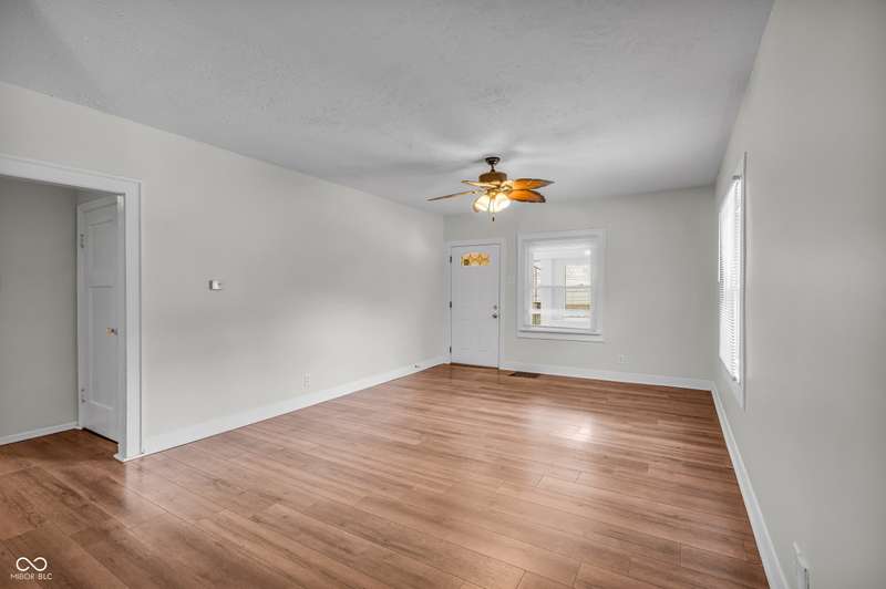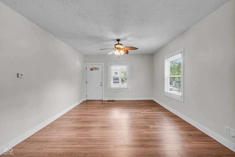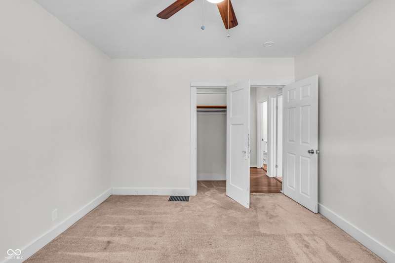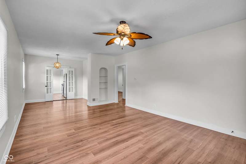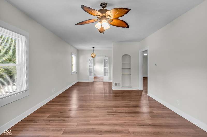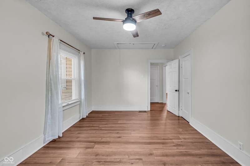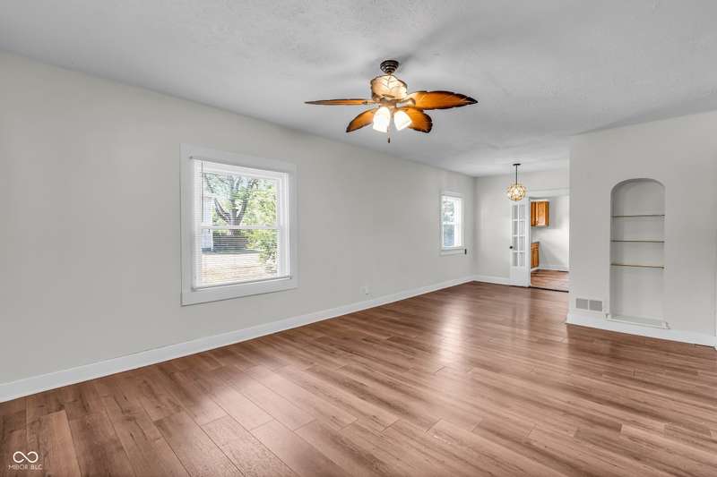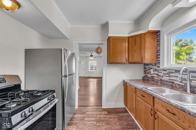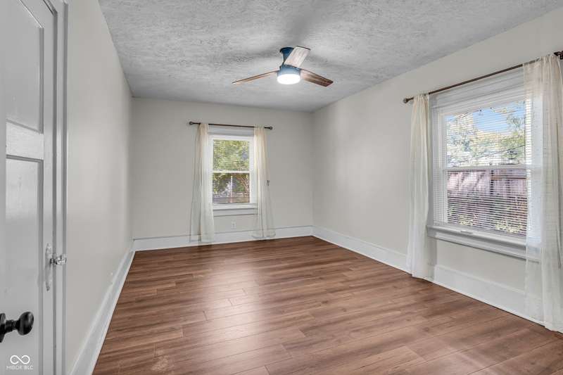 Craftsman Bungalow with Attached Oversized Garage in the sweet spot of Springdale, a block from Windsor Park! Tucked up on a hill among homes that boast century-old character alongside new construction modern cottages. Timeless touches like oversized baseboards and window trim highlight the home's turn-of-the-century charm. The open main level features laminate hardwoods that flow seamlessly through the Great Room and Dining Area, accented by built-in bookshelves and a niche perfect for a hutch or coffee bar. Glass French doors lead into the bright Kitchen, where an expansive window brings in natural light. The Kitchen is well-appointed with stainless steel appliances, including a gas cooktop, plentiful cabinets with roll-out shelving, tile backsplash, and ceramic flooring. From here, continue directly onto the back patio for easy evening grilling or smoking. All 3 bedrooms are oversized, with TWO offering impressive walk-in closets. Additional storage abound on the main level with a coat closet, shelved linen closet, and pull-down attic access. The full bath features a comfort-height vanity with quartz countertop, ceramic tile flooring, tiled tub/shower surround, beadboard ceiling, and an oversized medicine cabinet. A working attic fan provides economical cooling on mild summer days. Outdoor living is a highlight here, with multiple spaces to enjoy: a glassed and screened 19-foot front porch, and a fenced rear yard with patio and firepit shaded by mature trees. The unfinished basement holds loads of opportunity and connects directly to the rare attached Garage - HUGE (26x20) and ideal for a workshop with covered parking. NEW: main gas line, sewer line, laminate hardwood flooring, and fresh main-level interior paint. Pre-inspected for peace of mind. Unbeatable Location! Minutes from Mass Ave, Bottleworks, the Monon Trail, Kan-Kan Cinema, Spades Park, Beholder, Tik-Tock Lounge, North Mass Boulder, and the Factory Arts District for breweries, yoga, and more!