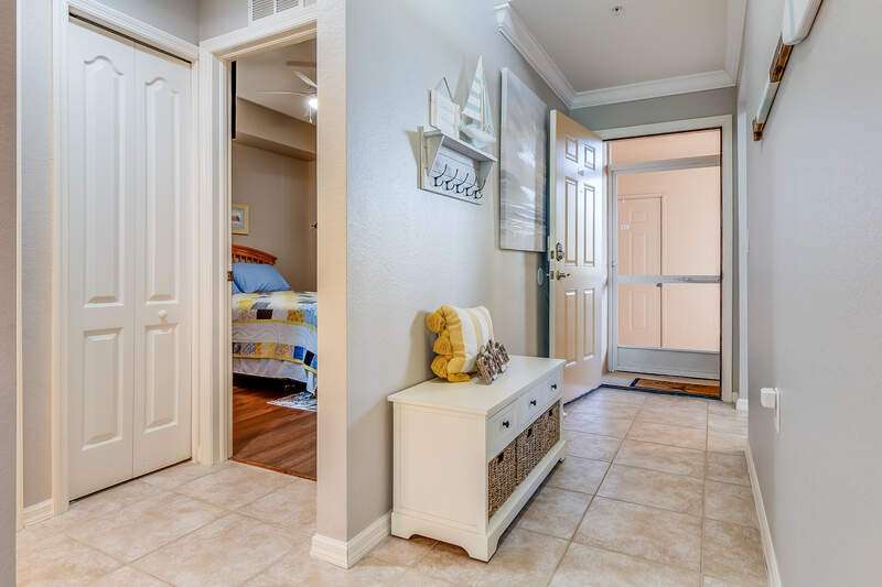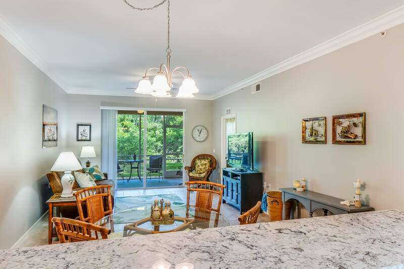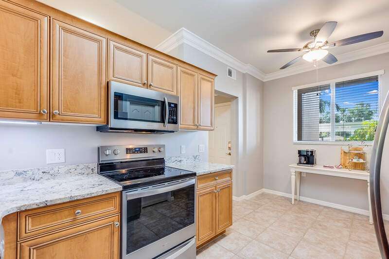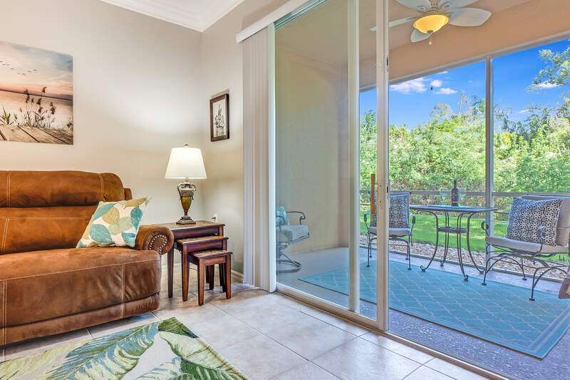 Turnkey First-Floor in Terraces at Riverwalk - Move-In Ready! Welcome to effortless Florida living in this beautifully maintained first-floor condo in the highly sought-after Terraces at Riverwalk community. Ideally located just minutes from stunning beaches, fantastic dining, shopping, and entertainment, this home is perfect for full-time residents, seasonal visitors, or investors looking for a prime rental opportunity. Step inside to a bright and open layout featuring a completely stocked kitchen with elegant marble countertops, rich wood cabinetry, and stainless-steel appliances, including a brand-new stove and a Bosch dishwasher. The refrigerator, microwave, and dishwasher were all replaced in 2019. Luxury vinyl flooring in the bedrooms ensures easy maintenance-no carpet anywhere! The spacious master suite offers a king-size bed and a custom vanity in the ensuite bath, while the guest room includes a queen bed-perfect for family and friends. Extra shelving in all closets and the laundry room adds great storage options, plus there's an oversized exterior storage closet with built-in organization conveniently located right across from your front door. Step out onto your reimagined lanai and take in the peaceful preserve view, offering a serene retreat to relax and unwind. Enjoy peace of mind with impact windows throughout and knowing that all major systems have been updated, including a new hot water heater (2019) and a new AC unit (January 2022). Even better, this property is located in a NO FLOOD ZONE! Previous owner also had installed a radon system located in the primary closet. The community has undergone recent upgrades, including a new roof, fresh exterior paint, brand-new carports, and beautifully maintained landscaping. The assigned covered carport (#052) ensures convenient parking, with plenty of additional guest parking available. The resort-style amenities include a freshly updated clubhouse, a heated pool, and a welcoming community with plenty of activities. Sewer and water are included, making this home even more affordable and hassle-free. Plus, with 12 leases allowed per year (30-day minimum), this condo is also a fantastic investment opportunity-whether for seasonal or annual rental income! Move-in ready, pet-friendly, and packed with upgrades-this is the perfect place to call home!
