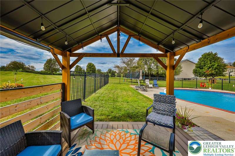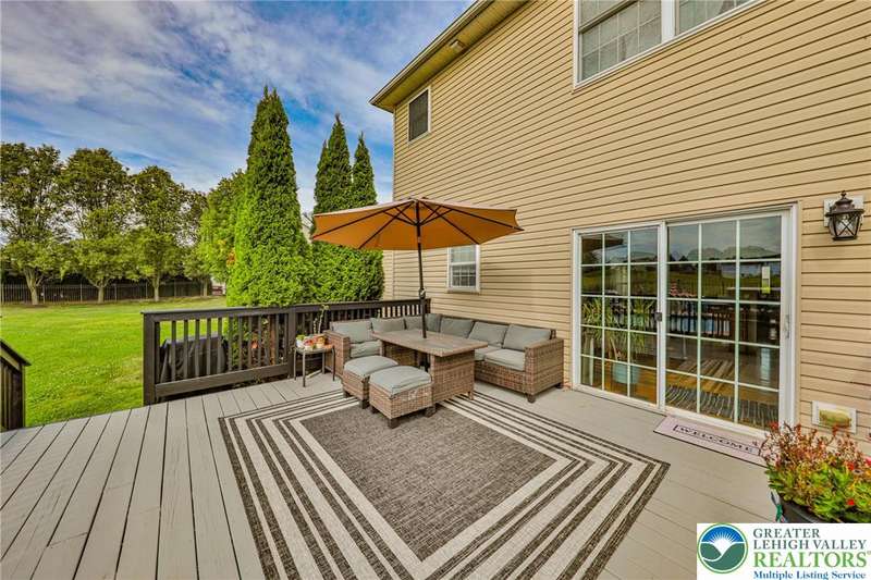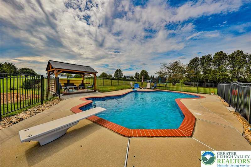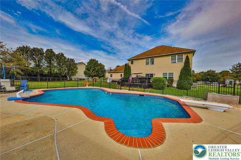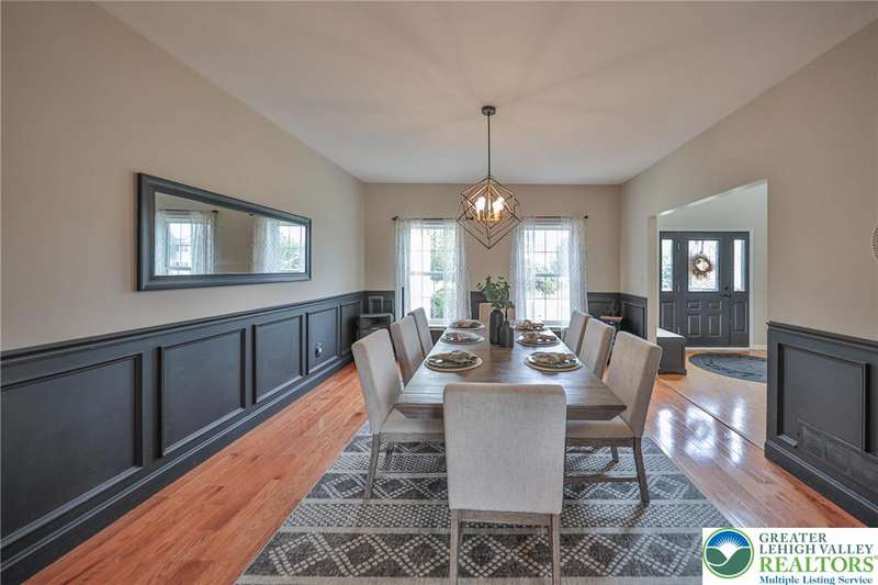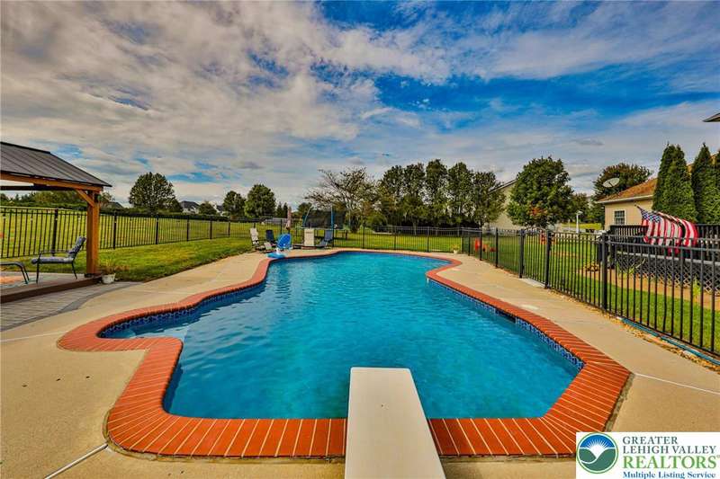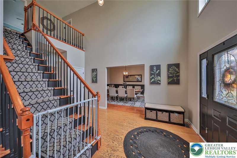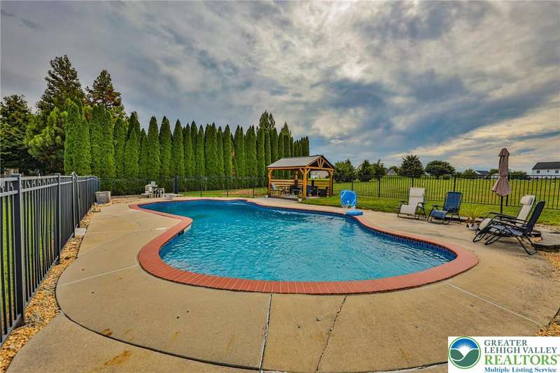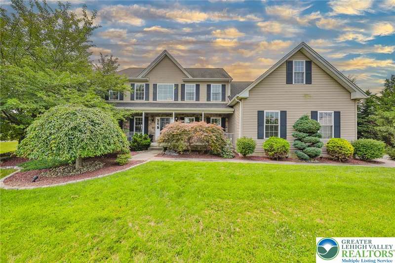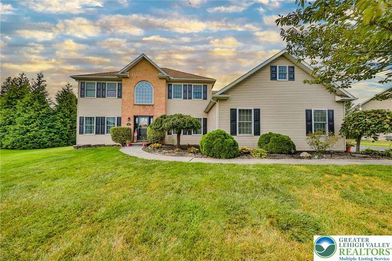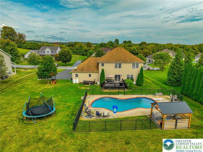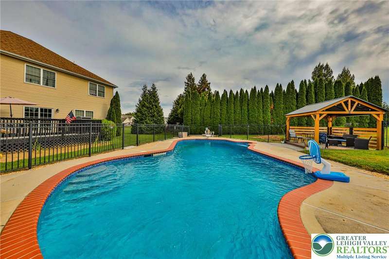 Beautiful Florey Farm 5 bedroom 3 full bath colonial, located in NAZARETH SCHOOL DISTRICT features plenty of updates and incredible space. You will love having a full bath and bedroom on the main floor which is perfect for guests or extended family! The elegant two story foyer entry showcases a formal dining room to the right accented with raised panel molding and modern chandelier, and a formal sitting room to the left, which could serve as an office space. A gas fireplace is the focal point of the open concept family room which leads to a well appointed eat in kitchen that comes with an oversized center island with additional seating. Every bathroom has been tastefully updated with modern flair. The flooring is newer throughout most of the home, including LVP, and Bruce hardwood flooring encompassing the formal dining and living rooms as well as the family room. The master bedroom features stunning tray ceiling with wood accents, and raised panel molding, walk in closet, and a recently renovated designer ensuite with step in shower with glass doors, luxurious soaking tub, and modern dual vanity. The full finished basement also has an expansive family room plus an additional two more rooms perfect for office/den. Enjoy back yard bbq sitting on the deck that overlooks a dreamy backyard and a fabulous inground pool and new cabana. Plenty of room to roam, garden, and enjoy here.