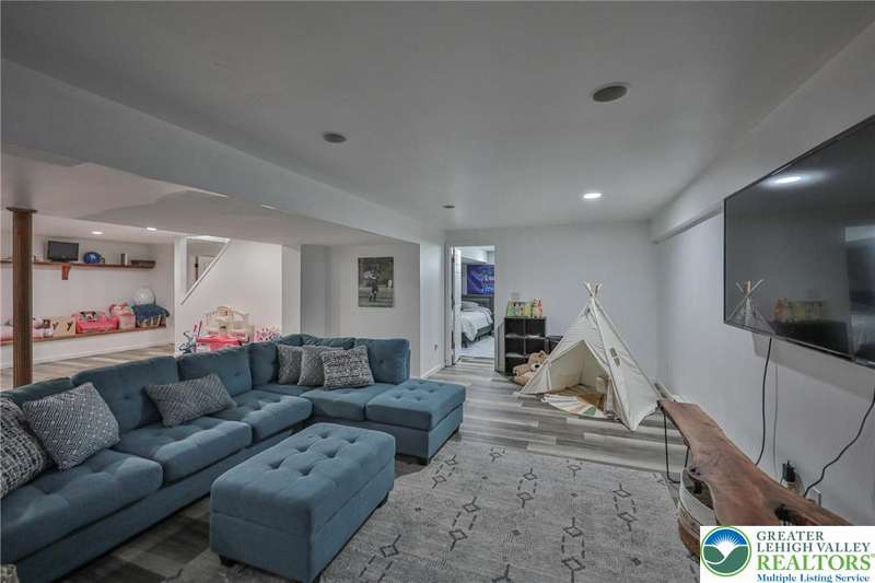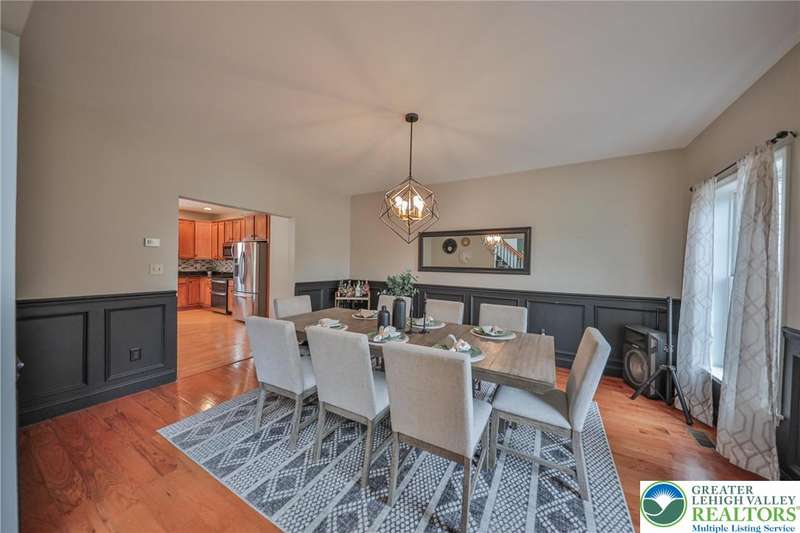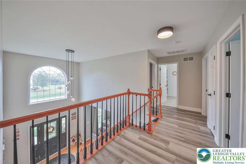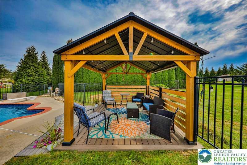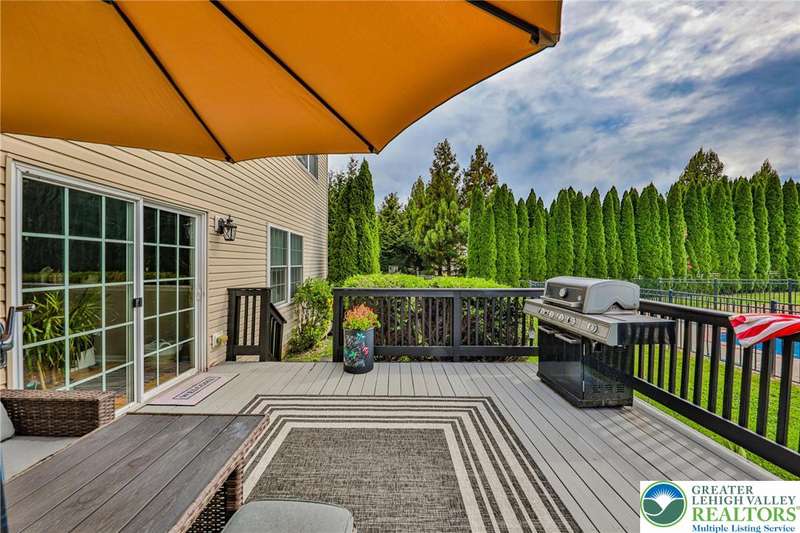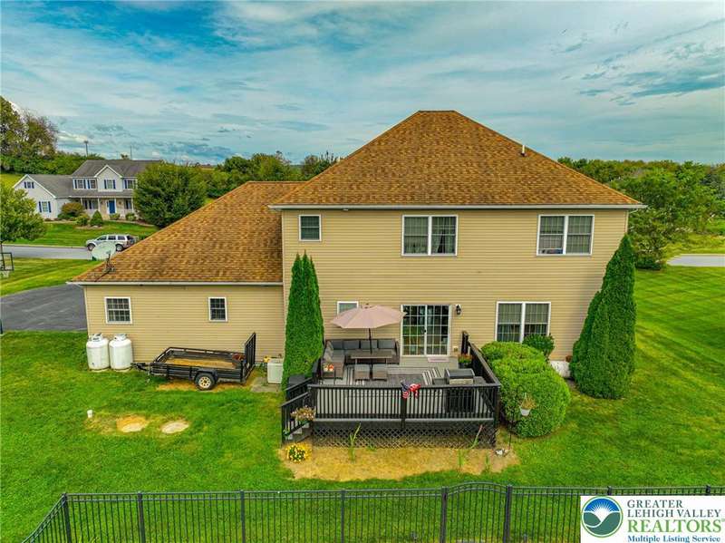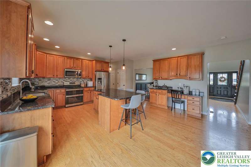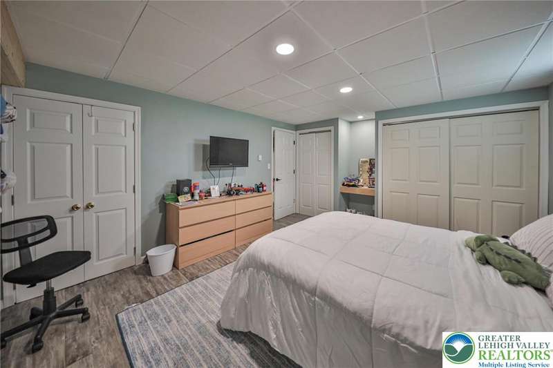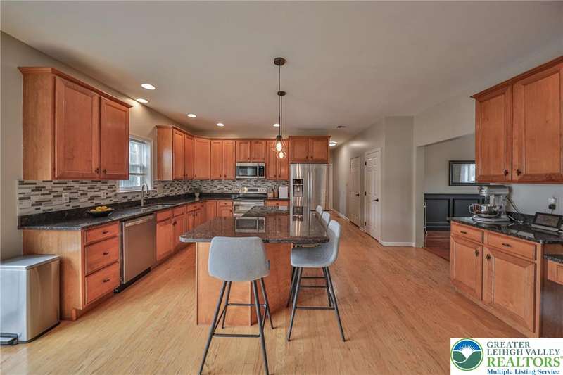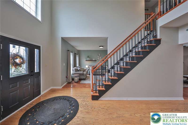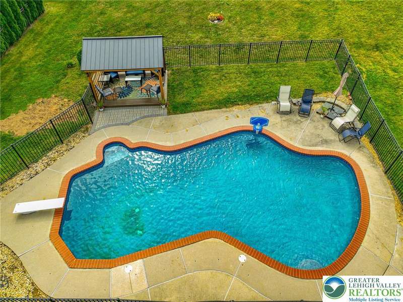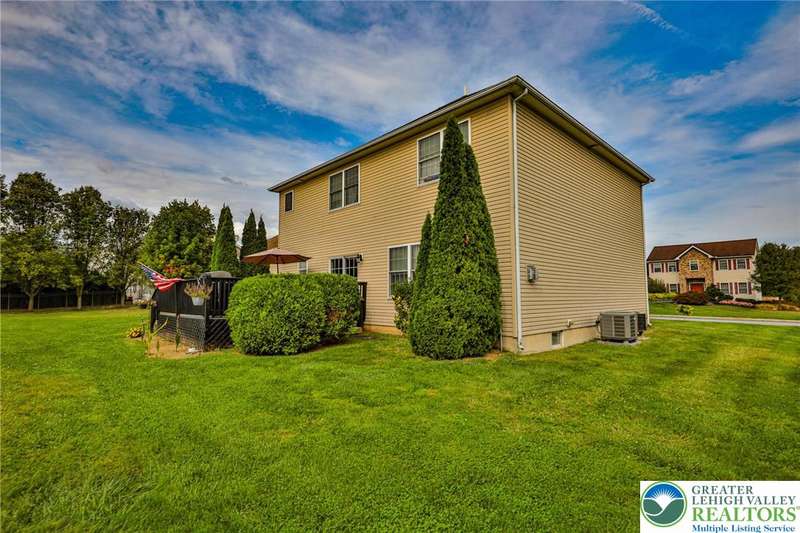 Beautiful Florey Farm 5 bedroom 3 full bath colonial, located in NAZARETH SCHOOL DISTRICT features plenty of updates and incredible space. You will love having a full bath and bedroom on the main floor which is perfect for guests or extended family! The elegant two story foyer entry showcases a formal dining room to the right accented with raised panel molding and modern chandelier, and a formal sitting room to the left, which could serve as an office space. A gas fireplace is the focal point of the open concept family room which leads to a well appointed eat in kitchen that comes with an oversized center island with additional seating. Every bathroom has been tastefully updated with modern flair. The flooring is newer throughout most of the home, including LVP, and Bruce hardwood flooring encompassing the formal dining and living rooms as well as the family room. The master bedroom features stunning tray ceiling with wood accents, and raised panel molding, walk in closet, and a recently renovated designer ensuite with step in shower with glass doors, luxurious soaking tub, and modern dual vanity. The full finished basement also has an expansive family room plus an additional two more rooms perfect for office/den. Enjoy back yard bbq sitting on the deck that overlooks a dreamy backyard and a fabulous inground pool and new cabana. Plenty of room to roam, garden, and enjoy here.