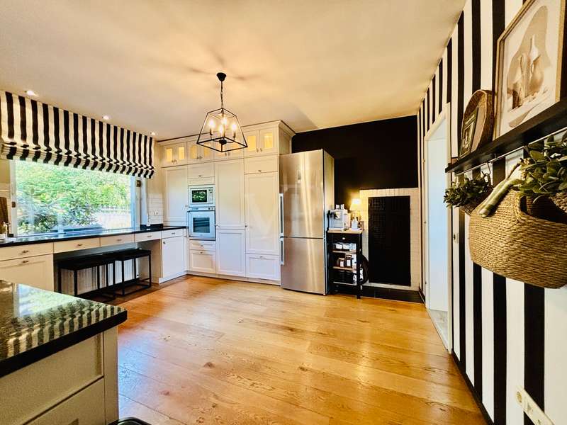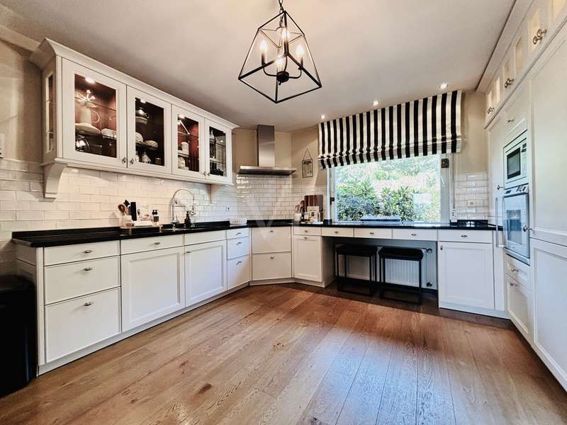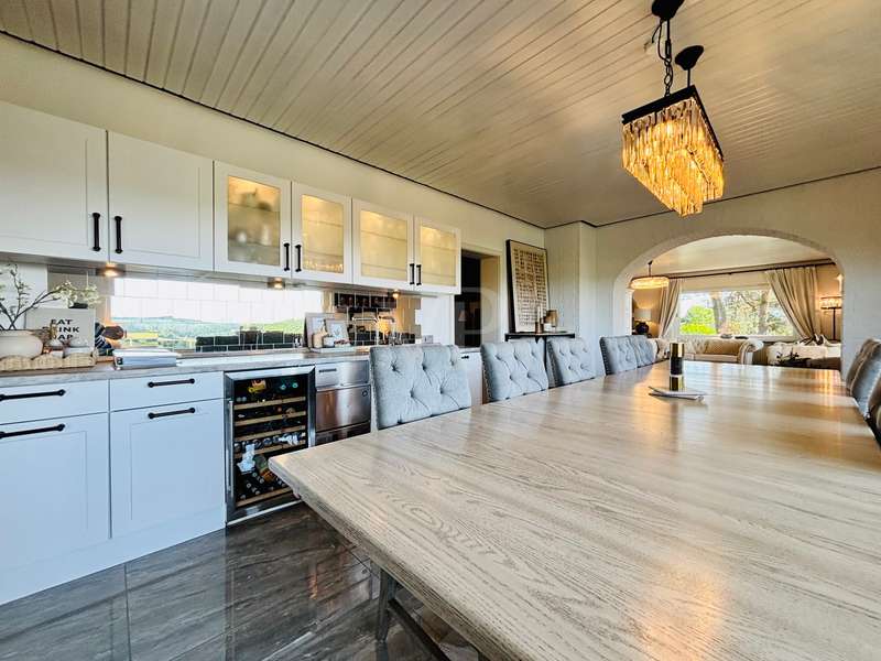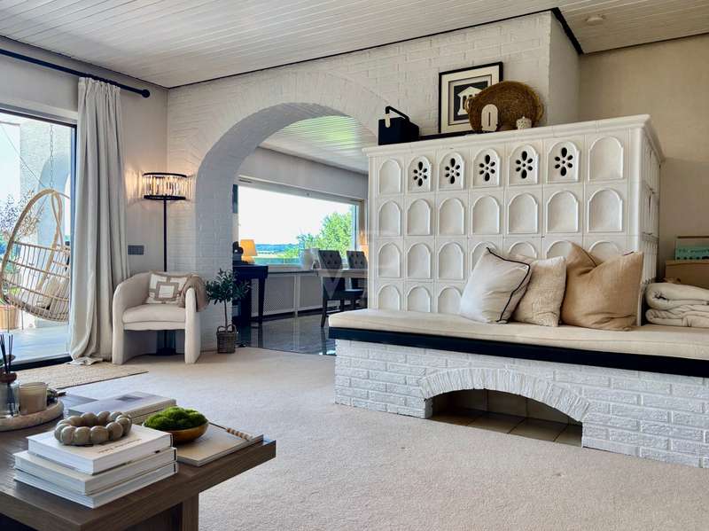 A place to feel at home. This charming classic is a true rarity with unobstructed views of the Aartal valley - surrounded by greenery and just a few minutes from the versatile Aartalsee lake. The beautiful solid-built detached house was built in 1969, extended with an annex in 1982 and is in first-class condition following extensive renovation in 2021. On a generous living space of approx. 289 m², you will find enough space for individual design options and comfort. The property is situated on a spacious plot of approx. 1459 m², which offers a wide range of possible uses, be it for relaxing hours outdoors or for generous garden design. The house consists of a total of 9 rooms, which is ideal for a large family or for combining living and working on two levels. Particularly noteworthy are the 6 spacious bedrooms, which offer sufficient privacy and retreat options. On the first floor of the house, an inviting hallway leads to a spacious living and dining area. A beautiful tiled stove with characteristic tiles adds a special touch to the living ambience. The open-plan design conveys a pleasant sense of space. Large window fronts provide bright, light-flooded rooms and at the same time open up a view of the greenery. There is access to a south-west-facing terrace from here. You can enjoy many hours of sunshine and evenings with a wonderful view of the tranquil natural surroundings. The adjoining kitchen is equipped with modern Gaggenau premium appliances and enables a cooking experience at the highest level. A second kitchenette with wine fridge in the dining area is a practical addition that combines both functionality and style. Two further rooms on this floor can be used as bedrooms, home offices or guest rooms as required. A modern daylight bathroom and a guest toilet are also available on this floor. Five further rooms and three bathrooms are located in the basement. Part of the basement can easily be converted into a granny apartment with a separate entrance. The entire interior of the house embodies a harmonious combination of urban New York style and refined, modern American elegance. The property is in a completely renovated condition, which is underlined not least by the high-quality fixtures and fittings. The central heating system ensures a pleasant temperature throughout the house, even on cold days. A modern double garage prevents laborious ice scraping in winter. The modernization measures from 2021 in particular have given the house a contemporary and stylish ambience.