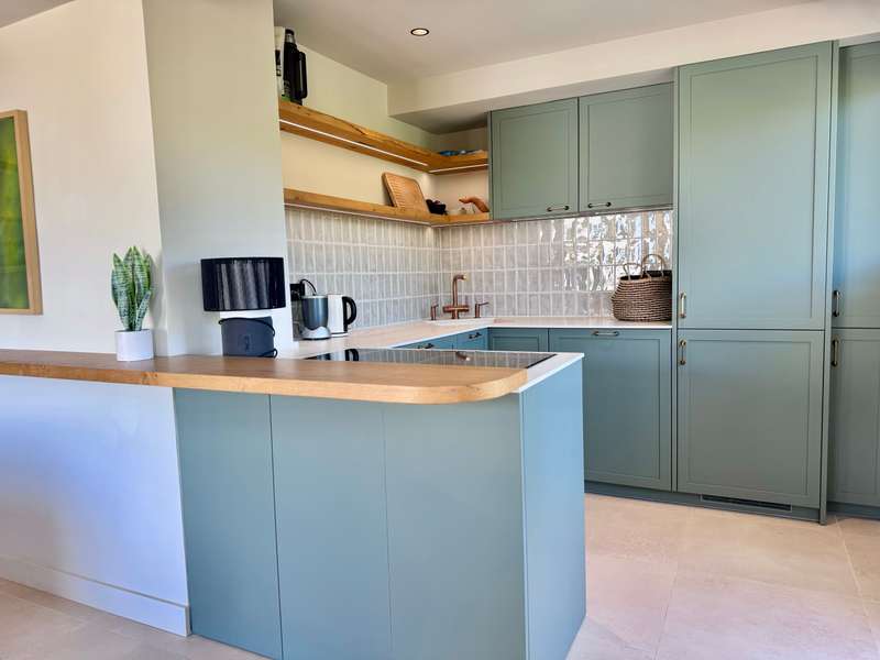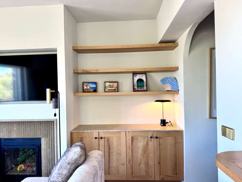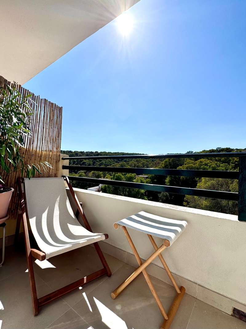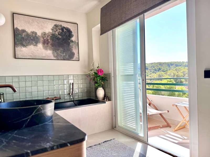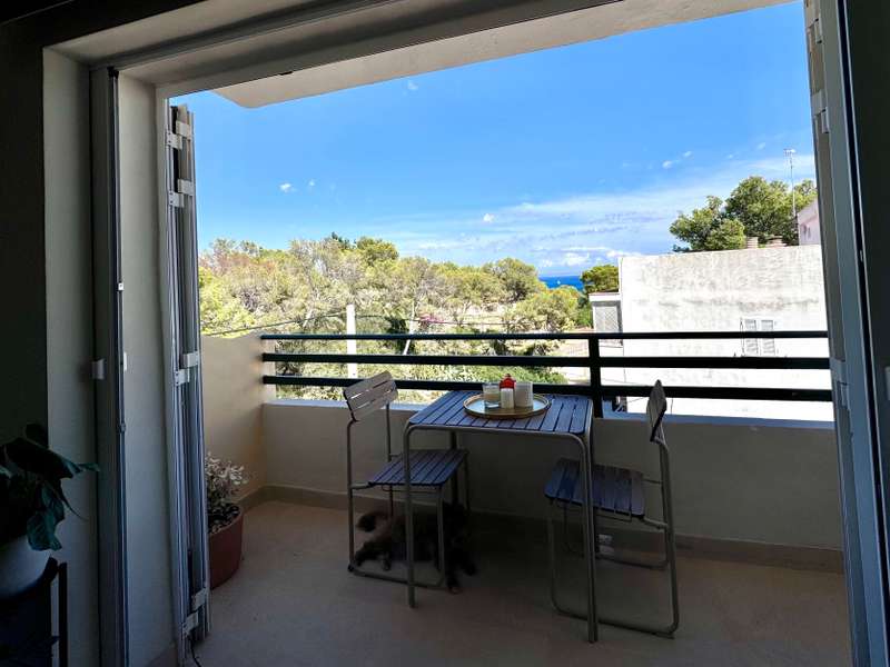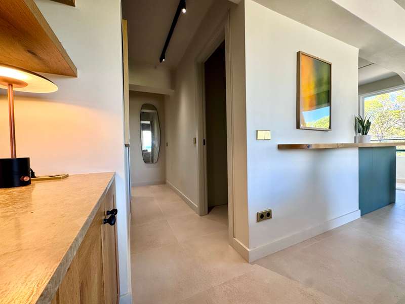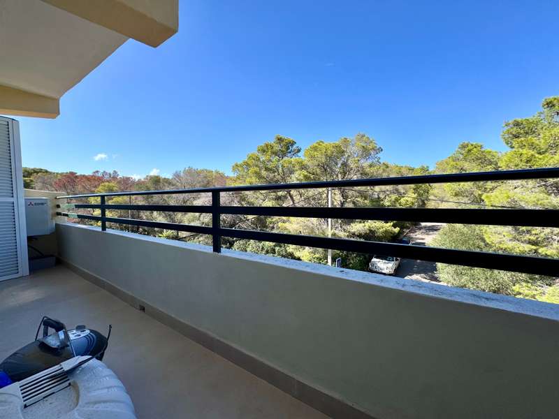 This charming 58 m² apartment, with direct and unobstructed sea views, has been completely renovated in 2025 under the guidance of a professional designer, using high-quality materials. It is located in Portals Vells, one of the quietest and greenest areas on the coast of Calvià, perfect for those looking for peace and the sea just steps away. Situated on the second floor (no elevator), it offers a bright bedroom with access to a balcony, a modern, fully equipped kitchen, also with balcony access, and a living room with a functional fireplace that opens onto a balcony facing the sea—ideal for enjoying the Mediterranean breeze. The air conditioning system (hot/cold) ensures comfort all year round. The apartment also features three private terraces, perfect for relaxing, reading, or enjoying time outdoors with friends and family. Every detail has been carefully considered: double-glazed windows, quality tiles, bathtub, faucets, and custom-made wardrobes crafted by local artisans. The