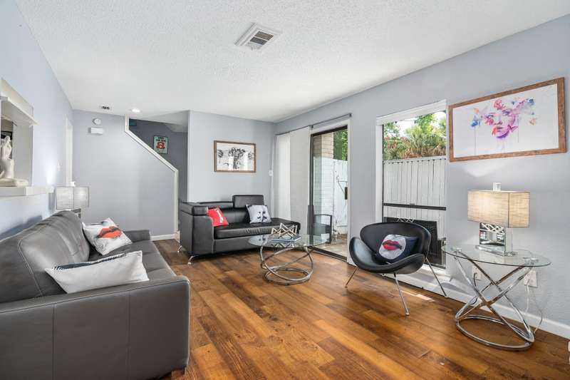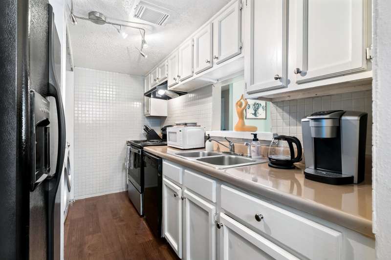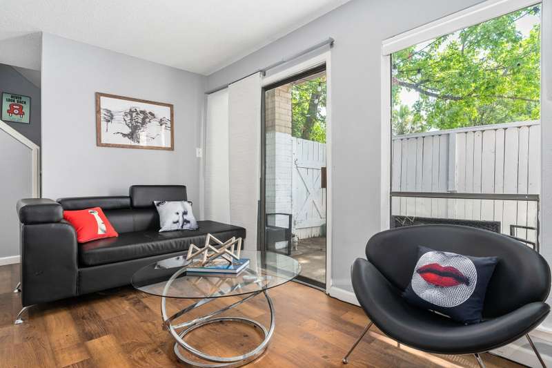 This charming two-bedroom townhome is currently leased through March 2026. Step inside to find updated flooring, a cozy wood-burning fireplace, and a spacious living room that opens to a private fenced patio—perfect for relaxing or entertaining. The galley kitchen connects seamlessly to the breakfast room, creating an inviting space for everyday living. Upstairs, the primary suite offers an ensuite bathroom for added privacy, while the secondary bedroom features doors leading to a balcony overlooking the courtyard. A utility room is conveniently located inside the condo, and the washer and dryer convey with the property. Centrally located near the Galleria with easy access to Westpark Tollway and Westheimer Road, this home offers both comfort and convenience in a sought-after location. All info per Seller.