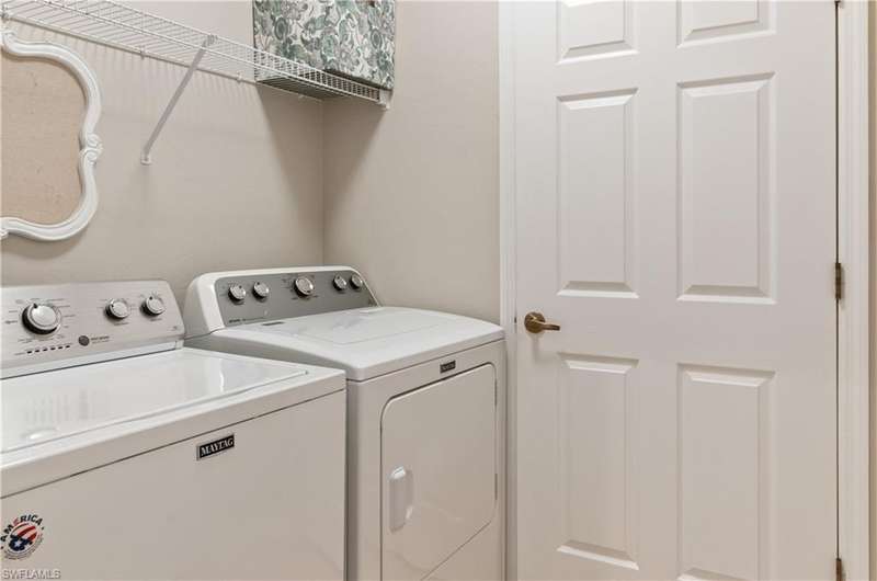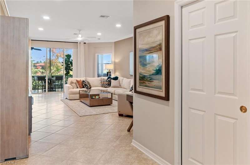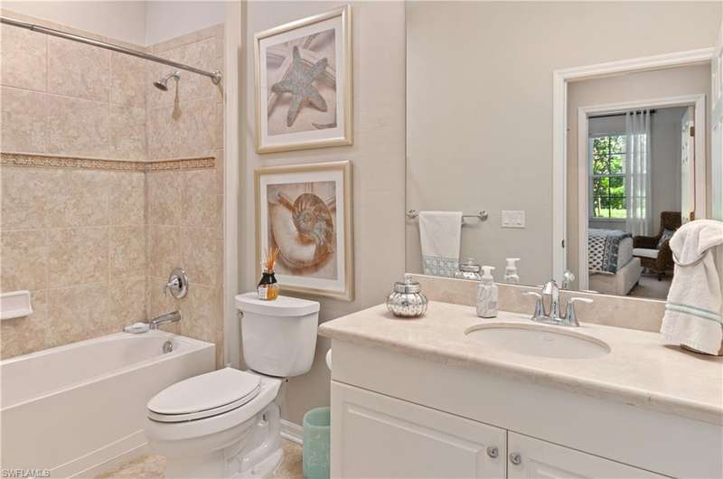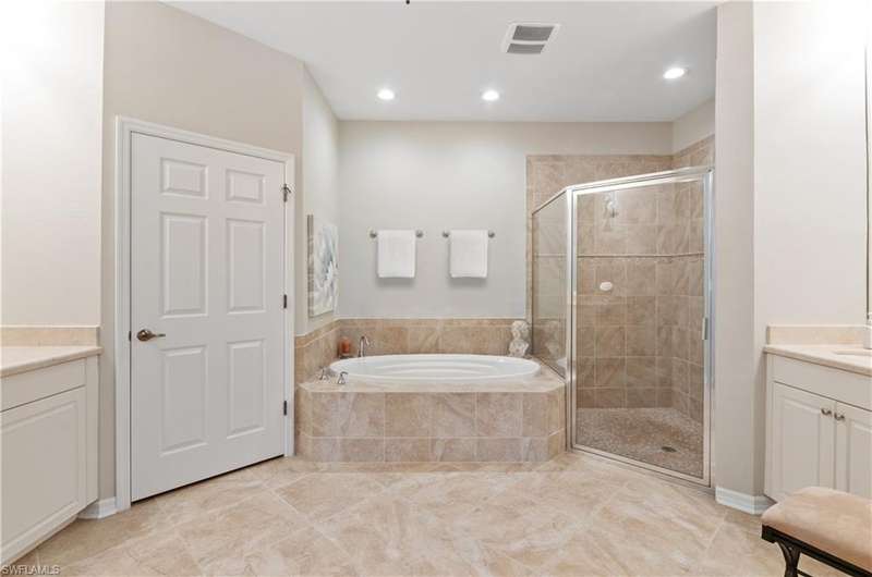 GOLF MEMBERSHIP included with this charming carriage home in Vasari Country Club! Located in the sought-after Firenze community with only 42 units sharing a private pool, spa, and BBQ area. The lush landscaping and prime cul-de-sac location enhance the beauty of this peaceful neighborhood. This first-floor home boasts elegant features, including diagonal tile flooring, crown molding, recessed lighting, and an open floor plan with split bedrooms that provide privacy perfect for hosting guests. Whether you're looking for a year-round or seasonal residence, this home offers the ideal setting for enjoying the Southwest Florida lifestyle. Take in tranquil northern lake views from your screened lanai, a perfect spot to unwind. The kitchen is designed for both functionality and style, featuring spacious granite countertops, rich wood cabinetry, and ample prep space. The large primary suite includes walk-in closets and leads to a spa-like bathroom with an oversized soaking tub, a large shower