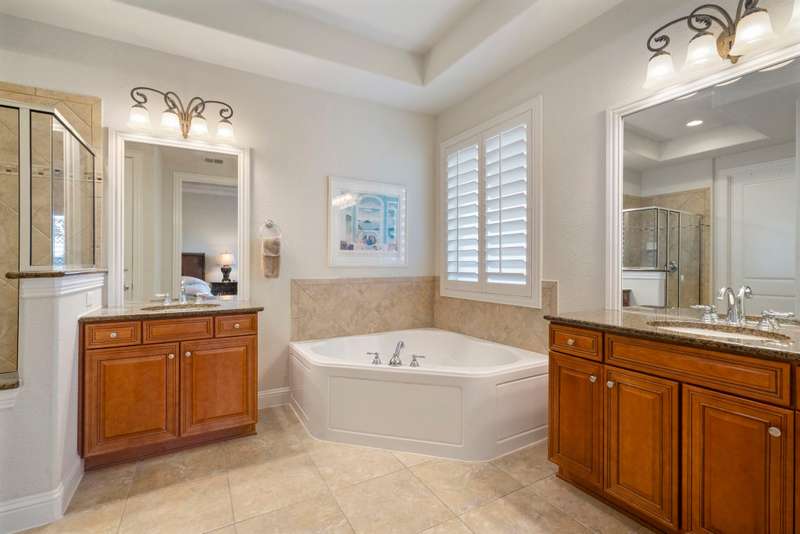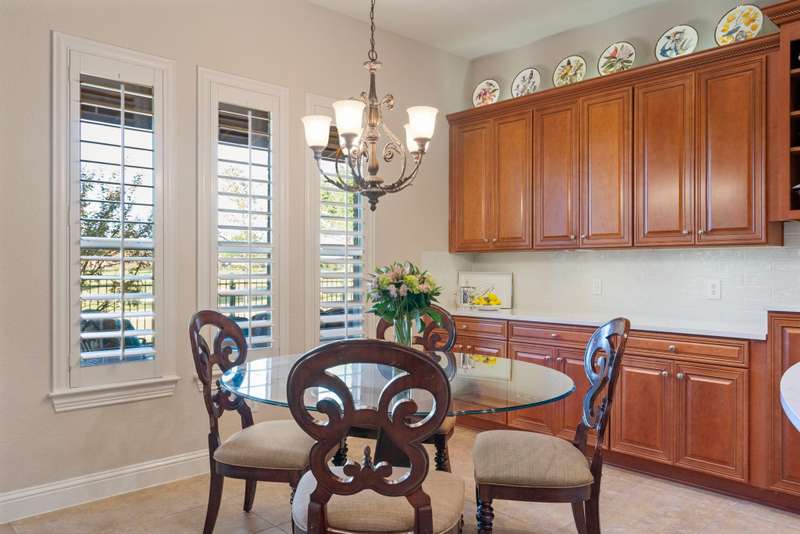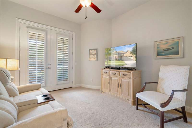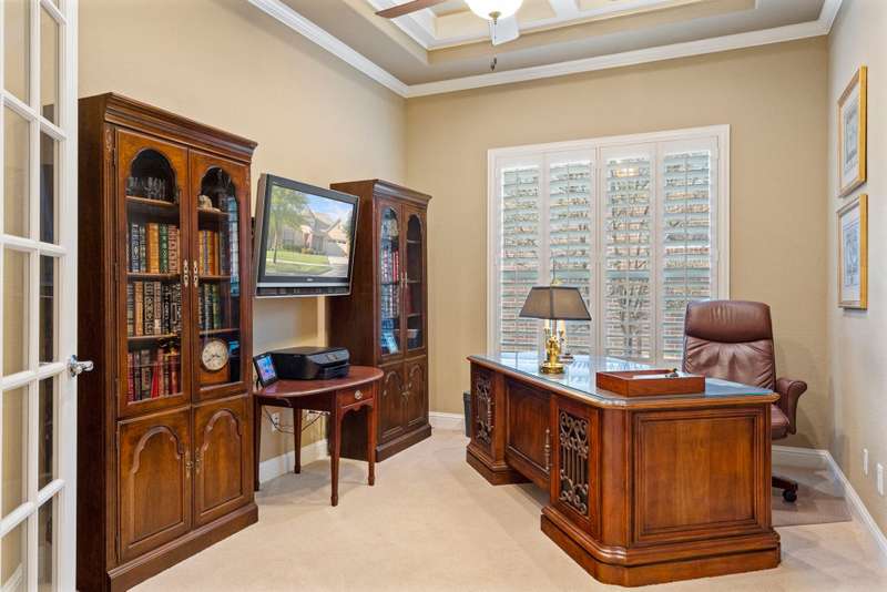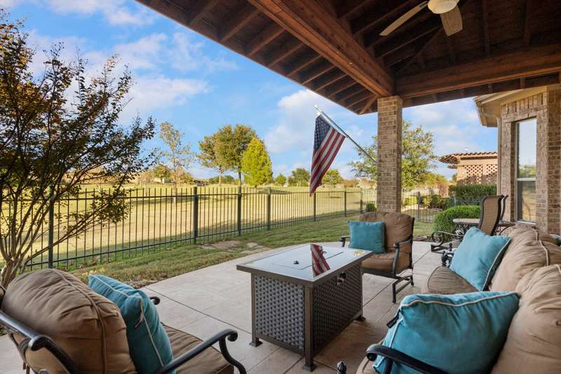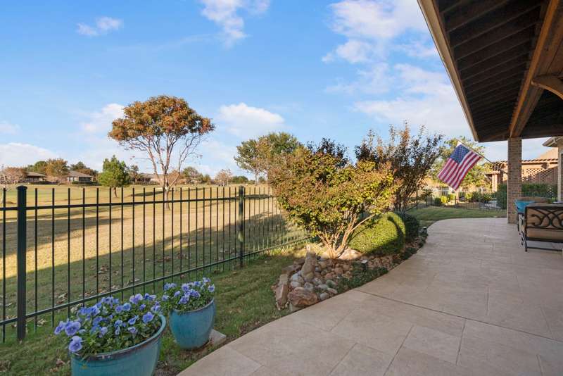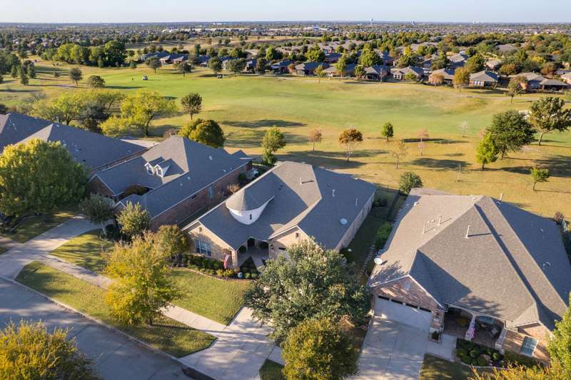 Discover luxurious golf course living in this beautifully appointed single-story home perfectly situated on Hole #1 of the Frisco Lakes Golf Course, offering stunning panoramic views and breathtaking evening sunsets with the cart path positioned on the opposite side for added privacy. The expansive covered outdoor living area is ideal for morning coffee, entertaining, or relaxing al fresco under the Texas sky. Inside, the thoughtfully designed floor plan features 3 bedrooms and 3 full baths located on separate wings, plus a private study with French doors. The spacious family room boasts a cozy gas-log fireplace, custom built-in entertainment center, and tile flooring, seamlessly connecting to the remodeled kitchen and breakfast nook. The gourmet kitchen is a showstopper with a counter-height quartz island, abundant cabinetry, built-in refrigerator, gas cooktop, double ovens, convection microwave, separate coffee bar, bar seating, and a walk-in pantry. The serene primary suite offers a generous seating area, dual closets, and a spa-like bath with dual vanities, jetted tub, and a walk-in shower. Plantation shutters adorn most windows, and the 3-car garage provides ample space for vehicles, golf cart and storage. New Water Heater 11-25, Roof Replaced 2017. Located in the vibrant 55+ community of Frisco Lakes, residents enjoy resort-style amenities including golf, tennis, pickleball, bocce ball, indoor and outdoor pools, fitness centers, walking tracks, gardening, billiards, libraries, and a full-service restaurant and bar at the golf clubmaking this home the perfect blend of elegance, comfort, and active living.