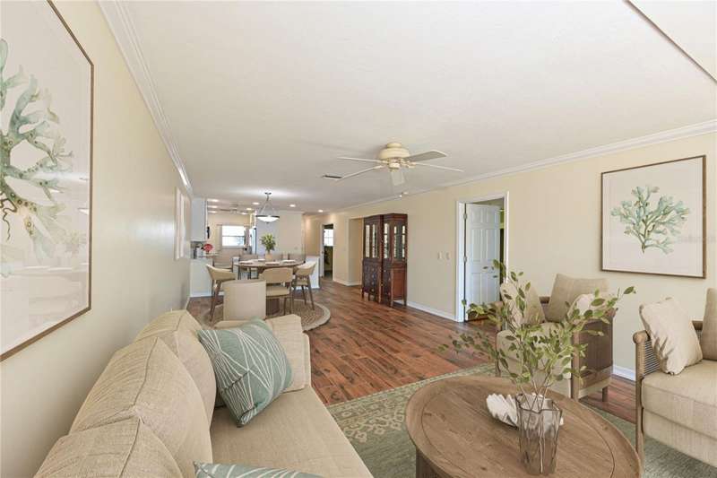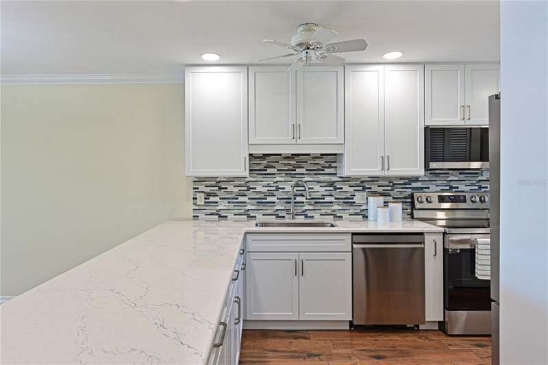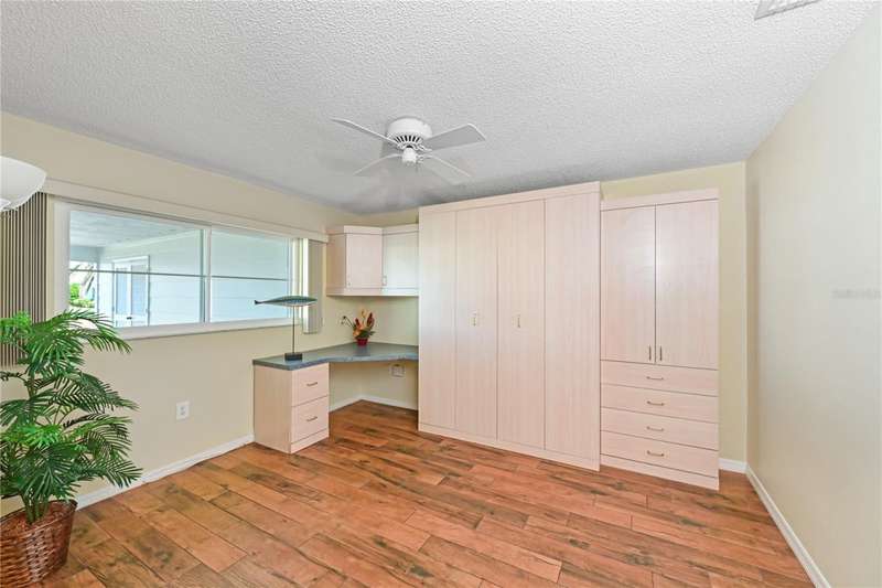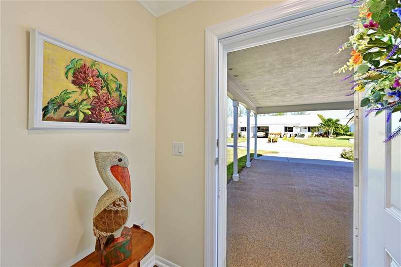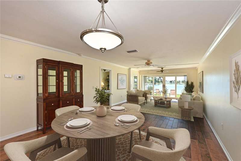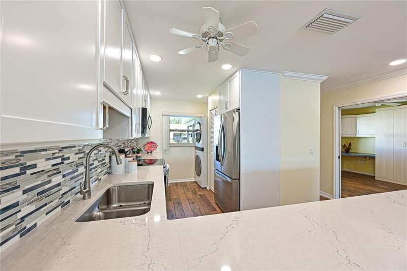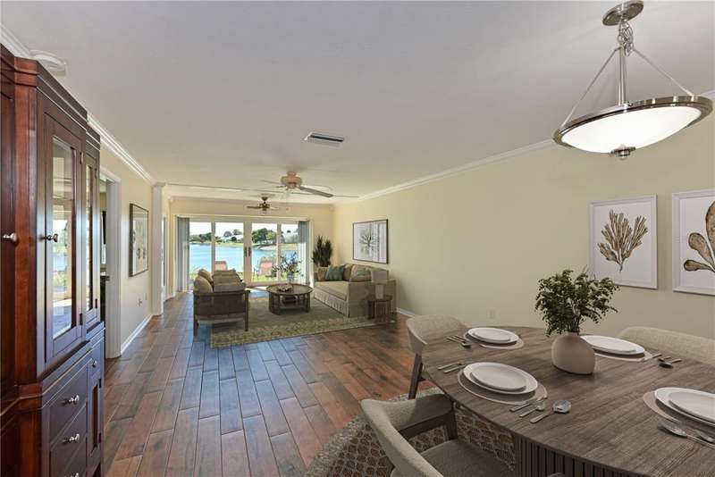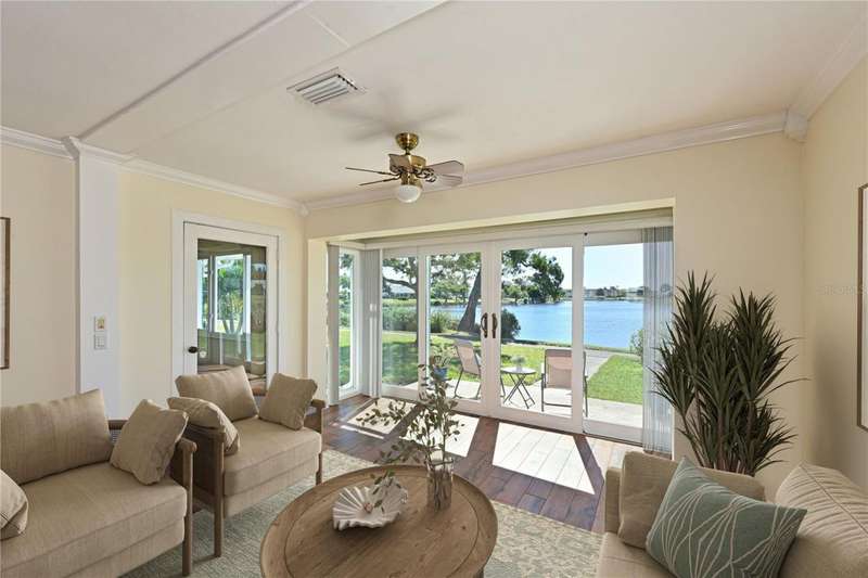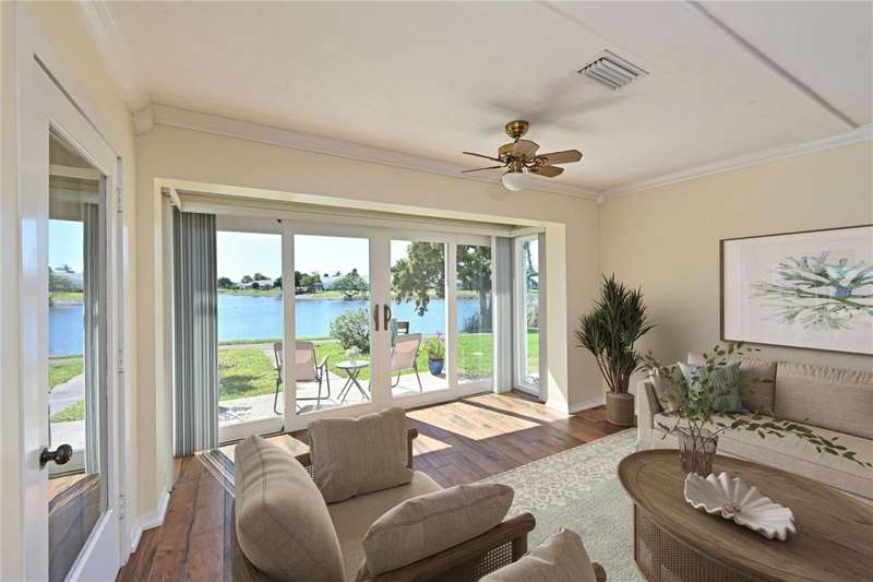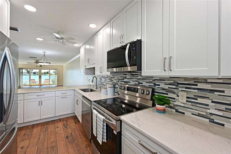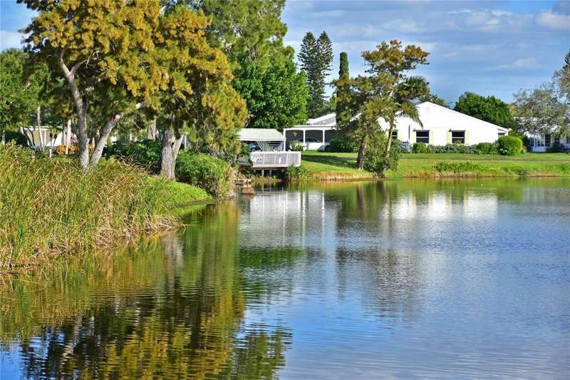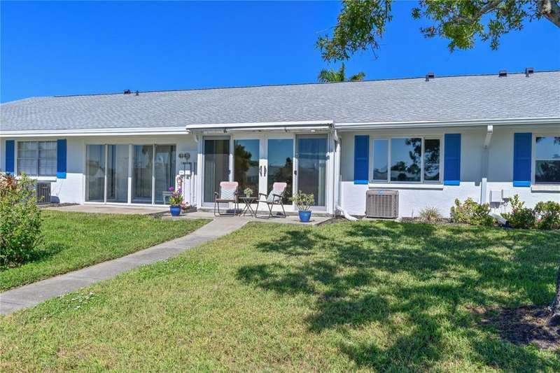 WELCOME TO YOUR NEW WATERFRONT OASIS! This lovely single-level villa offers a seamless blend of comfort, style & an unbeatable location in a vibrant bay & canal front community spanning nearly 90 acres of paradise. It's nestled on a quiet private street with no through traffic. MOVE-IN READY & RECENTLY UPDATED! Meticulously maintained & spotless, this villa features numerous upgrades for peace of mind & comfort. Highlights include a 2023 roof, 2019 impact windows & front door, 2016 impact sliding glass doors, a 2021 York HVAC system & a 2023 Rheem water heater, crown. Quality 6-panel doors & tile flooring runs throughout. You'll love the remodeled kitchen & bathrooms, one of which is handicap-accessible, along with the custom built-ins in the secondary bedroom, creating a versatile & functional space. BREATH-TAKING WATER VIEWS- From the moment you step through the door, you'll be captivated by sparkling water views that invite the outdoors in. Evenings bring the magic of stunning sunset skies reflected on the water, providing the perfect backdrop for relaxation & enjoyment. The villa's entertaining areas are quite spacious. PEACEFUL & INVITING OUTDOOR SPACES- This villa is designed for tranquility & connection with nature. Enjoy a serene front porch setting or unwind on the back patio overlooking picturesque views. Enjoy grilling your favorites for family & friends in either space. For those who love community interaction, a leisurely walk along the meandering paths will lead you to the clubhouse & a host of amenities. KITCHEN - Bright, airy & full of cheerful charm! Sleek Shaker-style cabinetry with soft-close doors & drawers offers abundant storage, including slide-out shelving, a spice pull-out & a built-in recycle center-all topped with stunning quartz countertops & a coordinating tile backsplash. Recessed LED lighting adds a modern touch. The closet pantry helps keep everything organized, while the premium LG stainless steel appliance suite-featuring a convection oven, French door refrigerator & quiet three-drawer dishwasher-enhances both style & function. You'll love the deep dual-bowl sink with a gooseneck faucet & the LG ThinQ washer/dryer stack tucked neatly in the corner adds everyday convenience. The peninsula is perfect for casual conversations as you prepare meals & best of all, you can enjoy stunning water views while you cook & entertain. THOUGHTFUL DESIGN FEATURES- The split-bedroom floor plan & abundant storage provide both privacy & practicality. PRIMARY SUITE- Tucked at the quiet back of the villa, the primary suite offers peaceful lake views & a spacious walk-in closet with attic access for additional storage. The ensuite bath includes a walk-in shower with updated tile surround, safety grab bars & a semi-frameless glass enclosure. The updated vanity features drawers & a convenient slide-out shelf to keep essentials organized & within easy reach. SECONDARY BEDROOM- Positioned up front is a flexible space with a wide pocket door! Built-in cabinetry features a desk with file drawers & overhead cabinets & a murphy bed & armoire. Perfect for your everyday use while providing guests a comfy place to stay. The adjacent bathroom is renovated to be handicap accessible including a curb less shower entry. ATTACHED CARPORT- Features permeable Polly-Pebble flooring & a 12' x 5' secure storage area, ideal for electric bikes, beach gear & sports equipment. COMMUNITY FEATURES- Just about everything. Come see for yourself today!