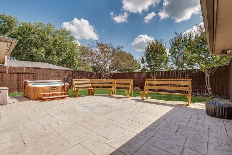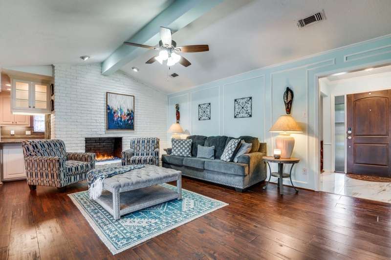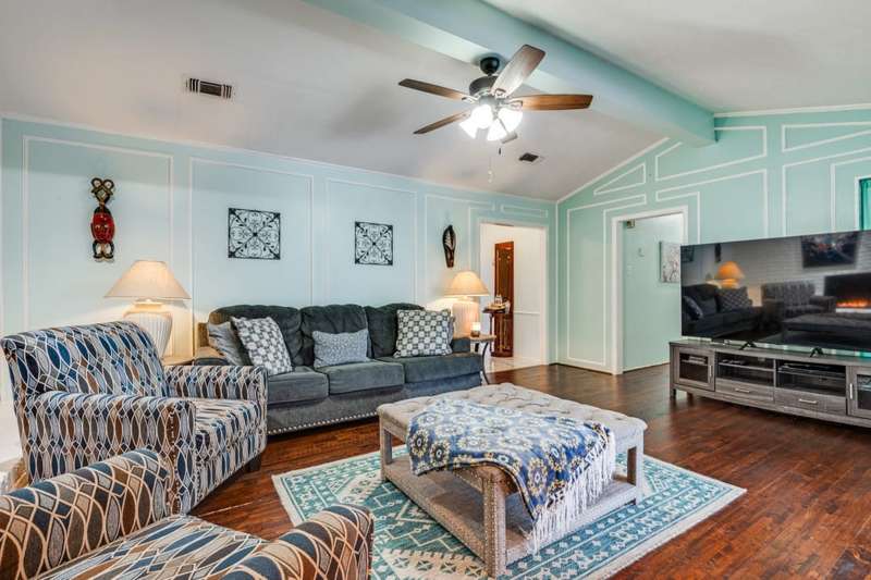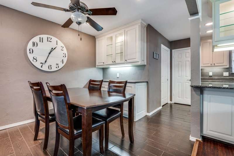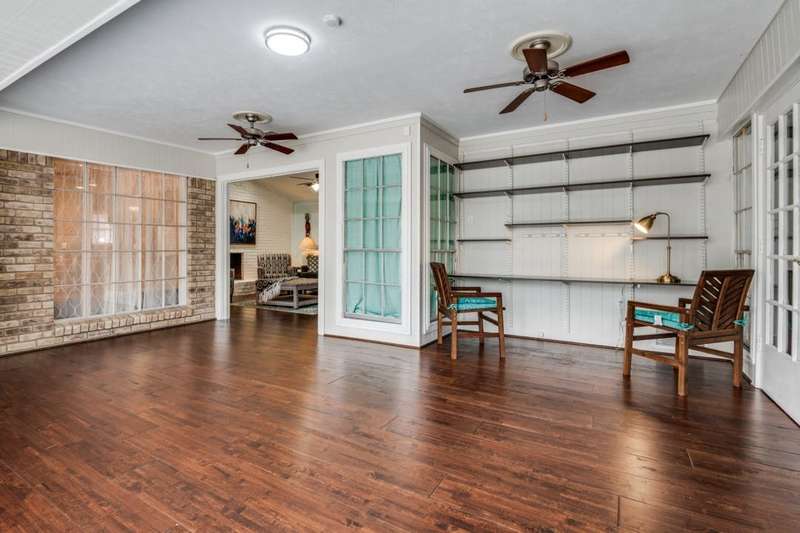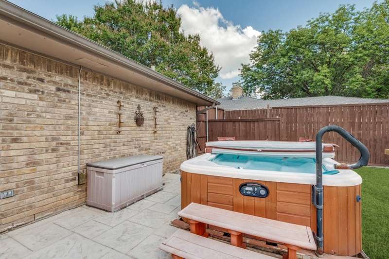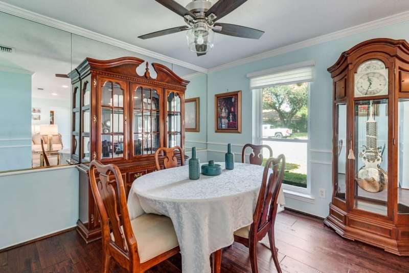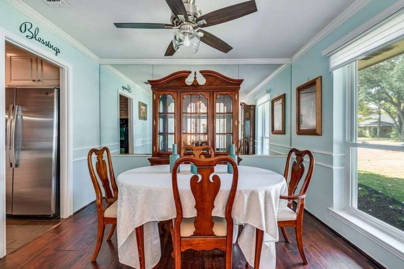 WELCOME HOME! This beautifully-maintained brick traditional blends comfort, functionality, and timeless style. With three spacious living areas and two dining spaces, theres room for both everyday living and effortless entertaining. Crown molding and a stunning bay window - complete with a custom-made electric blind - add a nice touch to the formal areas. The kitchen has been thoughtfully-updated with granite counter tops, a glass-tile back splash, recessed lighting, and ceramic tile flooring, and it features a 5-burner cook top, double oven, dishwasher, breakfast bar, and pantry. The cozy breakfast nook includes a built-in butlers pantry and is ideal for casual meals or your morning coffee. A large den - warm and inviting - is accented by a cathedral ceiling and has wood-burning fireplace, with gas starter. Much of the flooring in this home has been upgraded with beautiful hardwoods. The spacious sun room - with a wall of windows overlooking a lushly-landscaped backyard - invites natural light and serenity. Step outside to the over-sized patio and enjoy the hot tub, ideal for entertaining or winding down after a long day. All bedrooms in this home feature walk-in closets. The primary suite includes a private en-suite bath and features French doors that open to the sun room. A separate utility room accommodates a full-sized washer and dryer and includes extra shelving for added storage. Additional features include a porcelain-tiled foyer, an updated hall bathroom, a two-car, rear-entry garage with a widened driveway for up to three vehicles, guttering, and a side-yard storage shed. All exterior windows have been replaced. The HVAC and water heater were replaced in 2020. This home is in an established neighborhood filled with many mature trees. Great location, with easy access to I-35, local dining, shopping, and schools.
