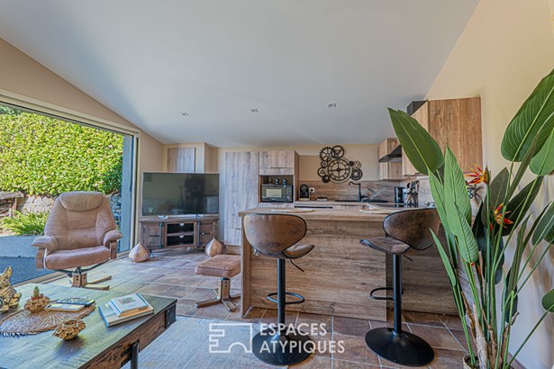The interior reveals elegant volumes. The dining room and living room, bathed in light, are fluidly arranged with a double height emphasizing the character of the place. The whole opens generously to the outdoors. The modern and functional kitchen guarantees quality services.