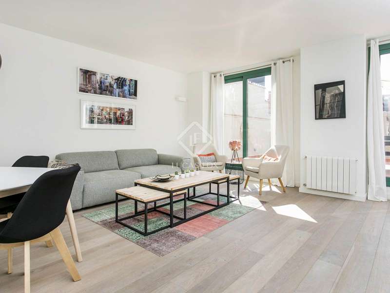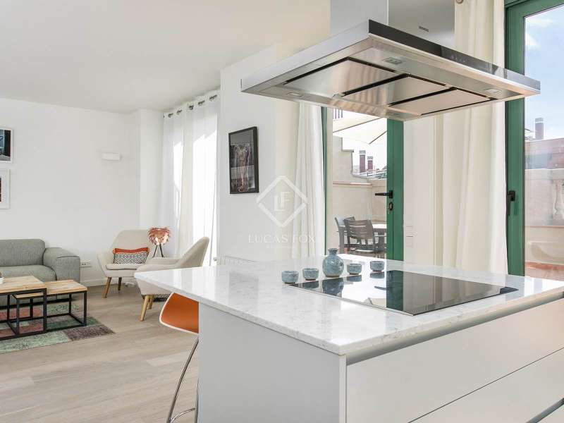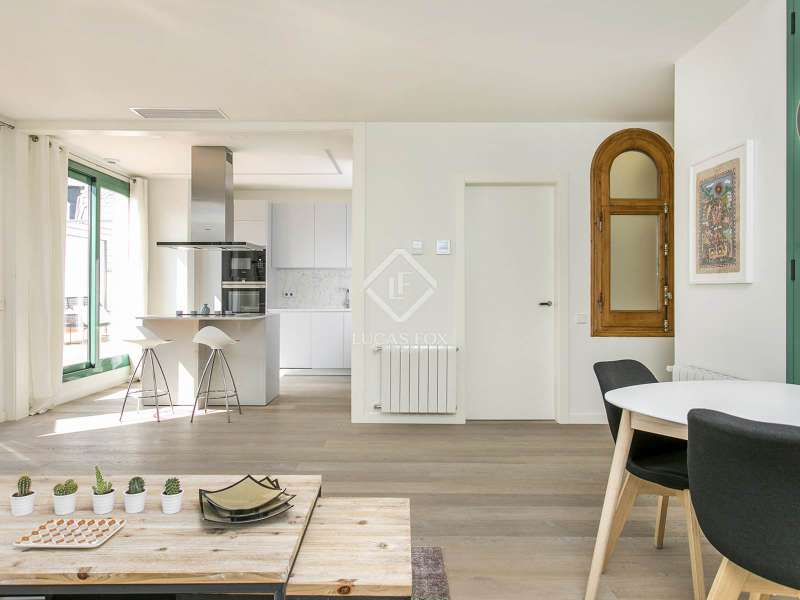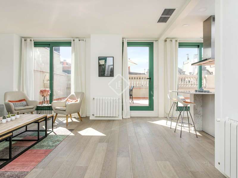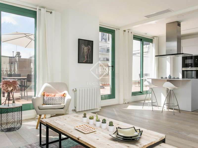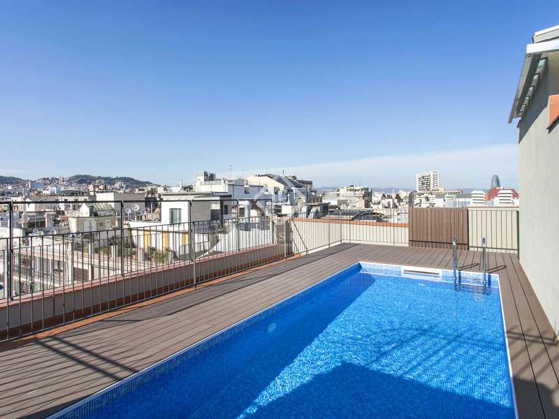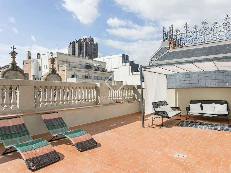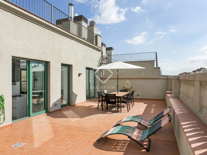 This exceptional penthouse is for sale on Casp Street, in a beautiful modernist building with concierge service, communal gym, and pool. It's just one street away from Passeig de Gràcia, in a very central and interesting area of Barcelona. The property boasts a 70m2 terrace. The apartment has been renovated, presenting itself in excellent condition. It features air conditioning, heating, built-in closets, wooden floors, and double-glazed windows. The entire property is decorated in bright whites with touches of green and enjoys plenty of natural light, creating a luminous and fresh atmosphere. The spacious open-plan living-dining area and fully equipped kitchen lead to the magnificent 70m² terrace with space for outdoor dining, sunbathing, or relaxing in the shade. There are 2 double bedrooms, the main one with a private bathroom and access to the terrace, and another double bedroom with its own separate bathroom. There is also a laundry room. Call us today to arrange a visit to this beautiful property in the center of Barcelona, with excellent private outdoor spaces and communal pool and gym facilities.