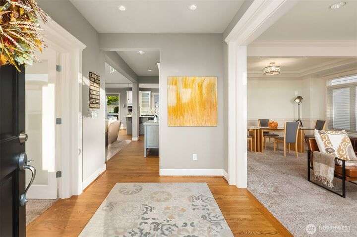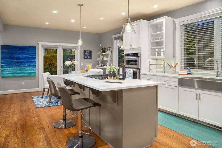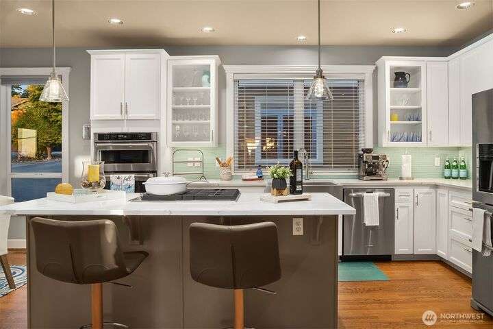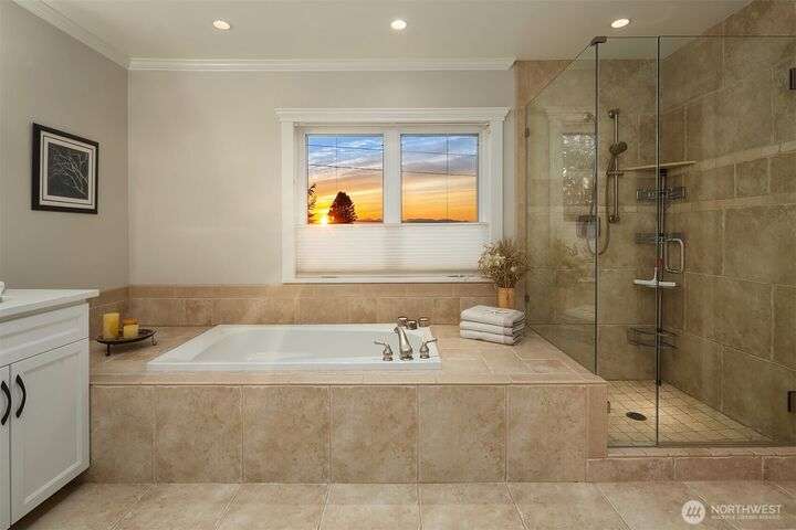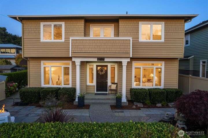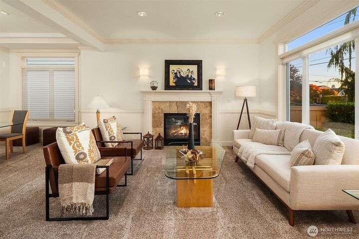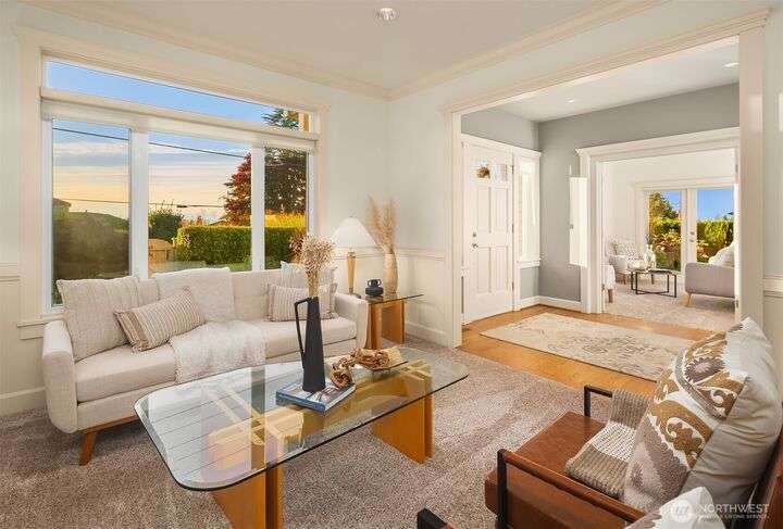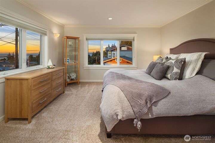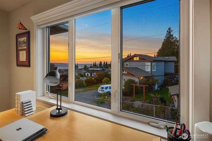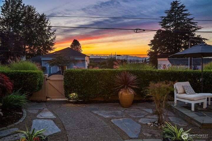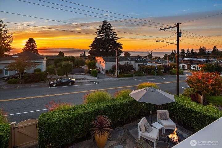 Edmonds Bowl West-facing 4-bed view home perched for privacy & sweeping sunset views. Blending timeless charm w/ modern livability. Thoughtful millwork, hardwoods & airy spaces w/ effortless flow. Soaring ceilings, walls of windows & built-in media center. Chef’s kitchen w/ large quartz island, SS appl & French doors to outdoor entertaining. Custom wine nook w/ quartz serving station. Formal dining & living w/ tray ceilings & gas fireplace. Multiple patios, firepit, lush mature landscaping & fully fenced yard. Luxe primary suite w/ Olympics, Whidbey & Sound views + spa-inspired 5-pc bath. All baths updated. $10k Smart Hunter Douglas blinds. Detached 2-car garage & ample parking. Walkable location near shops, dining, waterfront & ferry.