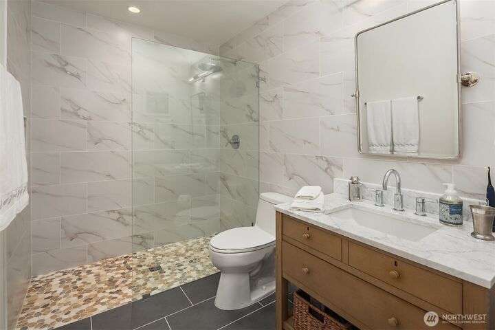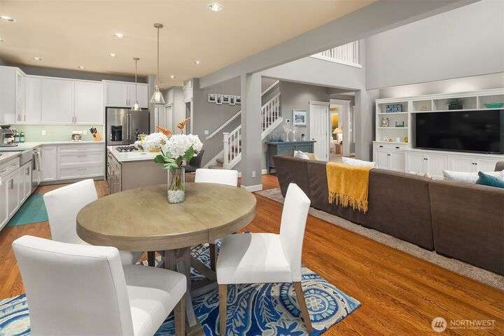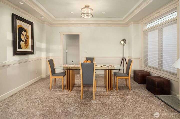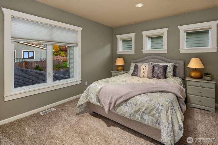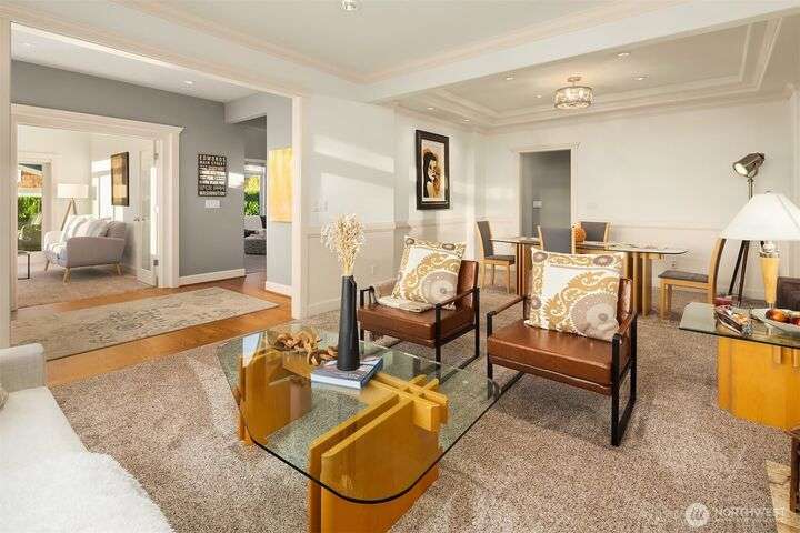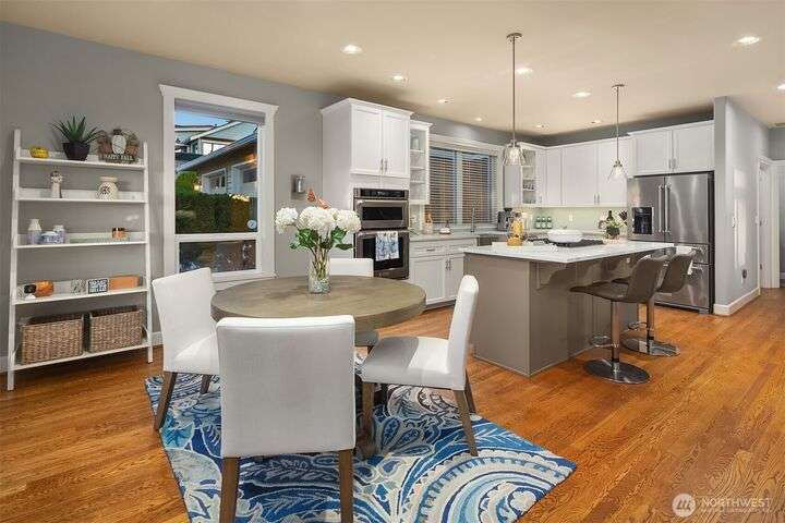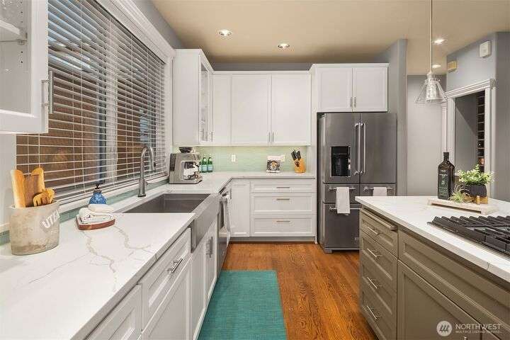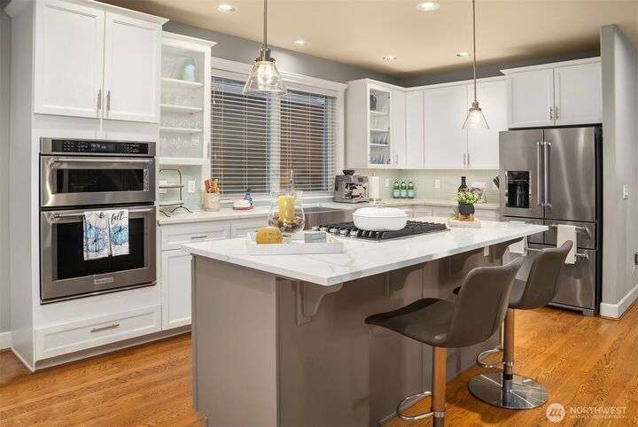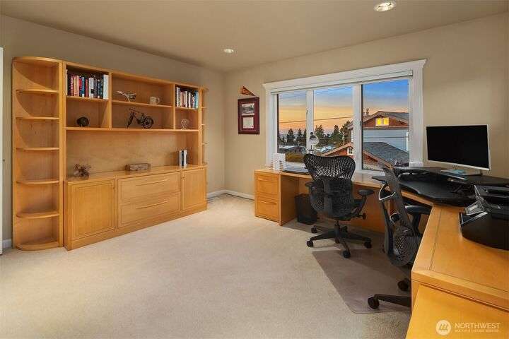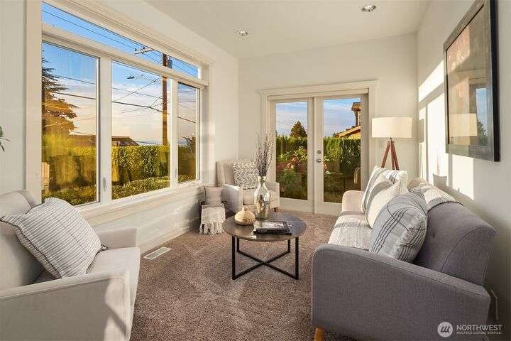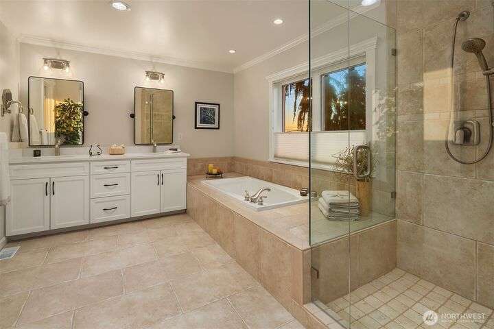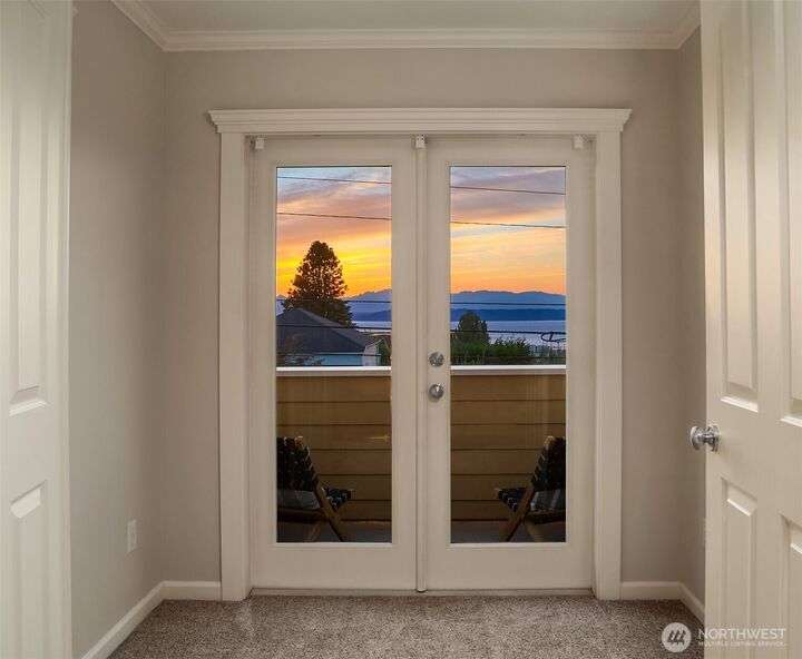Edmonds Bowl West-facing 4-bed view home perched for privacy & sweeping sunset views. Blending timeless charm w/ modern livability. Thoughtful millwork, hardwoods & airy spaces w/ effortless flow. Soaring ceilings, walls of windows & built-in media center. Chef’s kitchen w/ large quartz island, SS appl & French doors to outdoor entertaining. Custom wine nook w/ quartz serving station. Formal dining & living w/ tray ceilings & gas fireplace. Multiple patios, firepit, lush mature landscaping & fully fenced yard. Luxe primary suite w/ Olympics, Whidbey & Sound views + spa-inspired 5-pc bath. All baths updated. $10k Smart Hunter Douglas blinds. Detached 2-car garage & ample parking. Walkable location near shops, dining, waterfront & ferry.