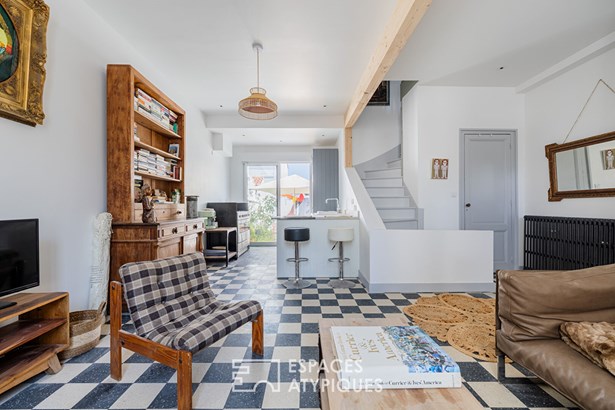 Designed to preserve its original character, the renovation highlights the qualities of small post-war Royan houses: high ceilings, vintage-patterned floors, and wooden floors. The ground floor features a welcoming living room with through-light, enhanced by a workshop-style glass roof.