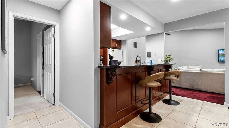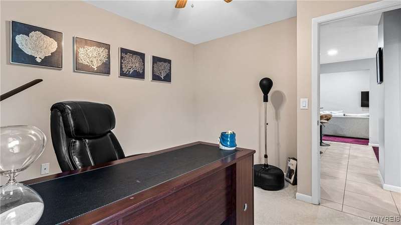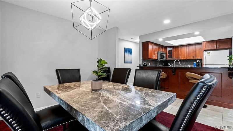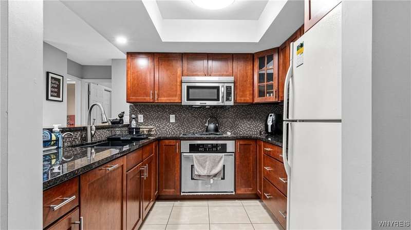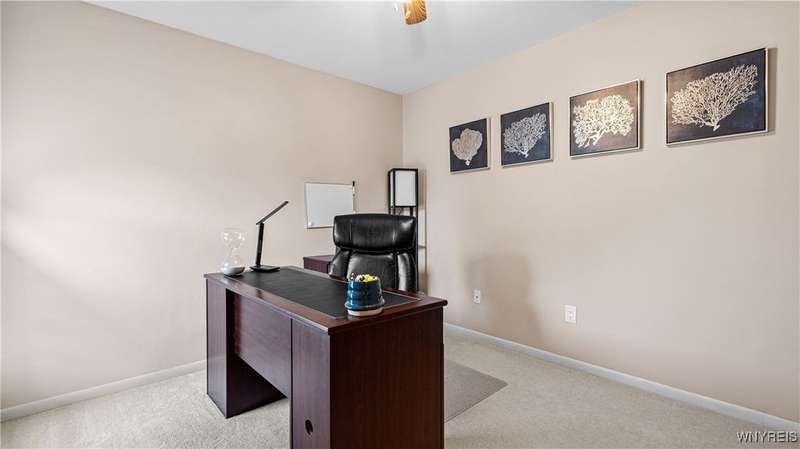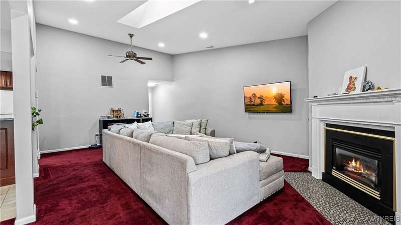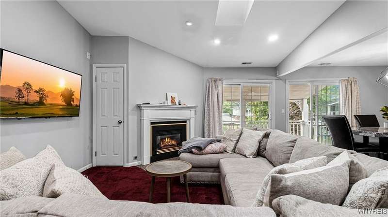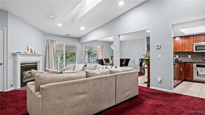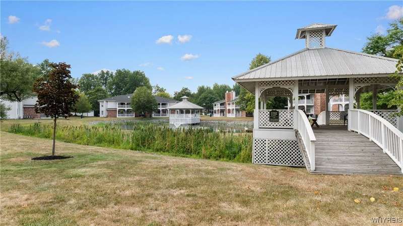 Watch the sunrise AND sunset! This beautiful Amherst condominium overlooks serene grounds, with fountain and pond. Updates include: Brand new, high-efficiency furnace / central AC (2025), lighting outlets and painting throughout (2025), opened/renovated living room and granite kitchen, carpets, and master ceramic bathroom. Relax on your covered, freshly painted porch, or in well-lit, vaulted living room. Gas fireplace. Overhead lighting throughout. All (highly functional) appliances stay. Property also listed for rent ML# B1632668