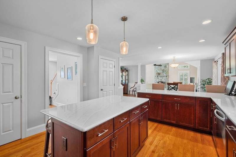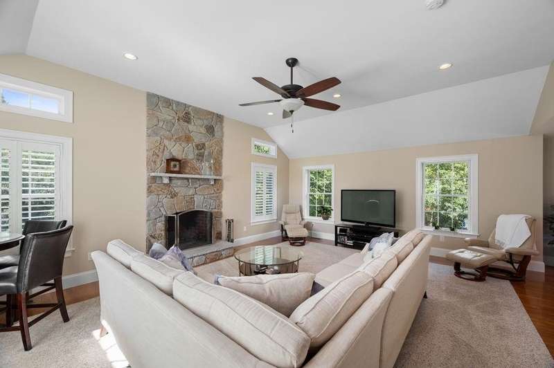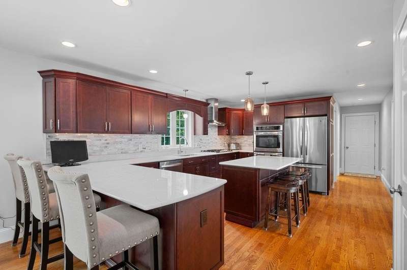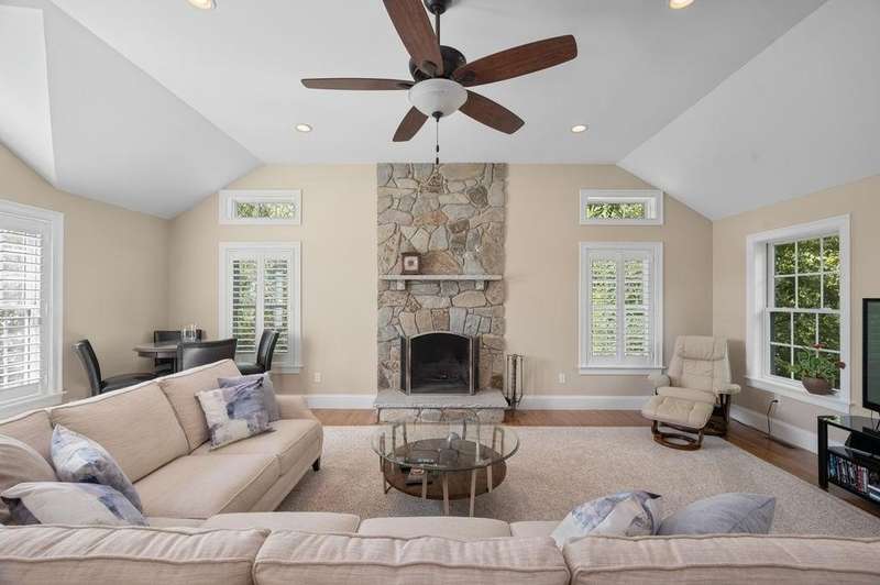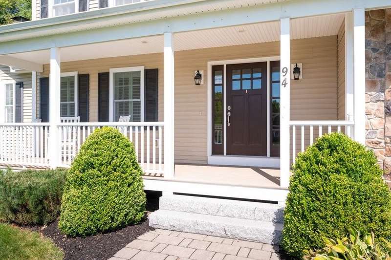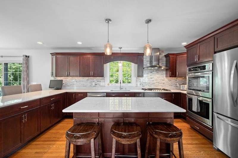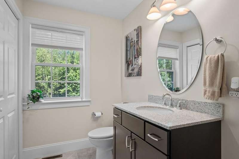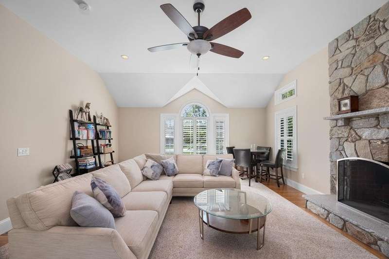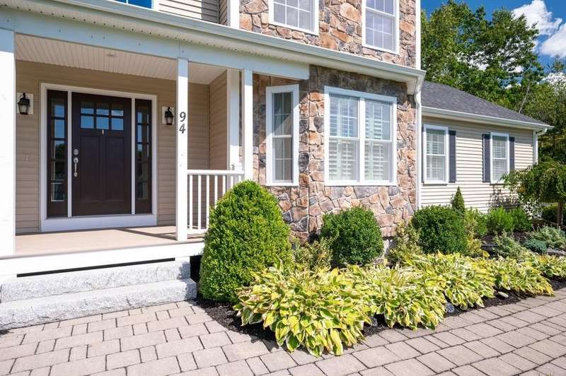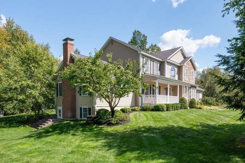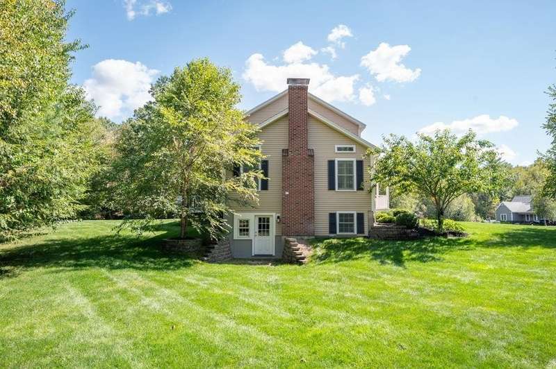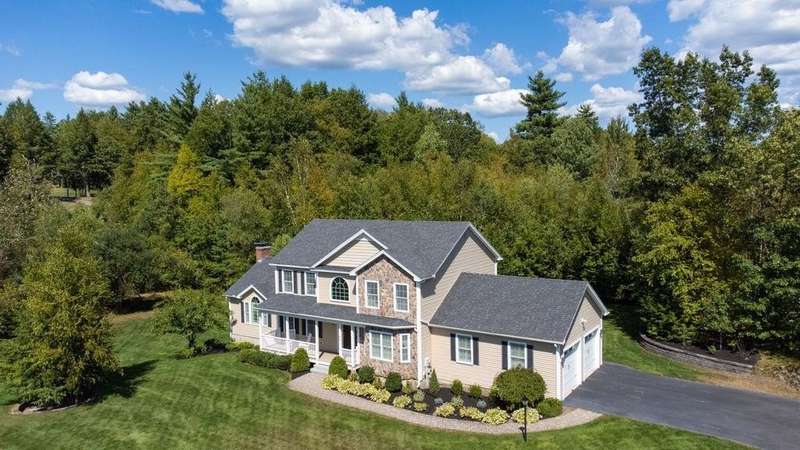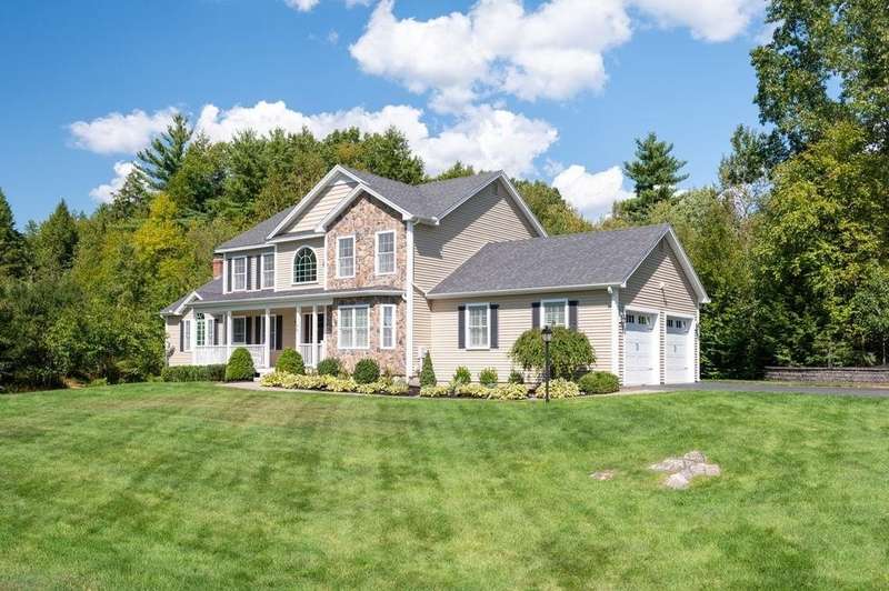 This stunning 3-bedroom, 2.5-bath Colonial offers the perfect blend of elegance, comfort, and functionality. Set on a beautifully landscaped lot surrounded by mature trees, the home provides both privacy and a welcoming curb appeal. Step inside to find a bright and spacious living room with soaring ceilings, a cozy fieldstone fireplace, and abundant natural light from oversized windows. The gourmet kitchen is a true centerpiece, complete with rich cherry cabinetry, quartz countertops, stainless steel appliances, double wall ovens, and a large island with seating—perfect for entertaining or casual meals. Upstairs, you’ll find generously sized bedrooms including a primary suite with ample closet space and a spa-like ensuite. The flexible floor plan allows for both formal and informal living, with plenty of room for work-from-home or extended guest stays. The finished basement expands your living options, offering the ideal space for a home theater, gym, playroom, or guest area—whatever fits your lifestyle best. Enjoy peaceful mornings on the farmer’s porch, afternoons in the private backyard, and evenings by the fire in your inviting living space. A two-car garage and well-maintained systems complete this move-in ready home. Located in a desirable neighborhood close to local amenities, this property combines modern updates with timeless New England charm.