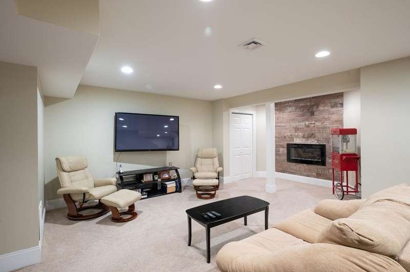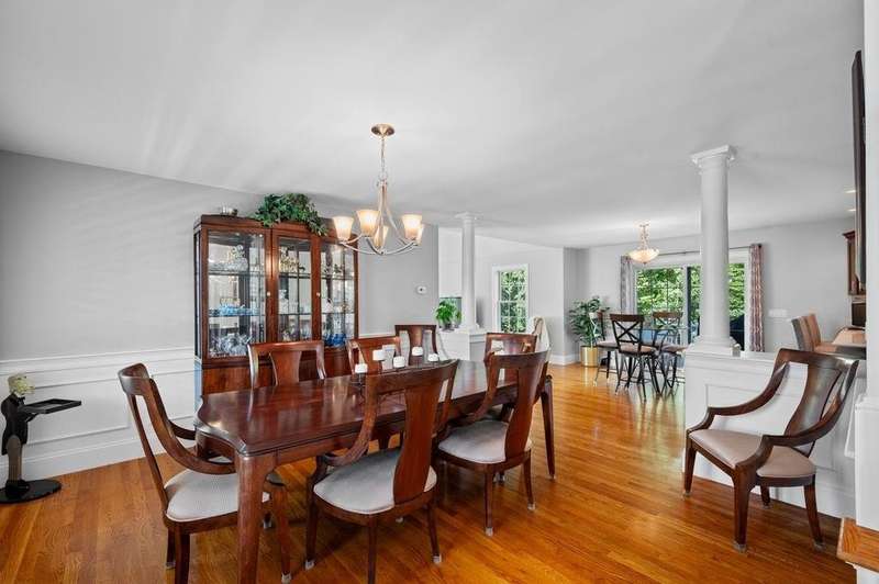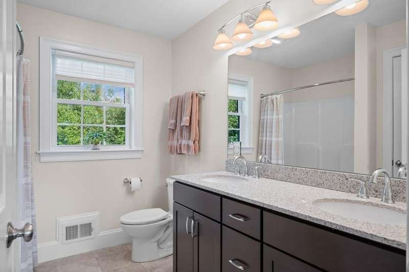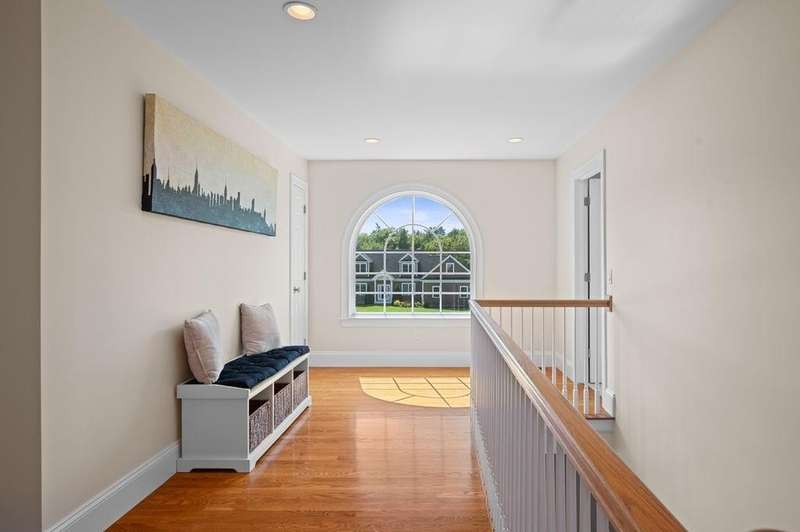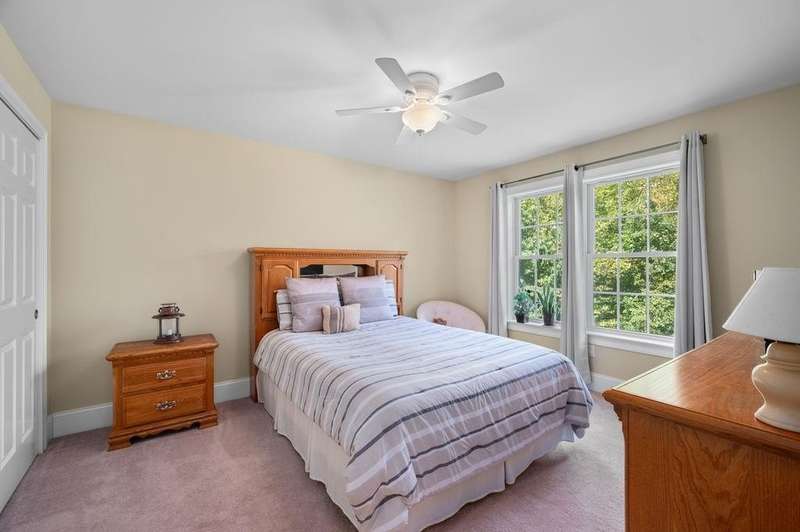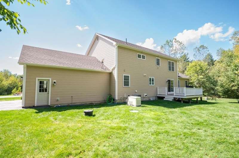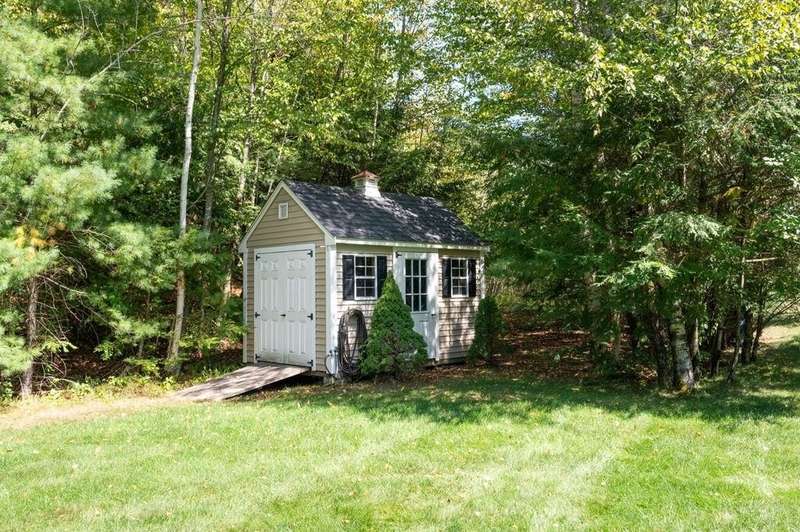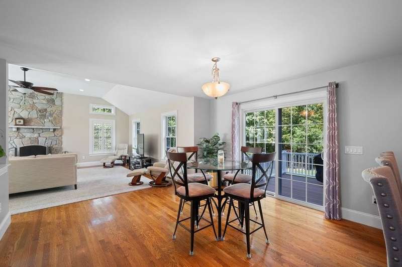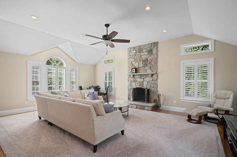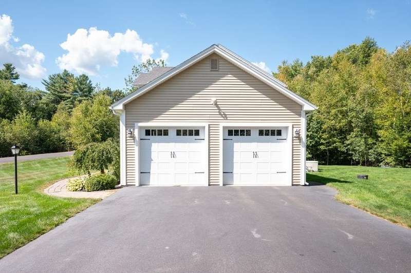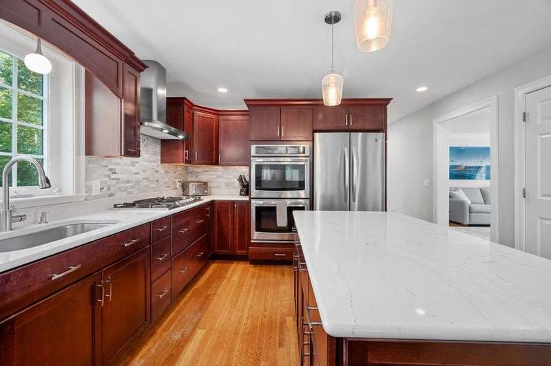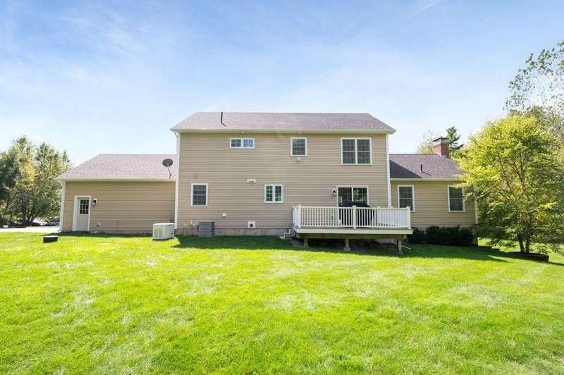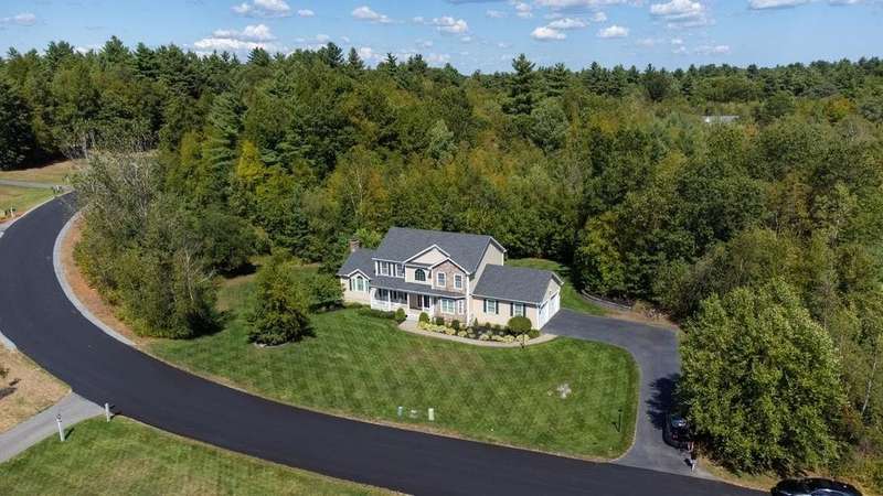 This stunning 3-bedroom, 2.5-bath Colonial offers the perfect blend of elegance, comfort, and functionality. Set on a beautifully landscaped lot surrounded by mature trees, the home provides both privacy and a welcoming curb appeal. Step inside to find a bright and spacious living room with soaring ceilings, a cozy fieldstone fireplace, and abundant natural light from oversized windows. The gourmet kitchen is a true centerpiece, complete with rich cherry cabinetry, quartz countertops, stainless steel appliances, double wall ovens, and a large island with seating—perfect for entertaining or casual meals. Upstairs, you’ll find generously sized bedrooms including a primary suite with ample closet space and a spa-like ensuite. The flexible floor plan allows for both formal and informal living, with plenty of room for work-from-home or extended guest stays. The finished basement expands your living options, offering the ideal space for a home theater, gym, playroom, or guest area—whatever fits your lifestyle best. Enjoy peaceful mornings on the farmer’s porch, afternoons in the private backyard, and evenings by the fire in your inviting living space. A two-car garage and well-maintained systems complete this move-in ready home. Located in a desirable neighborhood close to local amenities, this property combines modern updates with timeless New England charm.