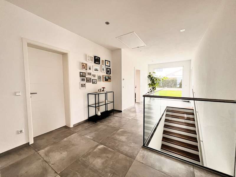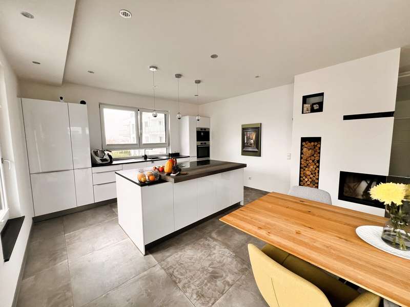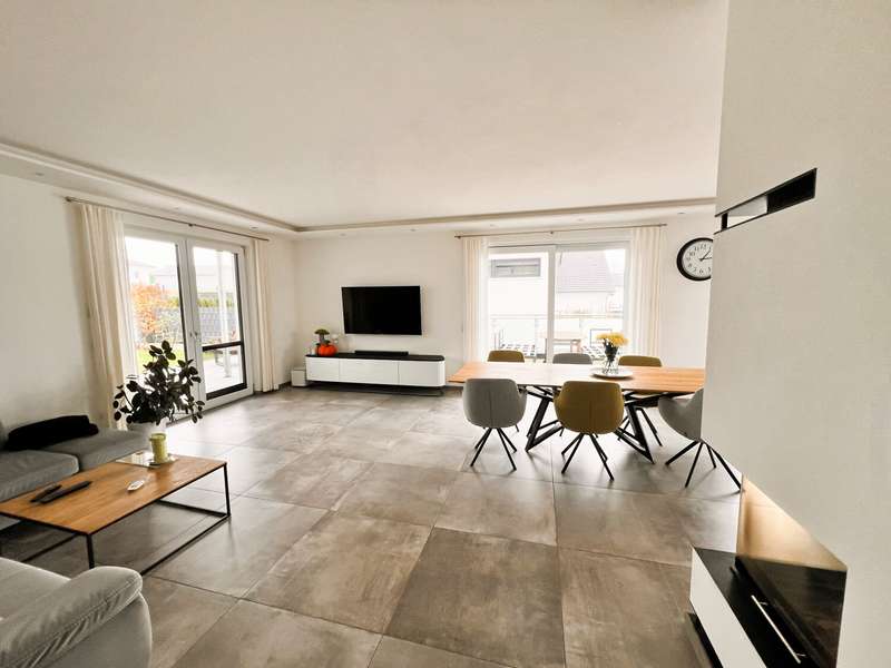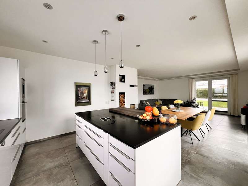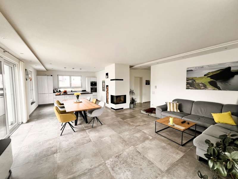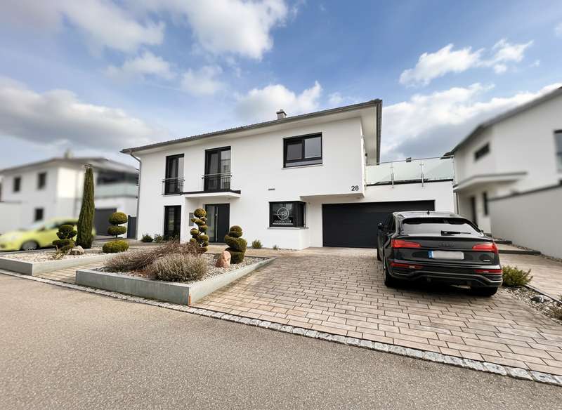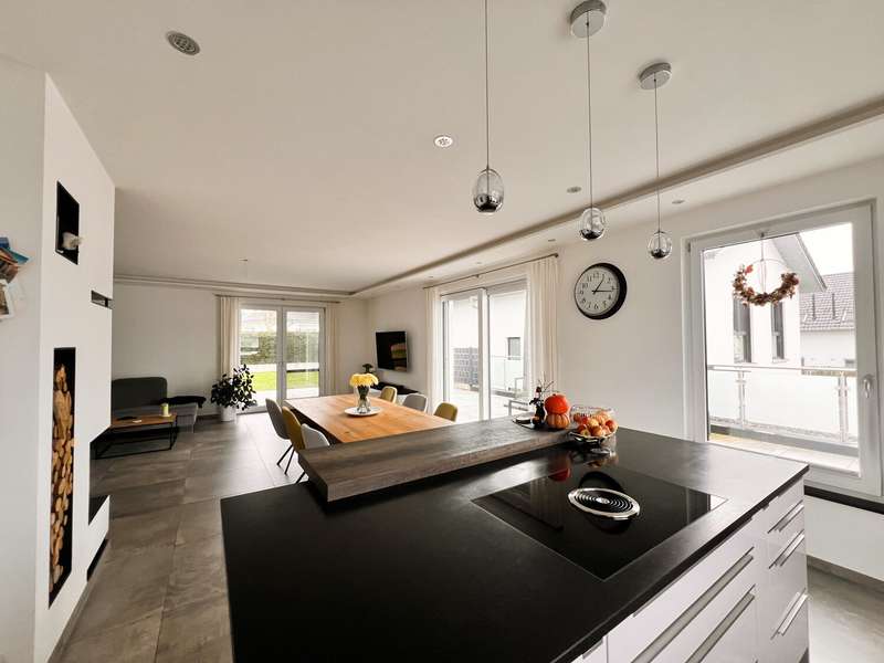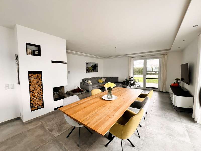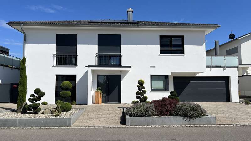 This high-quality domicile impresses with its spacious room concept and is ideal for families and discerning living requirements. With a total of five bedrooms and a living space of around 220 square meters, the property impresses with its well thought-out room layout, modern technical equipment and its extremely attractive location in Bad Waldsee. The entrance area is open and inviting. From here, you can access several spacious rooms that can be used flexibly as children's rooms, home offices or guest rooms. There is also a bathroom on this level as well as a utility room with space for a washing machine, dryer and additional storage space. The adjoining garage provides dry access directly into the house. The heart of the house is the central living area, which is accessed via a modern staircase. It opens up to the spacious, open kitchen, equipped with high-quality fixtures and fittings and modern electrical appliances. An elegant wood-burning stove lends the spacious living and dining area a cozy atmosphere. From the kitchen and living area, the path leads into the lovingly landscaped garden. Spacious terrace areas invite you to relax and socialize. Further bedrooms and a luxuriously equipped bathroom await you on the same level. The master bedroom also has an adjoining dressing room. Throughout the house, elegant floor coverings, large windows and innovative building services ensure a modern and comfortable living experience. The photovoltaic system with an output of 9.66 kWp installed in 2021 makes a significant contribution to sustainable energy supply. This not only lowers energy consumption, but also permanently reduces operating costs. A spacious double garage and several outdoor parking spaces are available for vehicles. The location of the house scores points for its proximity to shopping facilities, schools, nurseries and a wide range of leisure activities. Thanks to the good transport links, you can reach both the city center and the surrounding regions quickly and easily. This property combines contemporary living comfort with modern furnishings and a well-balanced room layout. Come and see the numerous quality features of this house for yourself during a personal viewing. If you have any questions or would like to arrange an individual appointment, please do not hesitate to contact us at any time.