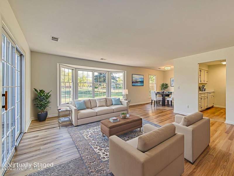 Sunny and bright describes this sweet Ranch condo in Three Meadows subdivision overlooking Three Meadows Park with fishing ponds, playground and walking trails. Open living/dining room and kitchen with newer laminate floors, large bay window and sliding door to private patio. 2 beds with newer laminate floors-primary with double closets. Updated bath with walk in shower. Fresh paint throughout.
