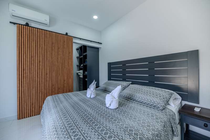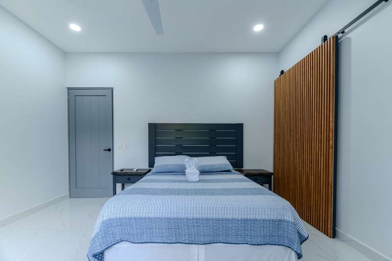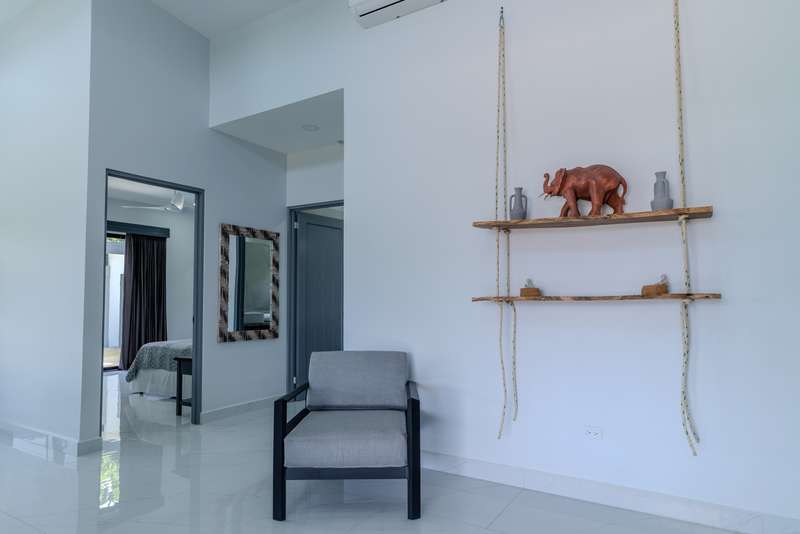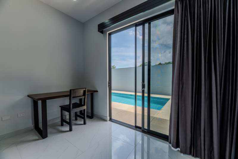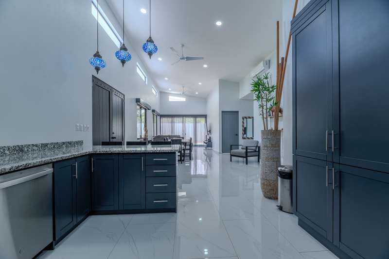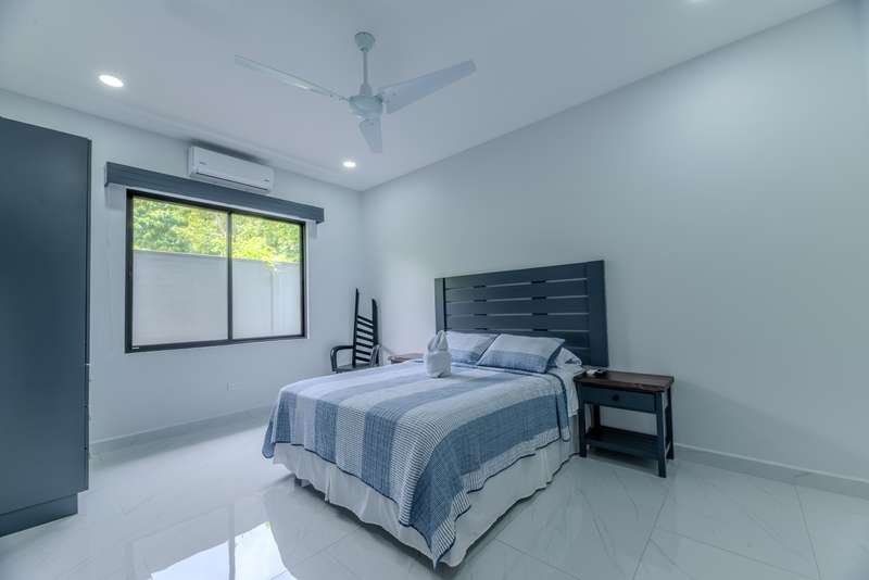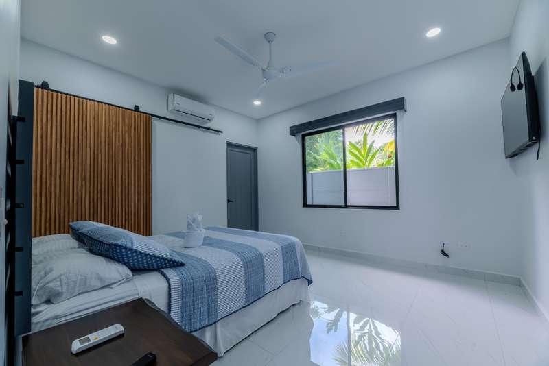 La propiedad cuenta con tres habitaciones y tres baños completos, incluyendo dos dormitorios principales. La habitación principal tiene acceso directo al área de la piscina, perfecta para empezar el día con un baño o relajarse por la noche. El diseño de concepto abierto y los techos altos favorecen la ventilación natural y la amplitud en todos los espacios.