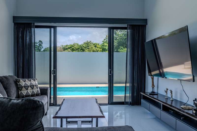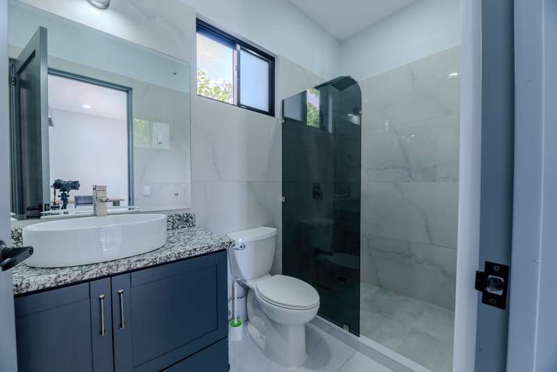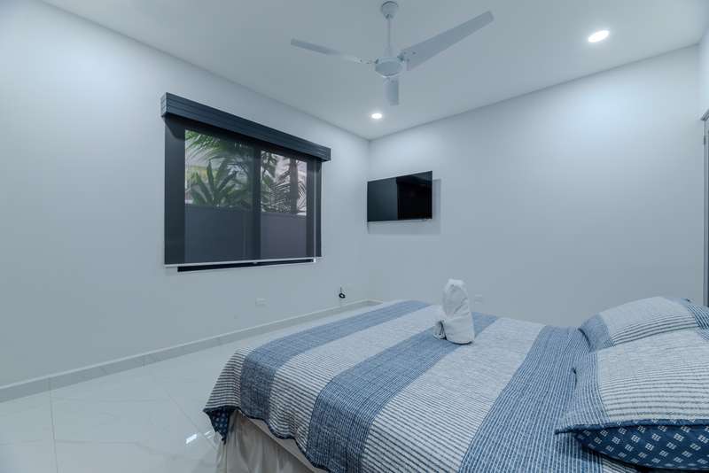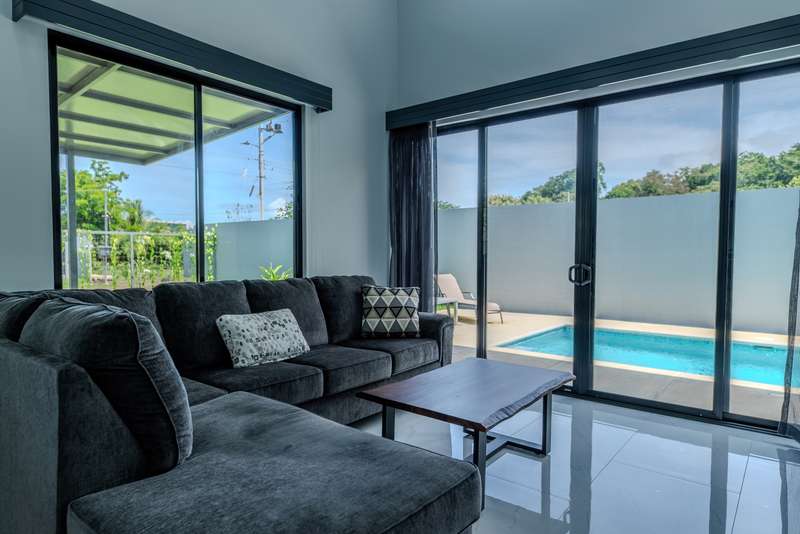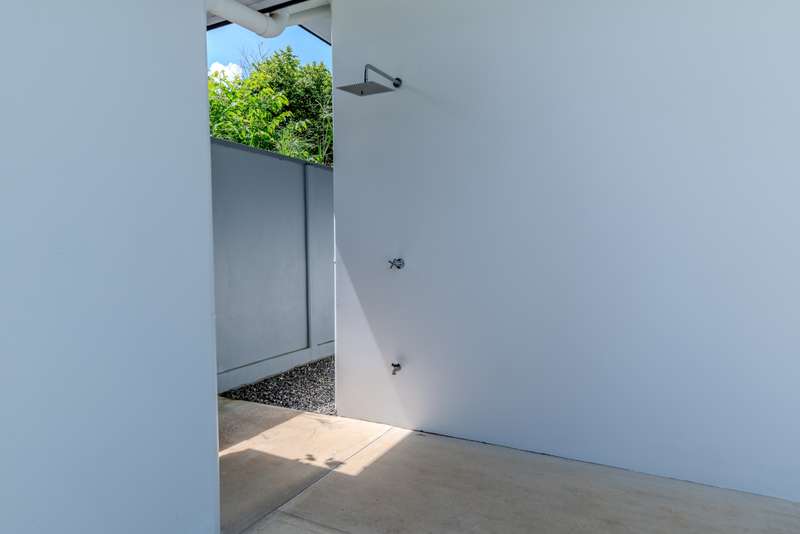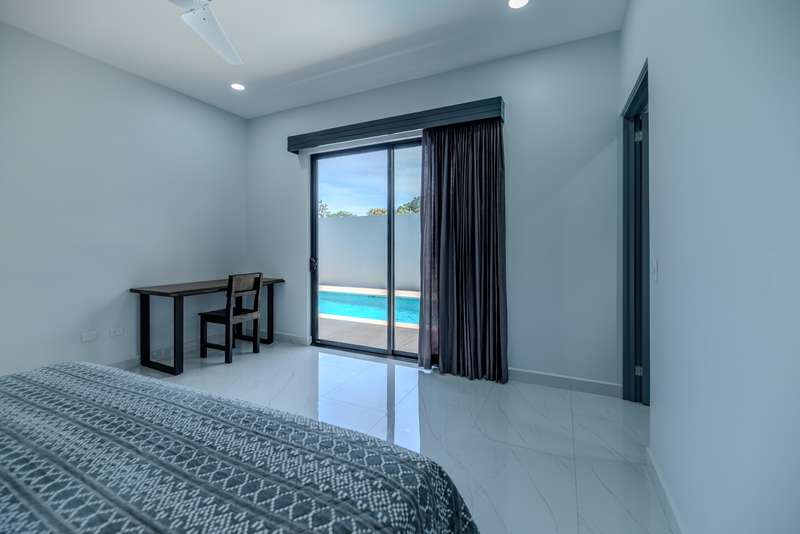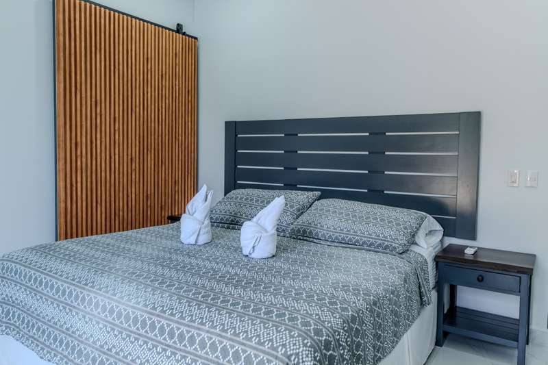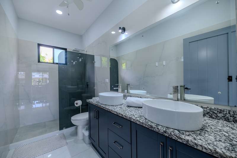 La propiedad cuenta con tres habitaciones y tres baños completos, incluyendo dos dormitorios principales. La habitación principal tiene acceso directo al área de la piscina, perfecta para empezar el día con un baño o relajarse por la noche. El diseño de concepto abierto y los techos altos favorecen la ventilación natural y la amplitud en todos los espacios.