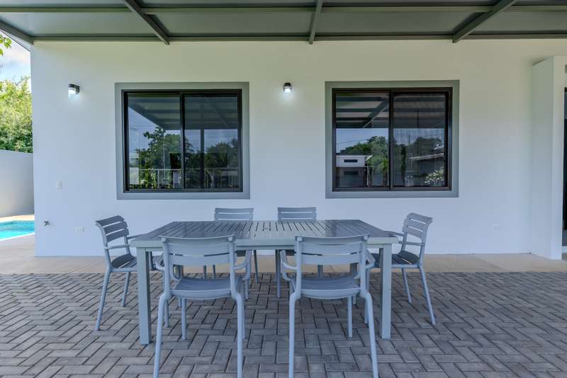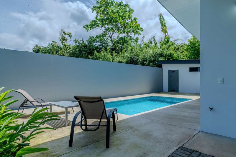The covered outdoor area is well-suited for dining, lounging, or entertaining, with a concrete and tile pool as the central feature. It’s a great space to enjoy Costa Rica’s warm days, cool breezes, and peaceful nights.