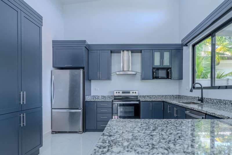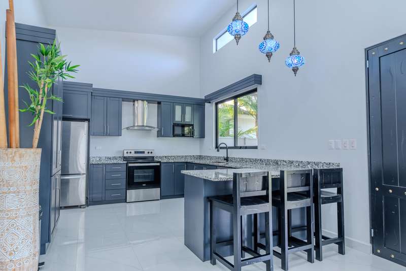 The kitchen is both functional and stylish, equipped with granite countertops, a central island, quality appliances, and custom wood cabinetry. Ceramic flooring with a polished stone look ties the spaces together and is easy to maintain in the tropical climate.