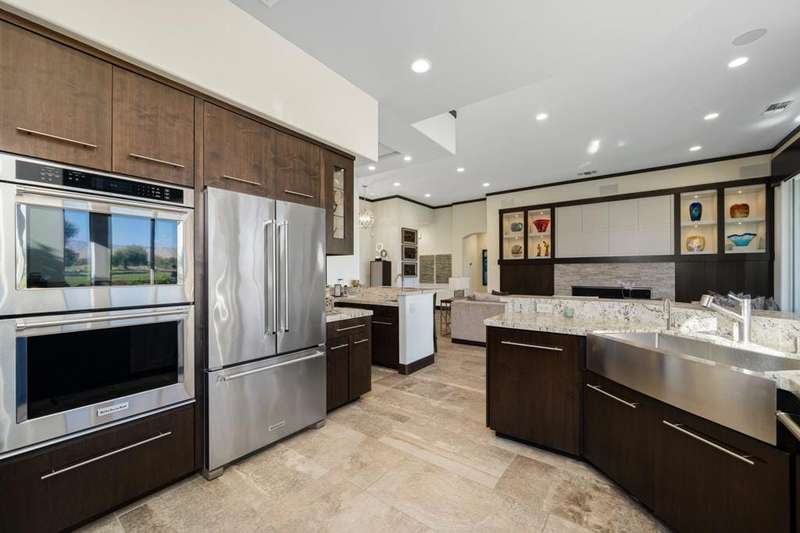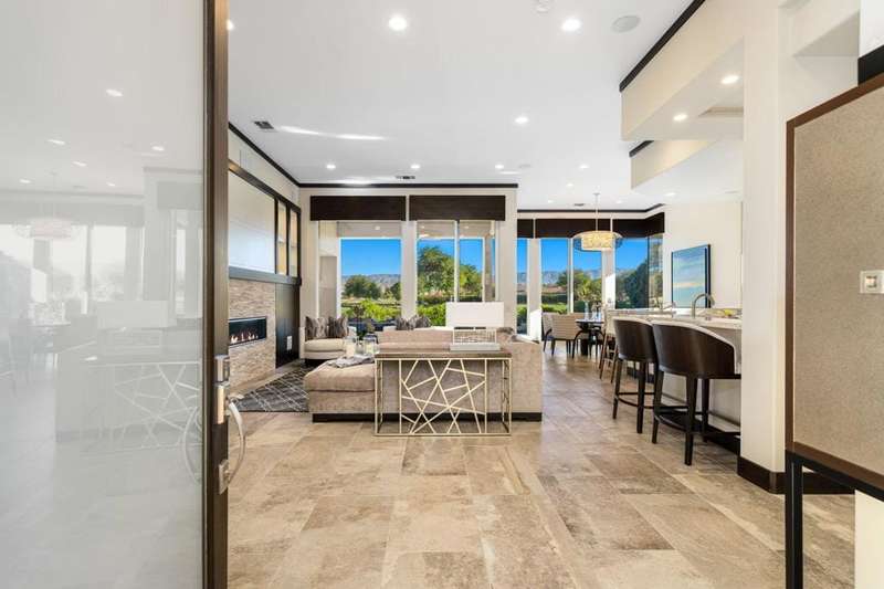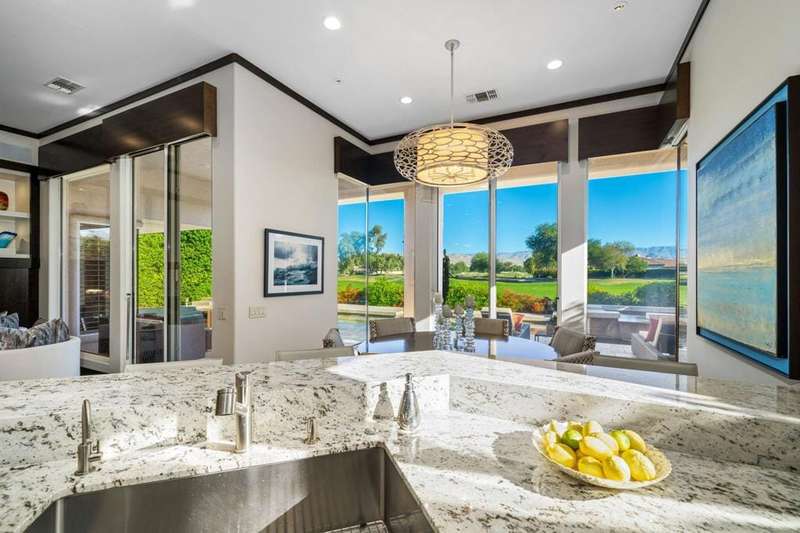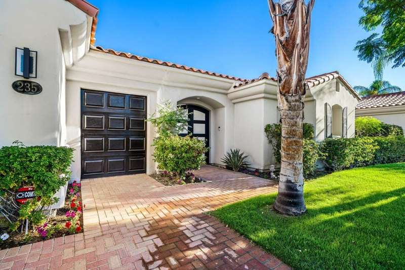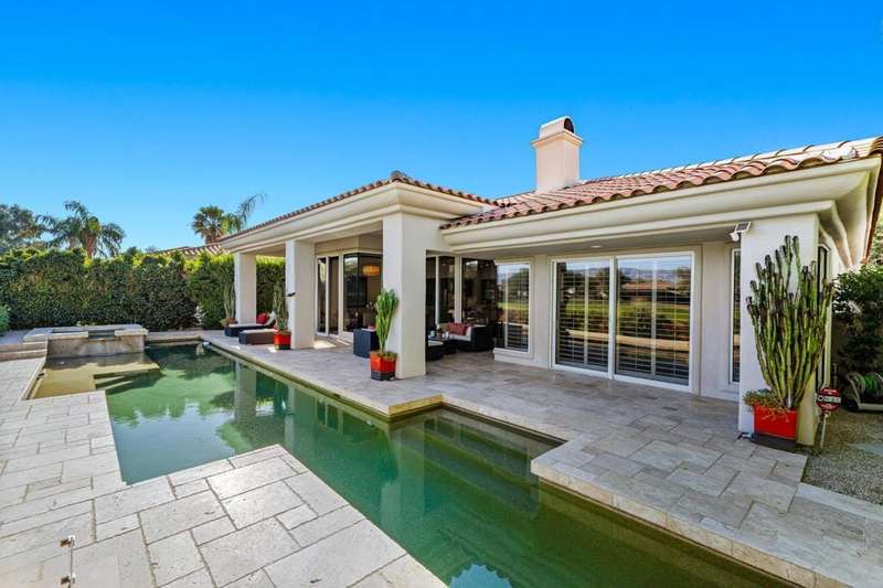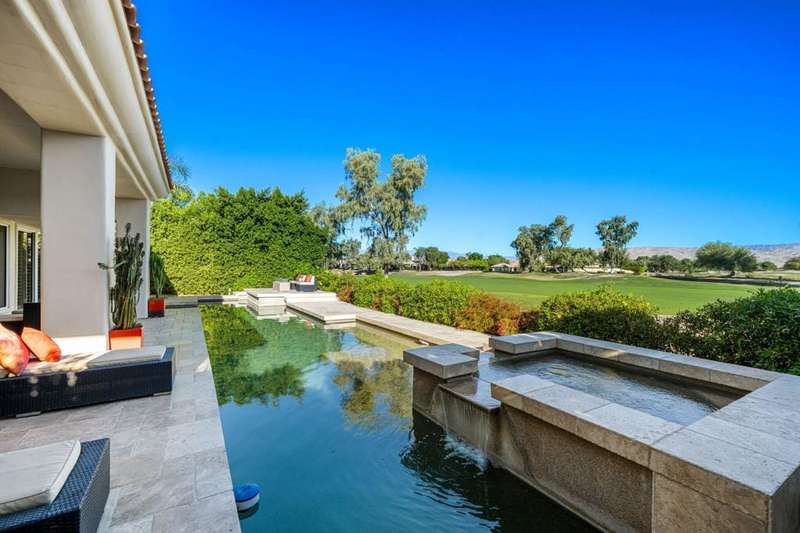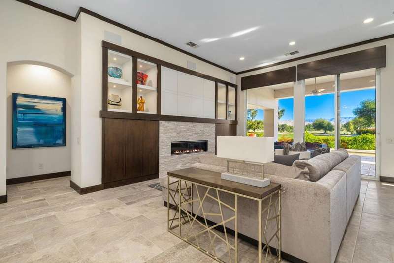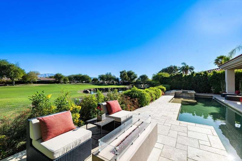 Stunning Contemporary Update of popular Legacy Open Great Room Floorplan with mountain, lake and fairway views and great outdoor living with lap pool. Enter a gated courtyard with outdoor living area and contemporary glass door entry. Open Great Room, Kitchen and Dining complete with entertainer's wet bar, fireplace and walls of glass with amazing views. Social Kitchen features quartz countertops, stainless appliances, counter seating and Dining area with views. Interiors by noted designer including custom tile flooring. Primary Suite features access to pool and spa terrace and more views together with updated spa bath with quartz and marble finishes. One guest suite in house featuring ensuite bath and a Detached Casita are perfect for friends and family. Den/Office with french doors to the courtyard can be a second guest bedroom in house with custom powder room nearby. Outside is a covered outdoor living room, pool and spa, updated expansive terraces with stone flooring, fire pit, bbq area and views of the mountains, fairways and lake. Legacy HOA includes Mission Hills Country Club social/fitness membership. Furniture Negotiable, so could be ready for a season in the sun - Come home to your desert retreat!