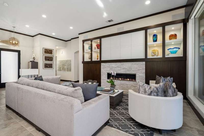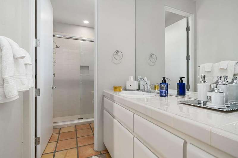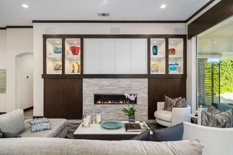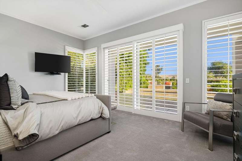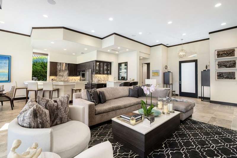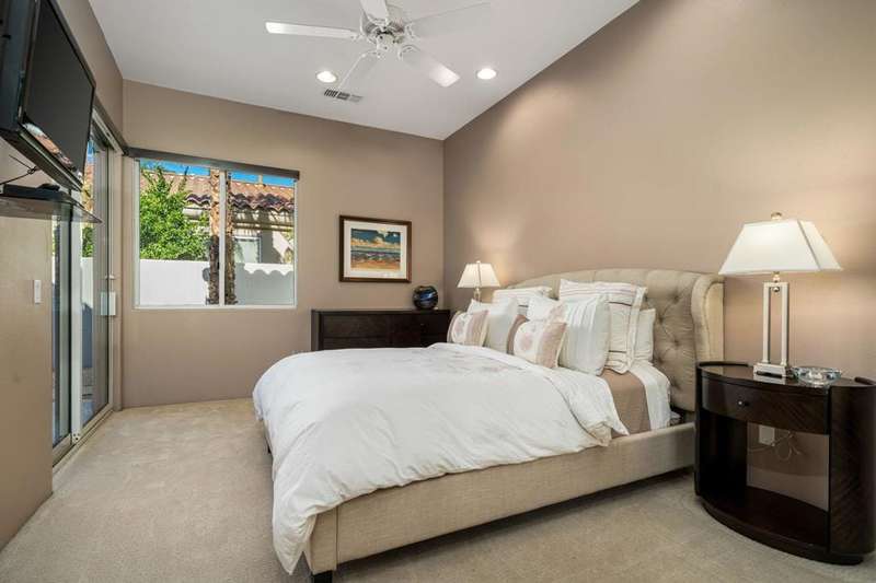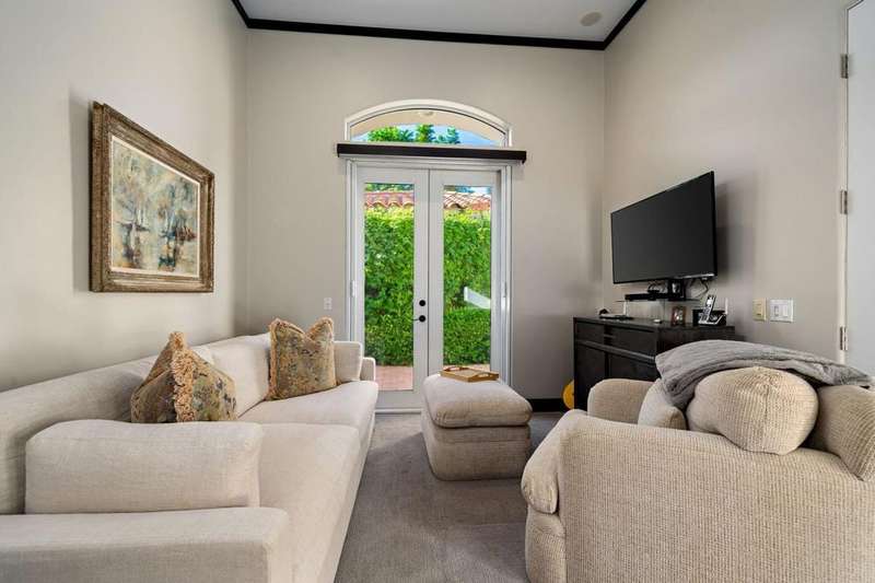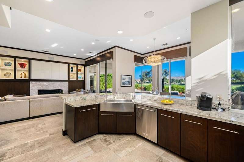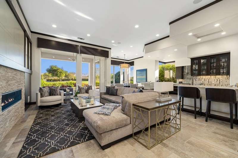 Stunning Contemporary Update of popular Legacy Open Great Room Floorplan with mountain, lake and fairway views and great outdoor living with lap pool. Enter a gated courtyard with outdoor living area and contemporary glass door entry. Open Great Room, Kitchen and Dining complete with entertainer's wet bar, fireplace and walls of glass with amazing views. Social Kitchen features quartz countertops, stainless appliances, counter seating and Dining area with views. Interiors by noted designer including custom tile flooring. Primary Suite features access to pool and spa terrace and more views together with updated spa bath with quartz and marble finishes. One guest suite in house featuring ensuite bath and a Detached Casita are perfect for friends and family. Den/Office with french doors to the courtyard can be a second guest bedroom in house with custom powder room nearby. Outside is a covered outdoor living room, pool and spa, updated expansive terraces with stone flooring, fire pit, bbq area and views of the mountains, fairways and lake. Legacy HOA includes Mission Hills Country Club social/fitness membership. Furniture Negotiable, so could be ready for a season in the sun - Come home to your desert retreat!