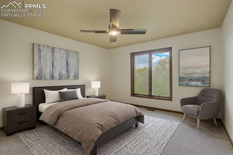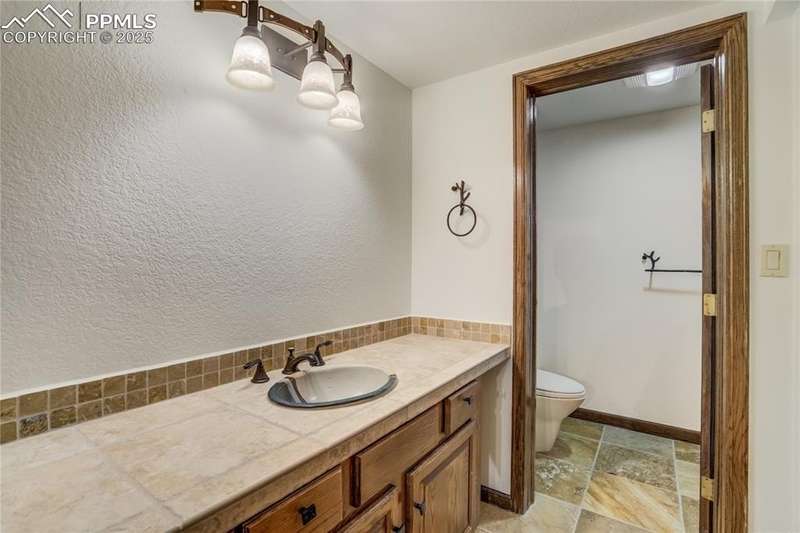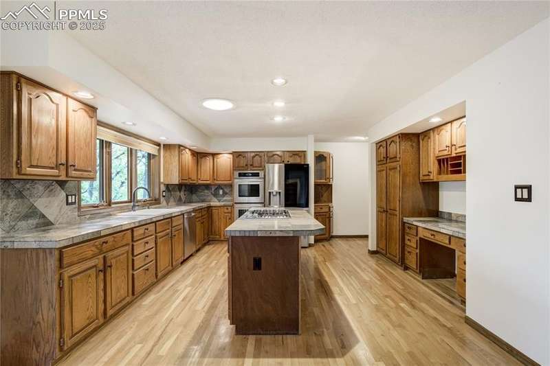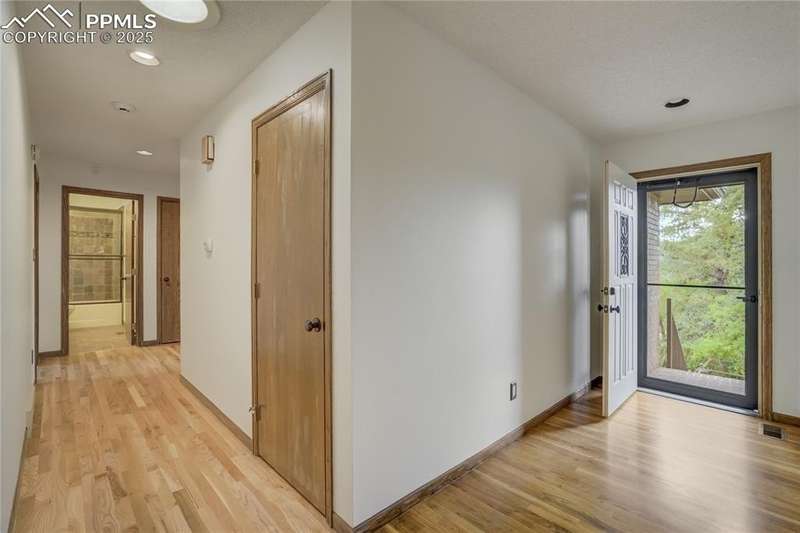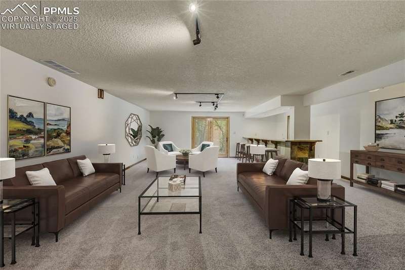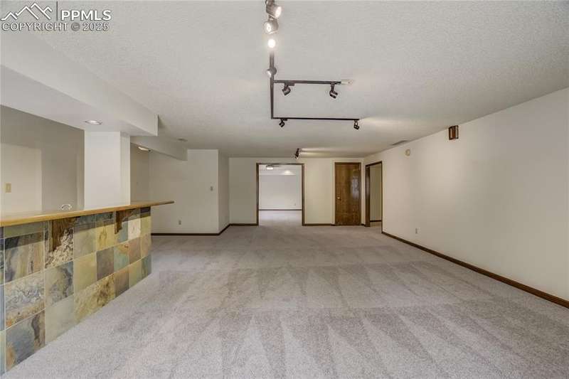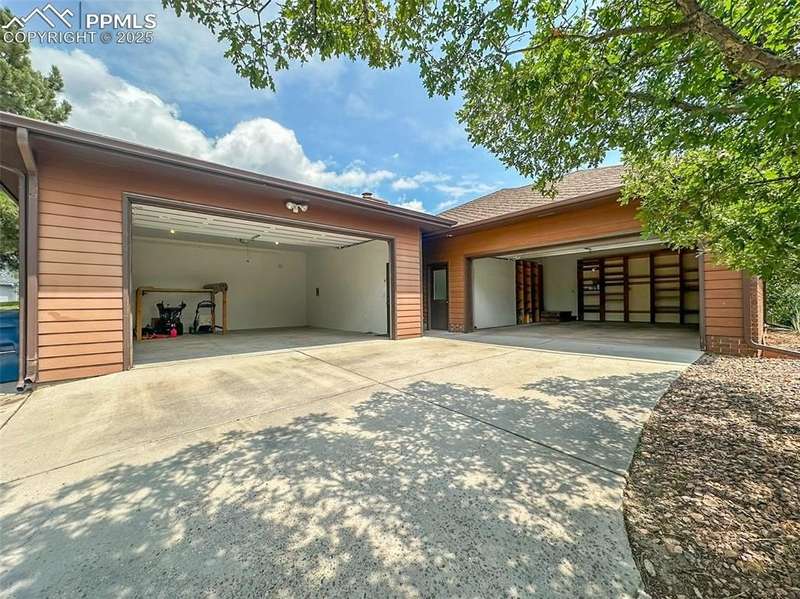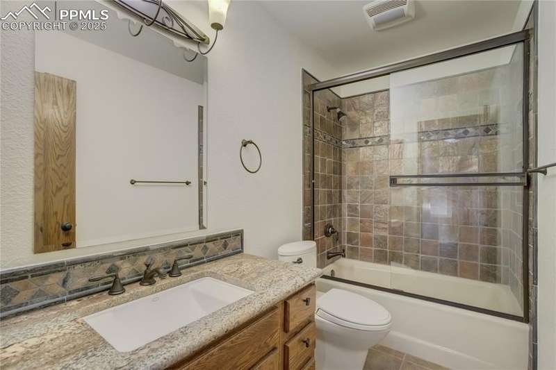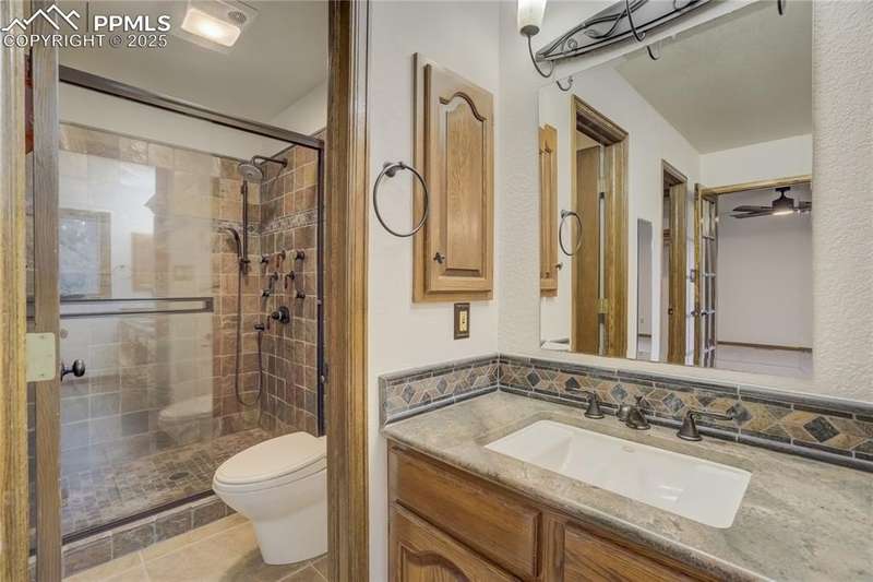 Set at the end of a quiet cul-de-sac in Gleneagle, this 1/2 acre property offers a rare balance of privacy, mtn views, & convenience—minutes to D-20 schools, parks, trails, shopping, & I-25. Extensive upgrades incl a new roof, gutters, exterior paint, interior paint, new carpet throughout & detached 2+car garage/workshop. Inside, hardwood floors guide you from the entry into the heart of the home. The formal living rm features a bay window framing the landscape, adj a flexible dining area that flows into the gourmet kitchen. Thoughtfully designed for both everyday function & entertaining, the kitchen boasts an island w/ breakfast bar, granite tile countertops, SS appliances including a double wall mounted ovens & gas range, pantry, built-in workstation, & a dining nook that walks out to the trex deck & backyard retreat. The backyard oasis features waterfall, mature trees, & new paver steps leading to the lower walk-out patio. The main-lvl great rm centers around a FP flanked by built-in bookshelves, new carpet, modern ceiling fan, & bump-out window enhancing the spacious feel. A nearby half bath features tile counters & a custom sink/vanity. Down the hall, the primary suite offers space to unwind w/ a large bedrm, walk-in closet, & luxury 5-piece bath complete w/ tile floors, standalone spa shower, soaking tub, granite counters, upgraded lighting, & ample storage. 2additional main-level bedrooms—one w/ hardwd flrs, one w/ a custom closet system, both share a full hallway bath w/ granite-topped vanity & tiled shower surround. The fully finished walk-out basement expands the possibilities, feat new paint & carpet, a wide-open rec rm w/ wet bar, multiple zones for media, gaming, or gym, & 2 spacious lower-lvl bedrms. One doubles as an office w/ a wall of built-ins & walk-in cedar-lined closet. The other is large enough to have a sitting area & easy access to a remodeled ¾ bath w/ tile shower. 4-car garage setup attached & detached spaces for workshop, toys, or storage.