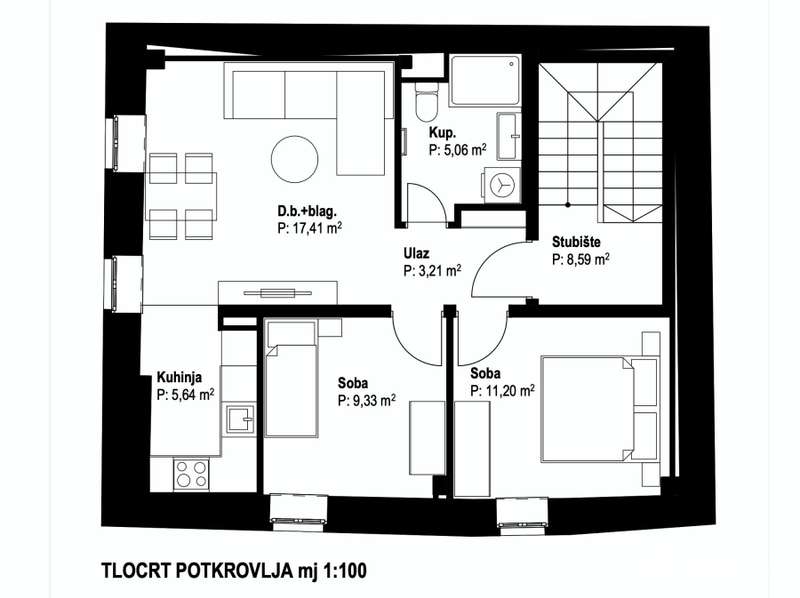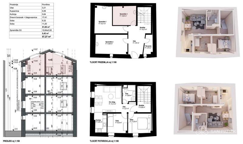 Apartment A-3 - 3rd floor (attic) - living area 51.85 m2 (2 bedrooms + 1 bathroom) + storage room S3 (10.84 m2); net accounting area 57.27 m2 = 217,626 EUR