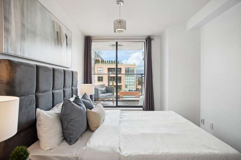 Welcome to Olive by Cressey, where Cambie Village meets Mount Pleasant. This bright, efficient open-concept home offers stunning Northern mountain & city views. The sought-after Cressey kitchen boasts solid wood cabinets, deep granite counters, stainless steel appliances, gas cooktop, wine fridge & full-sized fridge. Enjoy the cozy living room with electric fireplace, plus a spacious balcony spanning 19ft wide - accessible from both the living room & bedroom. CONCRETE construction, large windows, in-suite washer/dryer, 1 secured parking stall & storage locker are included. Prime location—steps from restaurants, cafés, shops, Heather & Douglas Parks, VGH, Broadway Skytrain. This is the urban lifestyle you've been waiting for!