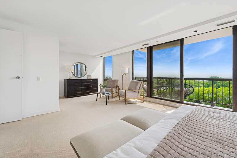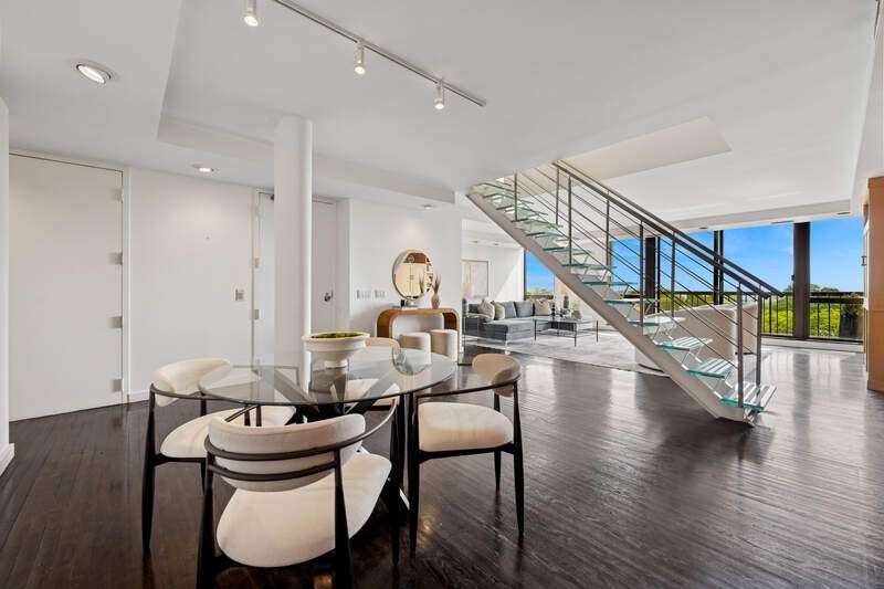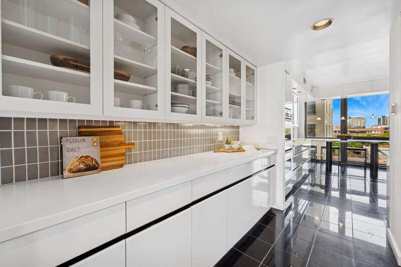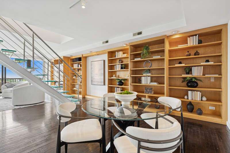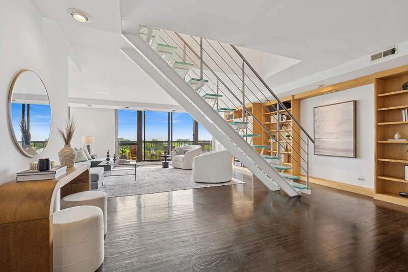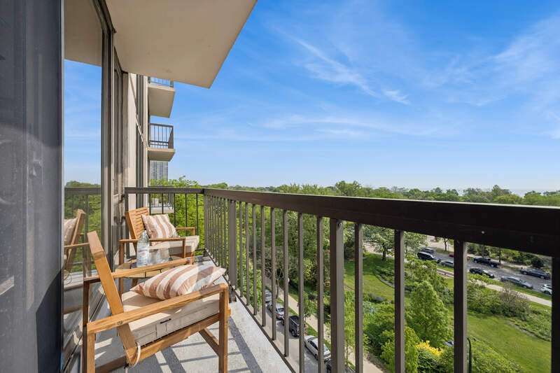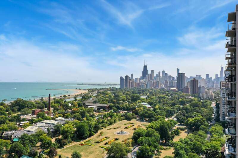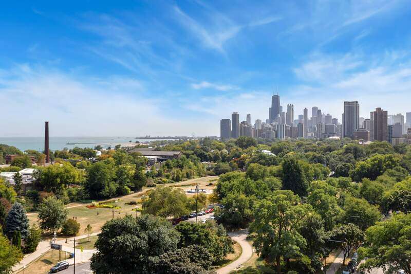Enjoy breathtaking, southeast-facing views of the city, park, and lake from this pristine and modern two-story residence at The Conservatory. The expertly designed floor plan keeps the public rooms on the main level and the bedrooms upstairs so that this 2273 SQFT condo lives more like a single-family home. Floor-to-ceiling windows welcome abundant natural light while sliding doors open to a 14 ft long terrace overlooking the Lincoln Park Conservatory with a skyline view to the south. The first-floor features hardwood flooring in the living and dining rooms along with elegant custom built-in bookshelves. Wired for surround sound, this home is the perfect place to entertain. A separate eat-in kitchen offers high end appliances, granite tile flooring, a pantry, and copious counter and cabinet space. A powder room and ample closet and storage space complete this level nicely. The floating glass staircase separates the living and dining rooms and leads upstairs to the private quarters. Comfortable and serene, the primary suite is bathed in natural light and enjoys its own private 14 ft long terrace, two walk-in closets, and an ensuite bath with Whirlpool tub, separate shower, and double sinks. Across the hall, a graciously sized guest suite offers west-facing views, a walk-in closet, and an ensuite bath. Two parking spaces (one garage and one exterior) are included in the price. Side-by-side W/D on each floor, shared with same-floor neighbor only. Ideally located in East Lincoln Park alongside parks, playgrounds, Lincoln Park Zoo, near the lake front, 5-star dining, shopping, and public transportation - this home has it all. Welcome home!